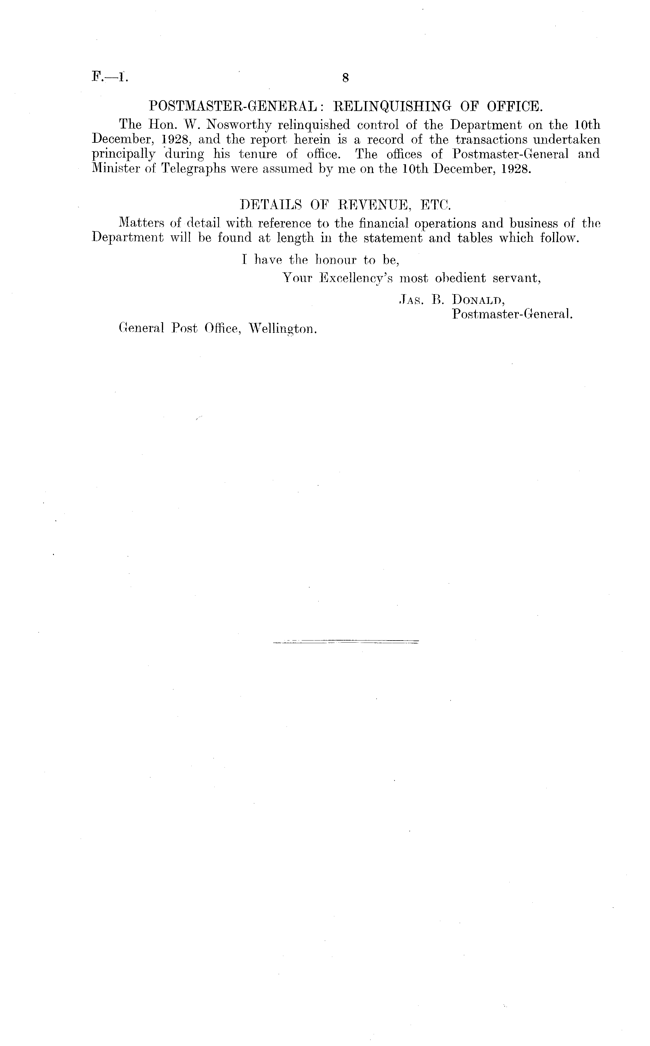 POSTMASTER-GENERAL: RELINQUISHING OF OFFICE. The Hon. W. Nosworthy relinquished control of the Department on the 10th December, 1928, and the report herein is a record of the transactions undertaken principally during his tenure of office. The offices of Postmaster-General and Minister of Telegraphs were assumed by me on the 10th December, 1928. DETAILS OF REVENUE, ETC. Matters of detail with reference to the financial operations and business of the Department will be found at length in the statement and tables which follow. I have the honour to be, Your Excellency's most obedient servant, Jas. B. Donald, Postmaster-General. General Post Office, Wellington.