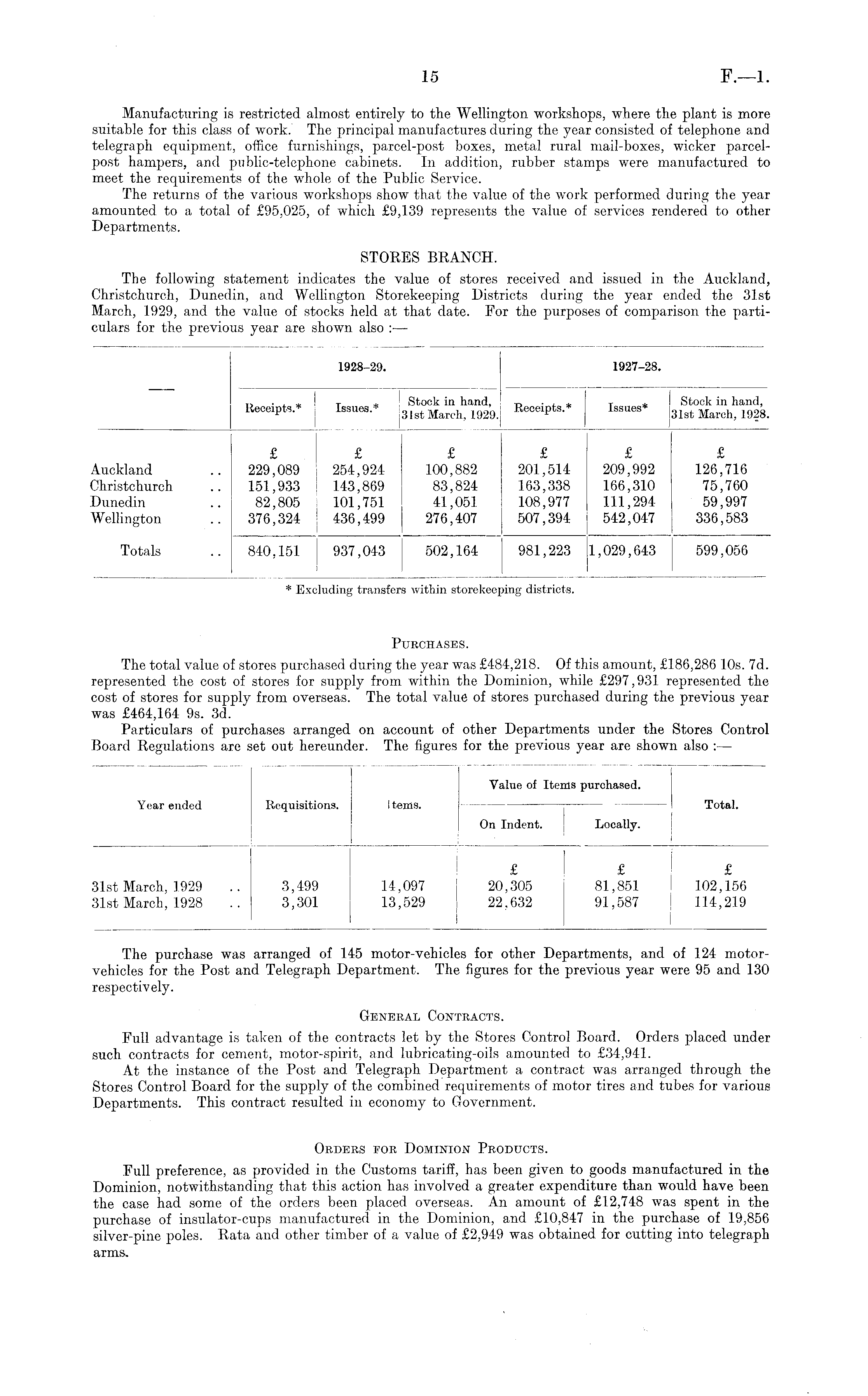 Manufacturing is restricted almost entirely to the Wellington workshops, where the plant is more suitable for this class of work. The principal manufactures during the year consisted of telephone and telegraph equipment, office furnishings, parcel-post boxes, metal rural mail-boxes, wicker parcelpost hampers, and public-telephone cabinets. In addition, rubber stamps were manufactured to meet the requirements of the whole of the Public Service. The returns of the various workshops show that the value of the work performed during the year amounted to a total of £95,025, of which £9,139 represents the value of services rendered to other Departments. STORES BRANCH. The following statement indicates the value of stores received and issued in the Auckland, Christchurch, Dunedin, and Wellington Storekeeping Districts during the year ended the 31st March, 1929, and the value of stocks held at that date. For the purposes of comparison the particulars for the previous year are shown also : —