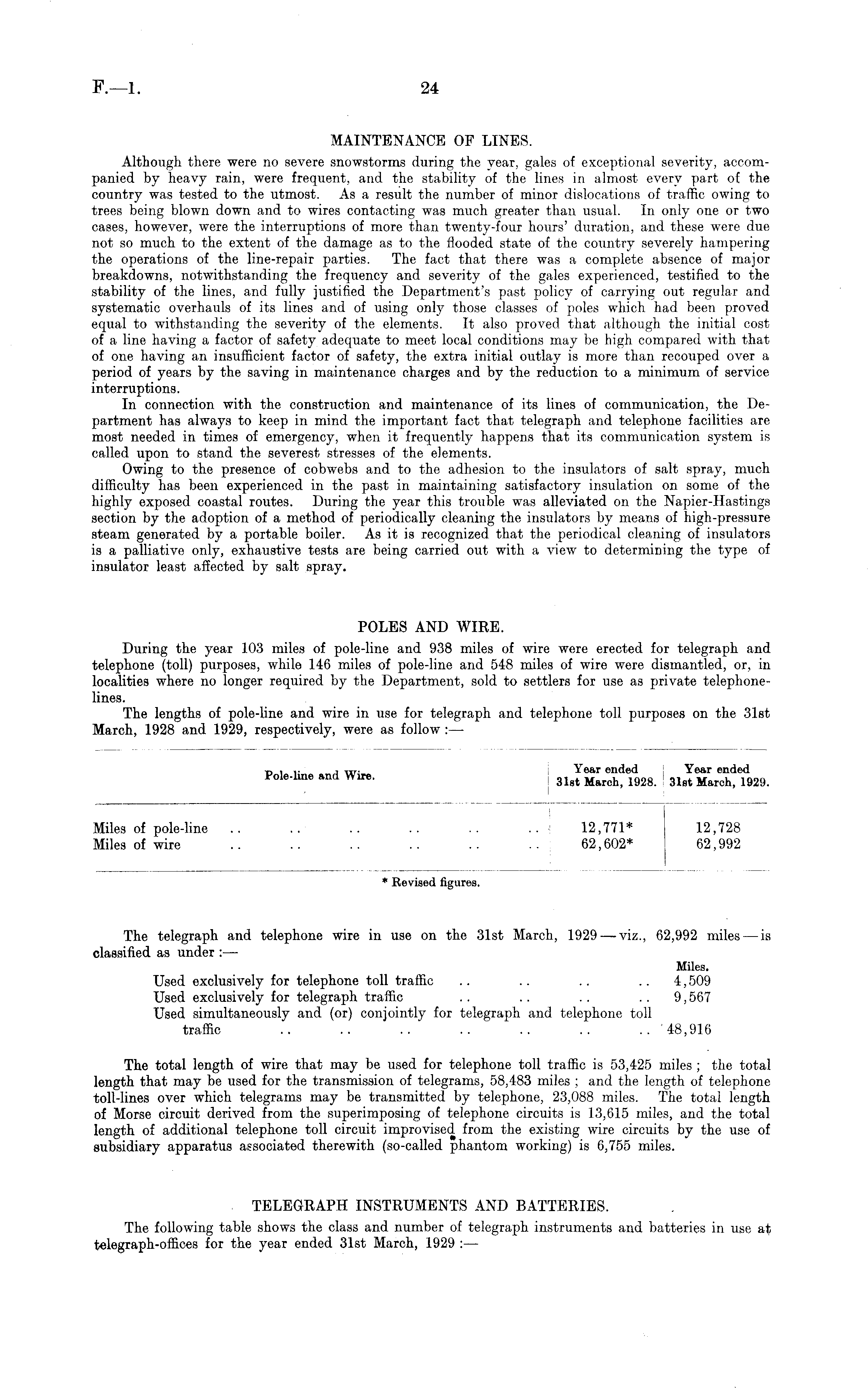 MAINTENANCE OF LINES. Although there were no severe snowstorms during the year, gales of exceptional severity, accompanied by heavy rain, were frequent, and the stability of the lines in almost every part of the country was tested to the utmost. As a result the number of minor dislocations of traffic owing to trees being blown down and to wires contacting was much greater than usual. In only one or two cases, however, were the interruptions of more than twenty-four hours' duration, and these were due not so much to the extent of the damage as to the flooded state of the country severely hampering the operations of the line-repair parties. The fact that there was a complete absence of major breakdowns, notwithstanding the frequency and severity of the gales experienced, testified to the stability of the lines, and fully justified the Department's past policy of carrying out regular and systematic overhauls of its lines and of using only those classes of poles which had been proved equal to withstanding the severity of the elements. It also proved that although the initial cost of a line having a factor of safety adequate to meet local conditions may be high compared with that of one having an insufficient factor of safety, the extra initial outlay is more than recouped over a period of years by the saving in maintenance charges and by the reduction to a minimum of service interruptions. In connection with the construction and maintenance of its lines of communication, the Department has always to keep in mind the important fact that telegraph and telephone facilities are most needed in times of emergency, when it frequently happens that its communication system is called upon to stand the severest stresses of the elements. Owing to the presence of cobwebs and to the adhesion to the insulators of salt spray, much difficulty has been experienced in the past in maintaining satisfactory insulation on some of the highly exposed coastal routes. During the year this trouble was alleviated on the Napier-Hastings section by the adoption of a method of periodically cleaning the insulators by means of high-pressure steam generated by a portable boiler. As it is recognized that the periodical cleaning of insulators is a palliative only, exhaustive tests are being carried out with a view to determining the type of insulator least affected by salt spray. POLES AND WIRE. During the year 103 miles of pole-line and 938 miles of wire were erected for telegraph and telephone (toll) purposes, while 146 miles of pole-line and 548 miles of wire were dismantled, or, in localities where no longer required by the Department, sold to settlers for use as private telephonelines. The lengths of pole-line and wire in use for telegraph and telephone toll purposes on the 31st March, 1928 and 1929, respectively, were as follow : —