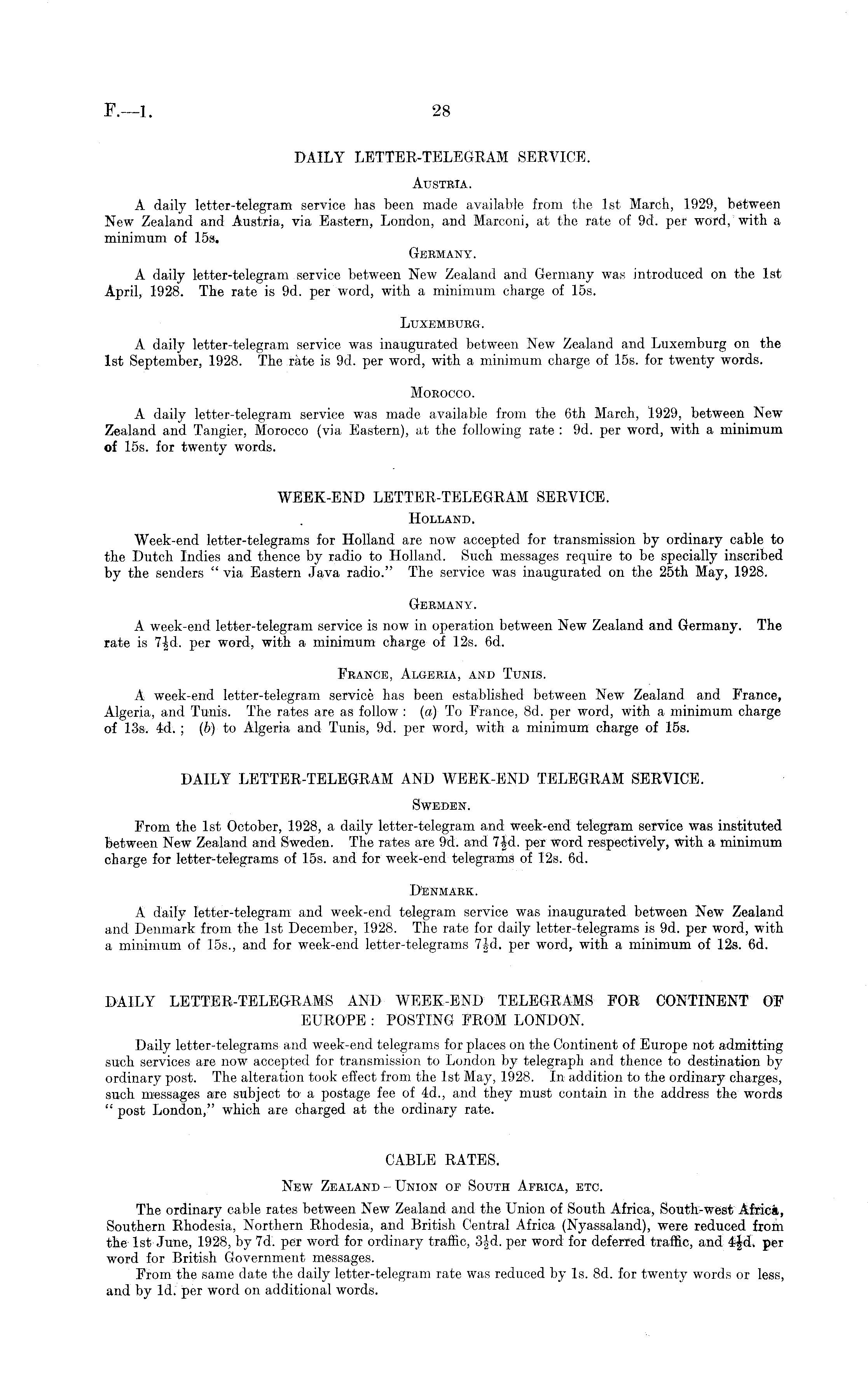 DAILY LETTER-TELEGRAM SERVICE. Austria. A daily letter-telegram service has been made available from the Ist March, 1929, between New Zealand and Austria, via Eastern, London, and Marconi, at the rate of 9d. per word, with a minimum of 15s. Germany. A daily letter-telegram service between New Zealand and Germany was introduced on the Ist April, 1928. The rate is 9d. per word, with a minimum charge of 15s. Luxemburg. A daily letter-telegram service was inaugurated between New Zealand and Luxemburg on the Ist September, 1928. The rate is 9d. per word, with a minimum charge of 15s. for twenty words. Morocco. A daily letter-telegram service was made available from the 6th March, 1929, between New Zealand and Tangier, Morocco (via Eastern), at the following rate : 9d. per word, with a minimum of 15s. for twenty words. WEEK-END LETTER-TELEGRAM SERVICE. Holland. Week-end letter-telegrams for Holland are now accepted for transmission by ordinary cable to the Dutch Indies and thence by radio to Holland. Such messages require to be specially inscribed by the senders " via Eastern Java radio." The service was inaugurated on the 25th May, 1928. Germany. A week-end letter-telegram service is now in operation between New Zealand and Germany. The rate is per word, with a minimum charge of 12s. 6d. France, Algeria, and Tunis. A week-end letter-telegram service has been established between New Zealand and France, Algeria, and Tunis. The rates are as follow : (a) To France, Bd. per word, with a minimum charge of 13s. 4d. ; (b) to Algeria and Tunis, 9d. per word, with a minimum charge of 15s. DAILY LETTER-TELEGRAM AND WEEK-END TELEGRAM SERVICE. Sweden. From the Ist October, 1928, a daily letter-telegram and week-end telegram service was instituted between New Zealand and Sweden. The rates are 9d. and 7§d. per word respectively, with a minimum charge for letter-telegrams of 15s. and for week-end telegrams of 12s. 6d. Denmark. A daily letter-telegram and week-end telegram service was inaugurated between New Zealand and Denmark from the Ist December, 1928. The rate for daily letter-telegrams is 9d. per word, with a minimum of 155., and for week-end letter-telegrams 7Jd. per word, with a minimum of 12s. 6d. DAILY LETTER-TELEGRAMS AND WEEK-END TELEGRAMS FOR CONTINENT OF EUROPE : POSTING FROM LONDON. Daily letter-telegrams and week-end telegrams for places on the Continent of Europe not admitting such services are now accepted for transmission to London by telegraph and thence to destination by ordinary post. The alteration took effect from the Ist May, 1928. In addition to the ordinary charges, such messages are subject to 1 a postage fee of 4d., and they must contain in the address the words " post London," which are charged at the ordinary rate. CABLE RATES. New Zealand - Union of South Africa, etc. The ordinary cable rates between New Zealand and the Union of South Africa, South-west Africa, Southern Rhodesia, Northern Rhodesia, and British Central Africa (Nyassaland), were reduced from the Ist June, 1928, by 7d. per word for ordinary traffic, 3fd. per word for deferred traffic, and 4§d, per word for British Government messages. From the same date the daily letter-telegram rate was reduced by Is. Bd. for twenty words or less, and by Id. per word on additional words.