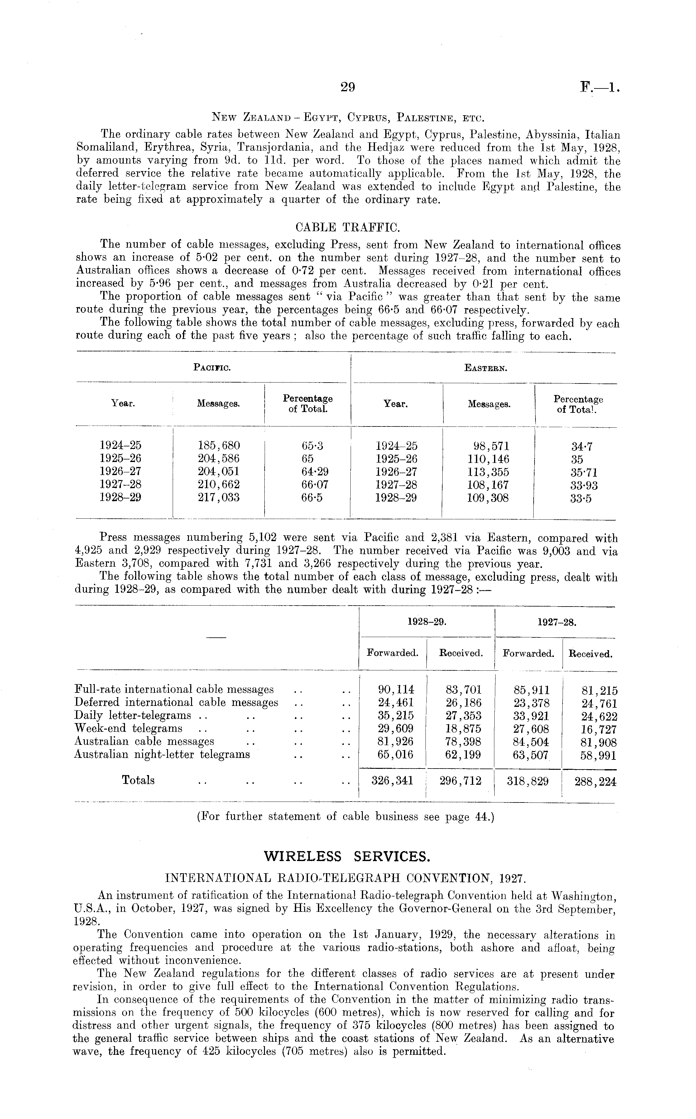New Zealand - Egypt, Cypbus, Palestine, etc. The ordinary cable rates between New Zealand and Egypt, Cyprus, Palestine, Abyssinia, Italian Somaliland, Erythrea, Syria, Transjordania, and the Hedjaz were reduced from the Ist May, 1928, by amounts varying from 9d. to lid. per word. To those of the places named which admit the deferred service the relative rate became automatically applicable. From the Ist May, 1928, the daily letter-telegram service from New Zealand was extended to include Egypt and Palestine, the rate being fixed at approximately a quarter of the ordinary rate. CABLE TRAFFIC. The number of cable messages, excluding Press, sent from New Zealand to international offices shows an increase of 5-02 per cent, on the number sent during 1927-28, and the number sent to Australian offices shows a decrease of 0-72 per cent. Messages received from international offices increased by 5-96 per cent., and messages from Australia decreased by 0-21 per cent. The proportion of cable messages sent " via Pacific " was greater than that sent by the same route during the previous year, the percentages being 66-5 and 66-07 respectively. The following table shows the total number of cable messages, excluding press, forwarded by each route during each of the past five years ; also the percentage of such traffic falling to each.