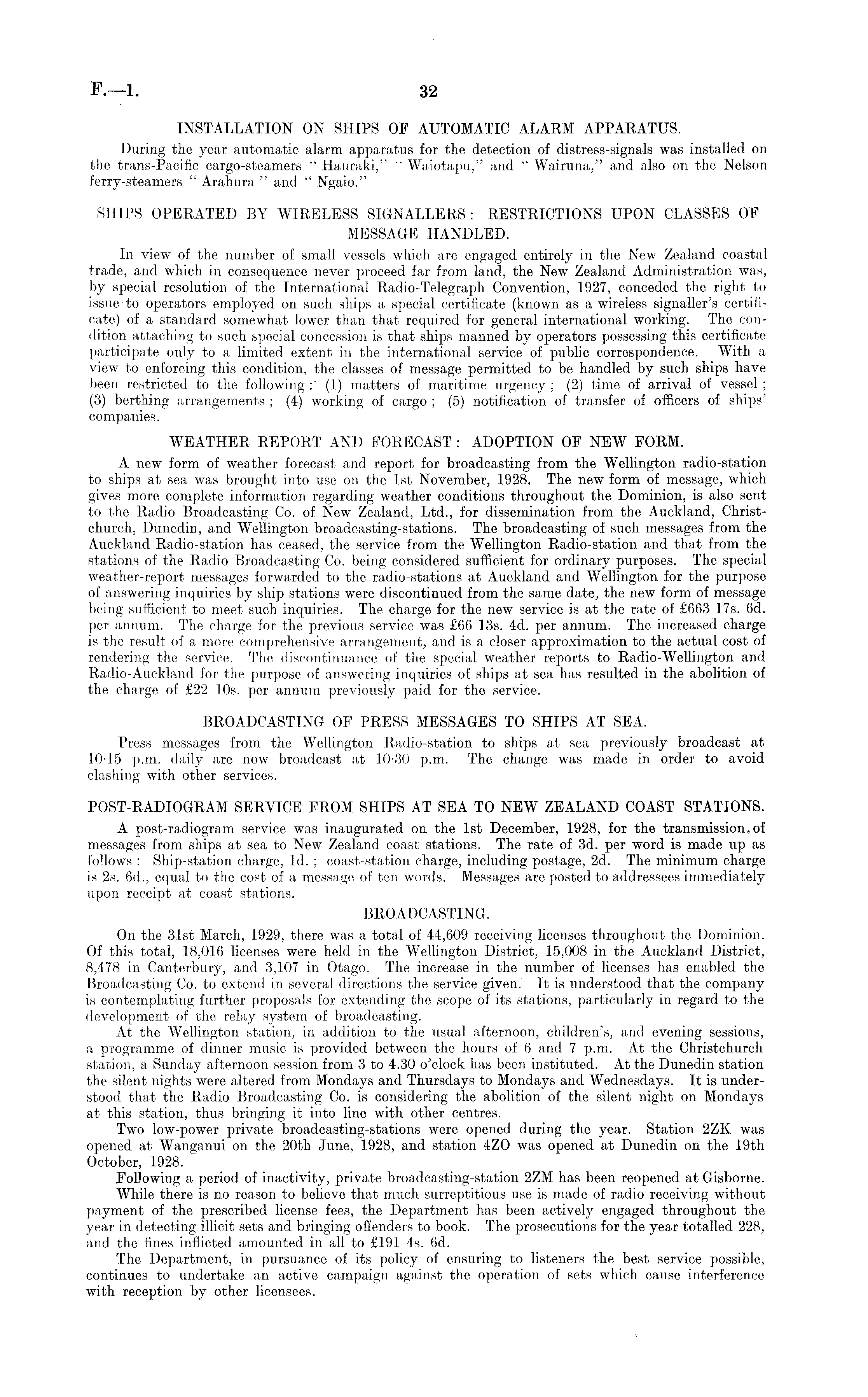INSTALLATION ON SHIPS OF AUTOMATIC ALARM APPARATUS. During the year automatic alarm apparatus for the detection of distress-signals was installed on the trans-Pacific cargo-steamers " Hauraki," " Waiotapu," and " Wairuna," and also on the Nelson ferry-steamers " Arahura " and " Ngaio." SHIPS OPERATED BY WIRELESS SIGNALLERS: RESTRICTIONS UPON CLASSES OF MESSAGE HANDLED. In view of the number of small vessels which are engaged entirely in the New Zealand coastal trade, and which in consequence never proceed far from land, the New Zealand Administration was, by special resolution of the International Radio-Telegraph Convention, 1927, conceded the right to issue to operators employed on such ships a special certificate (known as a wireless signaller's certificate) of a standard somewhat lower than that required for general international working. The condition attaching to such special concession is that ships manned by operators possessing this certificate participate only to a limited extent in the international service of public correspondence. With a view to enforcing this condition, the classes of message permitted to be handled by such ships have been restricted to the following:' (1) matters of maritime urgency; (2) time of arrival of vessel; (3) berthing arrangements ; (4) working of cargo ; (5) notification of transfer of officers of ships' companies. WEATHER REPORT AND FORECAST : ADOPTION OF NEW FORM. A new form of weather forecast and report for broadcasting from the Wellington radio-station to ships at sea was brought into use on the Ist November, 1928. The new form of message, which gives more complete information regarding weather conditions throughout the Dominion, is also sent to the Radio Broadcasting Co. of New Zealand, Ltd., for dissemination from the Auckland, Christchurch, Dunedin, and Wellington broadcasting-stations. The broadcasting of such messages from the Auckland Radio-station has ceased, the service from the Wellington Radio-station and that from the stations of the Radio Broadcasting Co. being considered sufficient for ordinary purposes. The special weather-report messages forwarded to the radio-stations at Auckland and Wellington for the purpose of answering inquiries by ship stations were discontinued from the same date, the new form of message being sufficient to meet such inquiries. The charge for the new service is at the rate of £663 17s. 6d. per annum. The charge for the previous service was £66 13s. 4d. per annum. The increased charge is the result of a more comprehensive arrangement, and is a closer approximation to the actual cost of rendering the service. The discontinuance of the special weather reports to Radio-Wellington and Radio-Auckland for the purpose of answering inquiries of ships at sea has resulted in the abolition of the charge of £22 10s. per annum previously paid for the service. BROADCASTING OF PRESS MESSAGES TO SHIPS AT SEA. Press messages from the Wellington Radio-station to ships at sea previously broadcast at 10-15 p.m. daily are now broadcast at 10-30 p.m. The change was made in order to avoid clashing with other services. POST-RADIOGRAM SERVICE FROM SHIPS AT SEA TO NEW ZEALAND COAST STATIONS. A post-radiogram service was inaugurated on the Ist December, 1928, for the transmission. of messages from ships at sea to New Zealand coast stations. The rate of 3d. per word is made up as follows : Ship-station charge, Id. ; coast-station charge, including postage, 2d. The minimum charge is 2s. 6d., equal to the cost of a message of ten words. Messages are posted to addressees immediately upon receipt at coast stations. BROADCASTING. On the 31st March, 1929, there was a total of 44,609 receiving licenses throughout the Dominion. Of this total, 18,016 licenses were held in the Wellington District, 15,008 in the Auckland District, 8,478 in Canterbury, and 3,107 in Otago. The increase in the number of licenses has enabled the Broadcasting Co. to extend in several directions the service given. It is understood that the company is contemplating further proposals for extending the scope of its stations, particularly in regard to the development of the relay system of broadcasting. At the Wellington station, in addition to the usual afternoon, children's, and evening sessions, a programme of dinner music is provided between the hours of 6 and 7 p.m. At the Christchurch station, a Sunday afternoon session from 3to 4.30 o'clock has been instituted. At the Dunedin station the silent nights were altered from Mondays and Thursdays to Mondays and Wednesdays. It is understood that the Radio Broadcasting Co. is considering the abolition of the silent night on Mondays at this station, thus bringing it into line with other centres. Two low-power private broadcasting-stations were opened during the year. Station 2ZK was opened at Wanganui on the 20th June, 1928, and station 4ZO was opened at Dunedin on the 19th October, 1928. Following a period of inactivity, private broadcasting-station 2ZM has been reopened at Gisborne. While there is no reason to believe that much surreptitious use is made of radio receiving without payment of the prescribed license fees, the Department has been actively engaged throughout the year in detecting illicit sets and bringing offenders to book. The prosecutions for the year totalled 228, and the fines inflicted amounted in all to £191 4s. 6d. The Department, in pursuance of its policy of ensuring to listeners the best service possible, continues to undertake an active campaign against the operation of sets which cause interference with reception by other licensees.