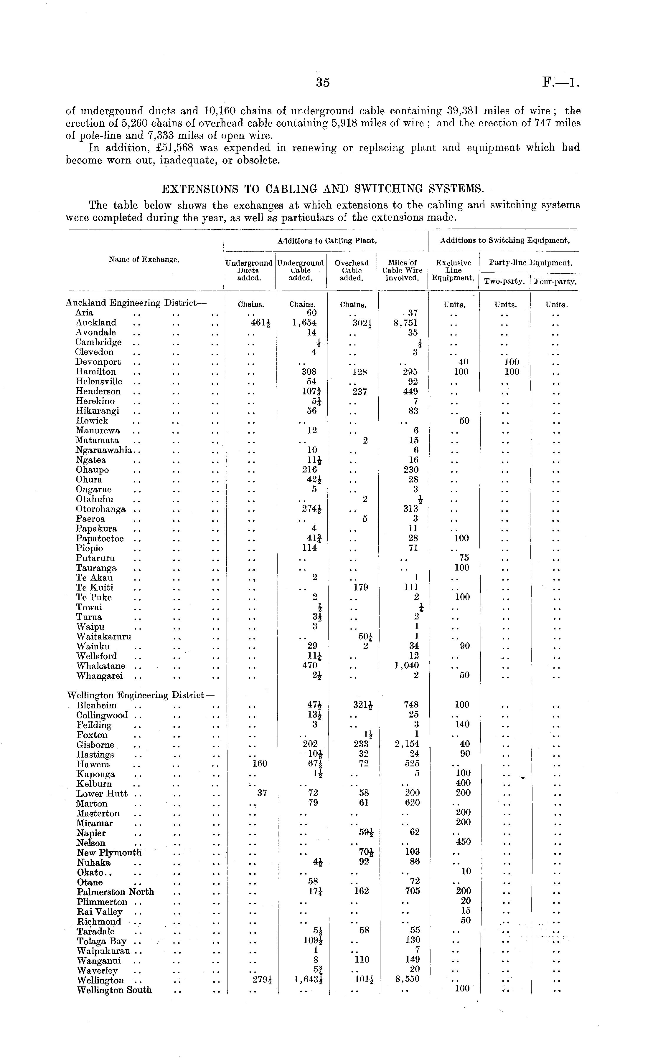 Additions to Cabling Plant. Additions to Switching Equipment. Name of Exchange. Underground Underground Overhead Miles of Exclusive Party-line Equipment. Ducts Cable Cable Cable Wire Line added. added. added. involved. Equipment. Tw0 . party . I Four-party. Auckland Engineering District— Chains. Chains. Chains. Units. Units. 1 Units. Aria .. .. .. .. 60 .. 37 .. .. , Auckland .. .. .. 461J 1,654 302J 8,751 Avondale .. .. .. .. 14 .. 35 .. Cambridge .. .. .. .. \ .. J .. .... Clevedon .. .. .. .. 4 .. 3 .. .. Devonport .. .. .. .. .. .. .. i 40 100 Hamilton .. .. .. .. 308 128 295 100 100 Helensville .. .. .. .. 54 .. 92 .. .. I .. Henderson .. .. .. .. 107J 237 449 .. .. j Herekino .. .. .. .. 5f .. 7 Hikurangi .. .. .. .. 56 .. 83 Howick .. .. .. .. .. .. .. 50 Manurewa .. .. .. .. 12 .. 6 Matamata .. .. .. .. .. 2 15 .. ! Ngaruawahia.. .. .. .. 10 .. 6 .. .. .. Ngatea .. .. .. .. 11£ .. 16 .. j Ohaupo .. .. .. .. 216 .. 230 Ohura .. .. .. .. 42J .. 28 .. j Ongarue .. .. .. .. 5 .. 3 .. .... Otahuhu .. .. .. .. .. 2 £ .. Otorohanga .. .. .. .. 274J .. 313 .. .. ! Paeroa .. .. .. .. .. 5 3 .. j Papakura .. .. .. .. 4 .. 11 Papatoetoe .. .. .. .. 41f .. 28 100 Piopio .. .. .. .. 114 .. 71 Putaruru .. .. .. .. .. .. .. 75 Tauranga .. .. .. ... .. .. .. 100 Xe Akau .. .. .. ., 2 .. 1 TeKuiti .. .. .. .. .. 179 111 TePuke .. .. .. .. 2 .. 2 100 Towai .. .. .. .. i .. £ Turua .. .. .. .. 3 j .. 2 Waipu .. .. .. .. 3 .. 1 Waitakaruru ... .. .. .. 50£ 1 Waiuku .. .. .. .. 29 2 34 90 Wellsford .. .. .. .. 11J .. 12 Whakatane .. .. .. .. 470 .. 1,040 Whangarei .. .. .. .. 2J .. 2 50 Wellington Engineering District — Blenheim .. .. .. .. 47£ 321£ 748 100 Collingwood .. .. .. .. 13£ .. 25 Feilding .. .. .. .. 3 .. 3 140 Poxton .. .. .. .. .. 1| 1 Gisborne. .. .. .. .. 202 233 2,154 40 Hastings .. .. .. ■. 10£ 32 24 90 .... Hawera .. .. .. 160 67£ 72 525 .. .. Kaponga .. .. .. .. 1| .. 5 100 • • » Kelburn .. .. .. >. .. .. • • 400 Lower Hutt .. .. .. 37 72 58 200 200 Marton .. .. .. .. 79 61 620 .. Masterton .. .. .. .. .. .. .. 200 Miramar .. .. .. .. .. .. . ■ 200 Napier .. .. .. .. . • 59J 62 Nelson .. .. .. .. .. • • ■ • 450 New Plymouth .. .. .. .. 70J 103 Nuhaka .. .. .. .. 4J 92 86 Okato.. .. .. .. .. . ■ •• •• 10 Otane .. .. .. .. 58 .. 72 Palmerston North .. .. .. 17J 162 705 200 Plimmerton .. .. .. .. .. .. •. 20 Rai Valley .. .. .. .. .. ■ • • • 10 Richmond .. .. .. .. .. •. • • 50 .. Taradale .. .. .. .. 5| 58 55 Tolaga Bay .. .. .. .. 109J .. 130 .. .. Waipukurau .. .. .. .. 1 .. 7 Wanganui .. .. .. 8 110 149 Waverley .. .. .. .. 5f .. 20 Wellington .. .. .. 101£ 8,550 Wellington South .. .. .. .. .. • • 100