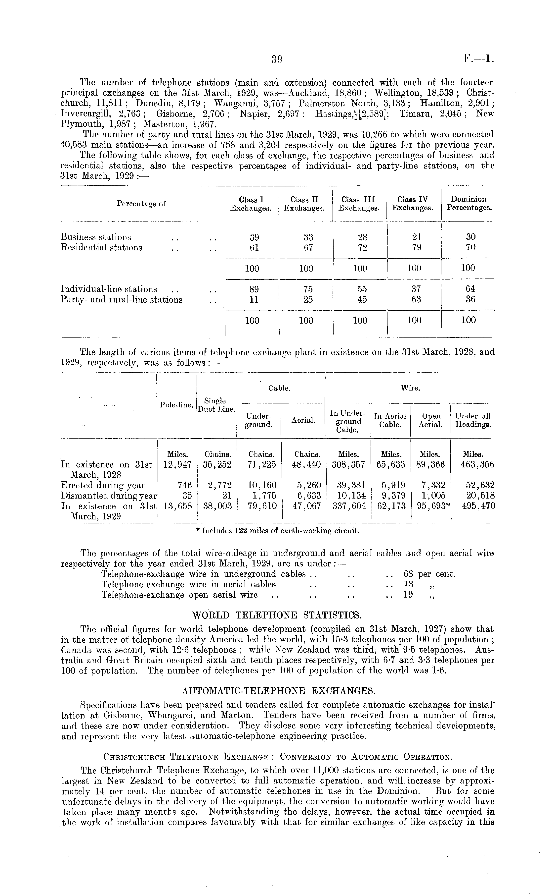 The number of telephone stations (main and extension) connected with each of the fourteen principal exchanges on the 31st March, 1929, was —Auckland, 18,860; Wellington, 18,539 ; Christchurch, 11,811 ; Dunedin, 8,179 ; Wanganui, 3,757 ; Palmerston North, 3,133 ; Hamilton, 2,901; Invercargi.ll, 2,763; Gisborne, 2,706; Napier, 2,697; Hastings,^[2,sB9"; Timaru, 2,045; New Plymouth, 1,987 ; Masterton, 1,967. The number of party and rural lines on the 31st March, 1929, was 10,266 to which were connected 40,583 main stations —an increase of 758 and 3,204 respectively on the figures for the previous year. The following table shows, for each class of exchange, the respective percentages of business and residential stations, also the respective percentages of individual- and party-line stations, on the 31st March, 1929