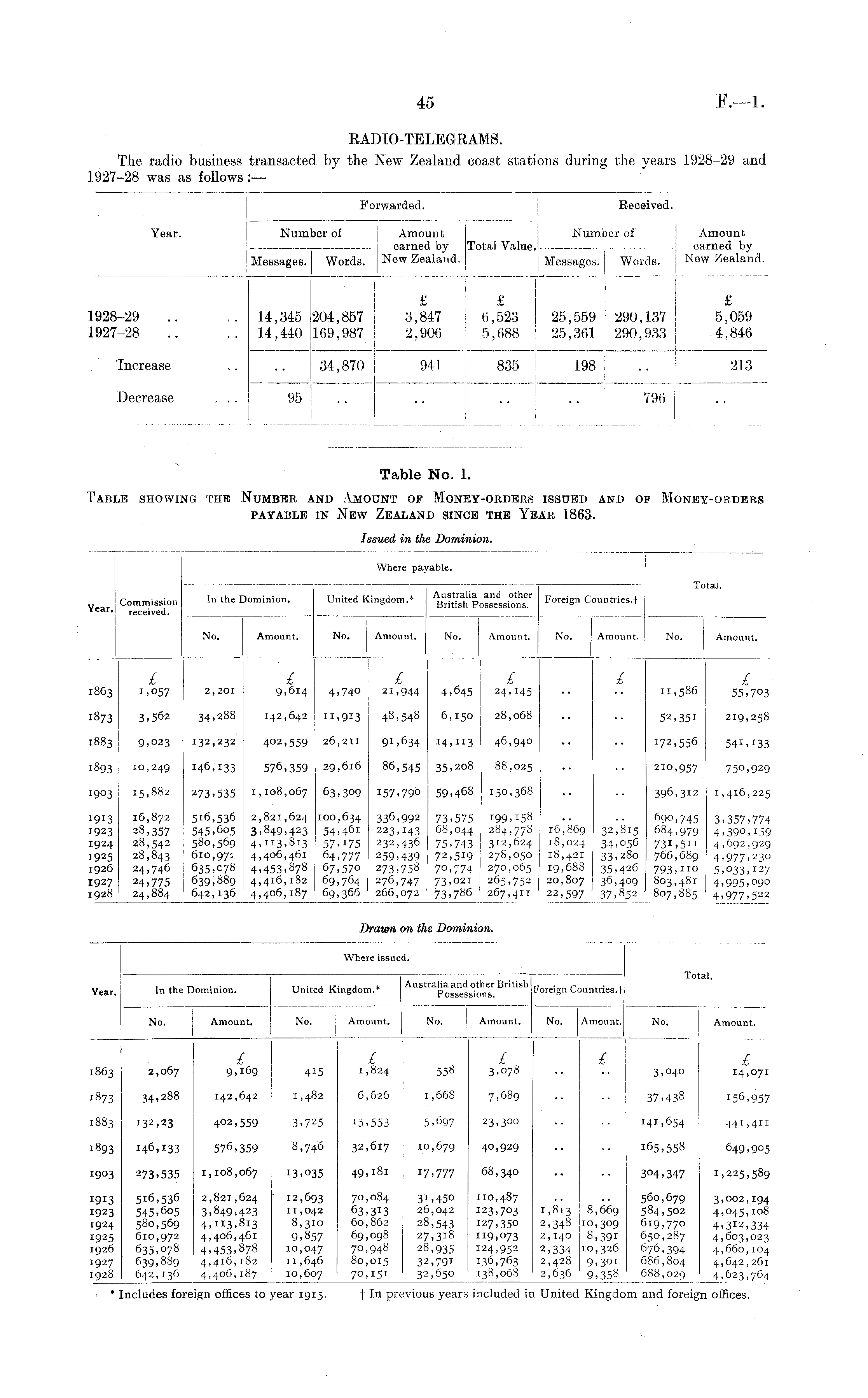 Forwarded. Received. Year. i Number of j Amount Number of Amount j earned by Total ValueJ 1 earned by Messages. Words. New Zealand. Messages, j Words. New Zealand. £ £ £ 1928-29 .. .. 14,345 204,857 3,847 6,523 25,559 290,137 5,059 1927-28 .. .. 14,440 169,987 2,906 5,688 25,361 j 290,933 4,846 'Increase .. .. 34,870 941 835 198 .. 213 Decrease .. 95 .. .. .. .. 796 I I