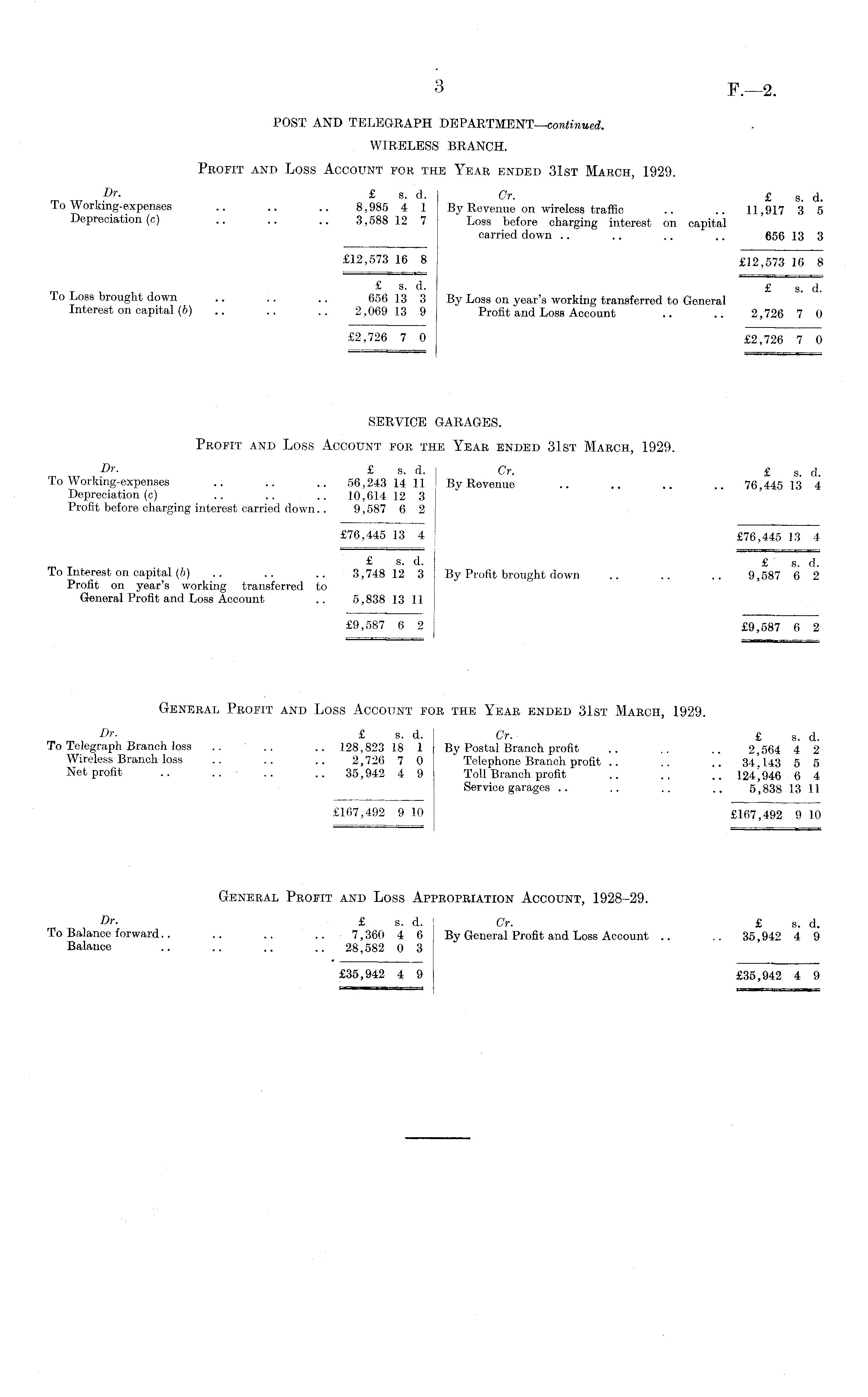 POST AND TELEGRAPH DEPARTMENT— continued. WIRELESS BRANCH. Pkopit and Loss Account foe the Year ended 31st Maech, 1929. P r - £ s - Or. £ a. d. To Working-expenses .. .. .. 8,985 4 1 By Revenue on wireless traffic .. .. 11,917 3 5 Depreciation (c) .. .. .. 3,588 12 7 Loss before charging interest on capital carried down .. .. .. .. 656 13 3 £12,573 16 8 £12,573 16 8 _ £ s. d. £ s. d. To Loss brought down .. .. .. 656 13 3 By Loss on year's working transferred to General Interest on capital (6) .. .. .. 2,069 13 9 Profit and Loss Account .. .. 2,726 7 0 £2,726 7 0 £2,726 7 0 SERVICE GARAGES. Peofit and Loss Account foe the Year ended 31st Maech, 1929. Dr. £ s. d. Cr. £ s. d To Working-expenses .. .. .. 56,243 14 11 By Revenue .. .. .. .. 76,445 13 4 Depreciation (c) .. .. .. 10,614 12 3 Profit before charging interest carried down.. 9,587 6 2 £76,445 13 4 £76,445 13 4 m T £ s. d. £ s. d. To Interest on capital (6) .. .. .. 3,748 12 3 By Profit brought down .. .. .. 9,587 6 2 Profit on year's working transferred to General Profit and Loss Account .. 5,838 13 11 £9,587 6 2 £9,587 6 2 General Profit and Loss Account for the Year ended 31st Maech, 1929. Dr. £ s. d. Cr. £ s . d. To Telegraph Branch loss .. .. .. 128,823 18 1 By Postal Branch profit .. .. .. 2,564 4 2 Wireless Branch loss .. .. .. 2,726 7 0 Telephone Branch profit .. .. .. 34.143 5 5 Net profit .. .. .. .. 35,942 4 9 Toll Branch profit .. .. .. 124,946 6 4 Service garages .. .. .. .. 5,838 13 11 £167,492 9 10 £167,492 9 10 General Profit and Loss Appropriation Account, 1928-29. Dr ■ £ s. d. Cr. £ s. d. To Balance forward.. .. .. .. 7,360 4 6 By General Profit and Loss Account .. .. 35,942 4 9 Balance .. .. .. .. 28,582 0 3 £35,942 4 9 £35,942 4 9