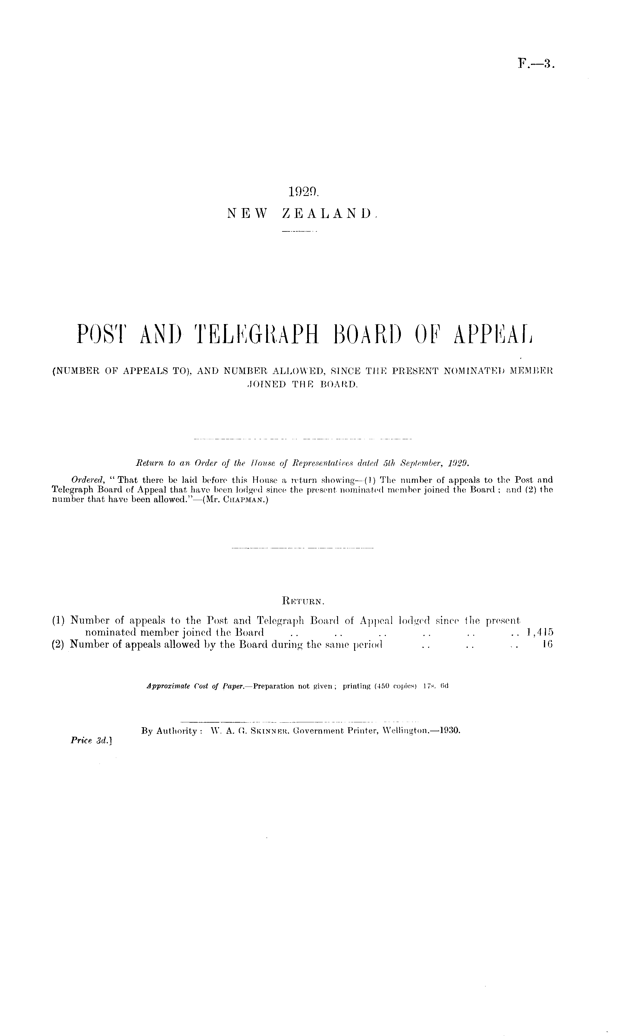 Return to an Order of the Bouse of Representatives dated sth September, 1929. Ordered, "That there be laid before this House a return showing—(l) The number of appeals to the Post and Telegraph Board of Appeal that have been lodged since the present nominated member joined the Board ; and (2) the number that have been allowed." —(Mr. Chapman.)