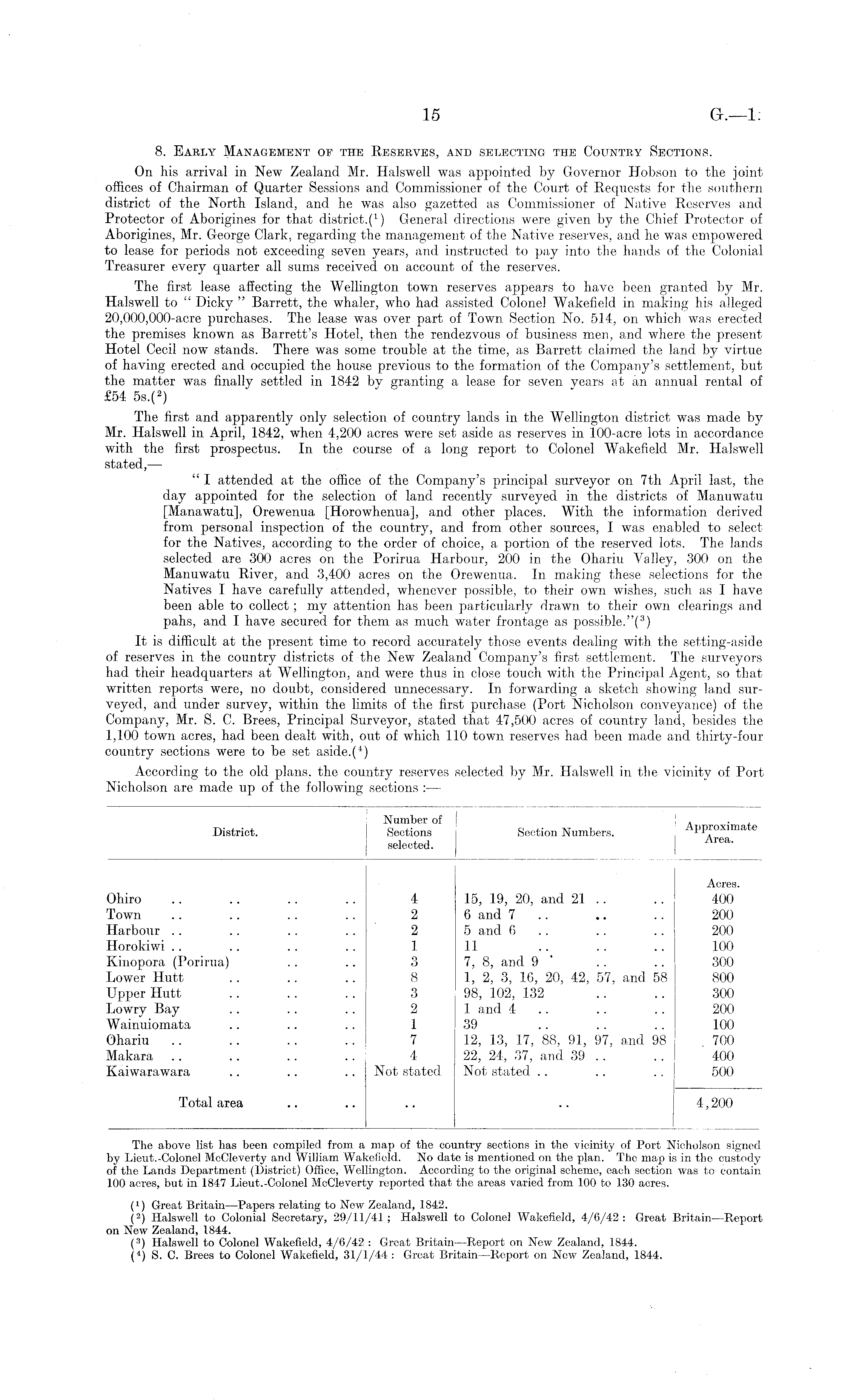The above list has been compiled from a map of the country sections in the vicinity of Port Nicholson signed by Lieut.-Colonel McCleverty and William Wakefield. No date is mentioned on the plan. The map is in the custody of the Lands Department (District) Office, Wellington. According to the original scheme, each section was to contain 100 acres, but in 1847 Lieut.-Colonel McCleverty reported that the areas varied from 100 to 130 acres. (!) Great Britain —Papers relating to New Zealand, 1842. ( 2 ) Halswell to Colonial Secretary, 29/11/41; Halswell to Colonel Wakefield, 4/6/42: Great Britain—Report on New Zealand, 1844. ( 3 ) Halswell to Colonel Wakefield, 4/6/42 : Great Britain —Report on New Zealand, 1844. ( 4 ) S. C. Brees to Colonel Wakefield, 31/1/44 : Great Britain —Report on New Zealand, 1844.