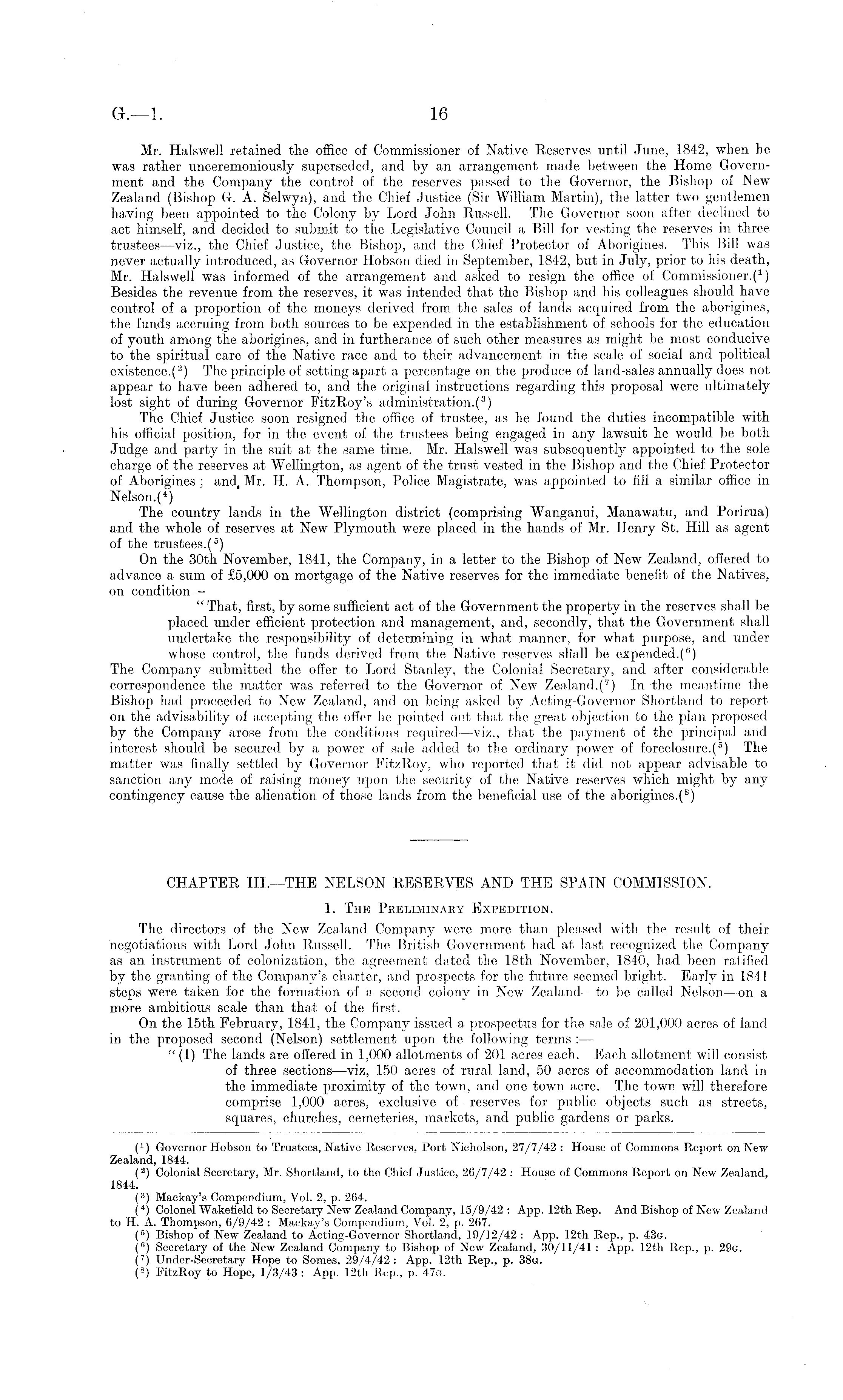 (') Governor Hobson to Trustees, Native Reserves, Port Nicholson, 27/7/42 : House of Commons Report on New Zealand, 1844. ( 2 ) Colonial Secretary, Mr. Shortland, to the Chief Justice, 26/7/42 : House of Commons Report on New Zealand, 1844. ( 3 ) Mackay's Compendium, Vol. 2, p. 264. (*) Colonel Wakefield to Secretary New Zealand Company, 15/9/42 : App. 12th Rep. And Bishop of New Zealand to H. A. Thompson, 6/9/42 : Mackay's Compendium, Vol. 2, p. 267. ( 6 ) Bishop of New Zealand to Acting-Governor Shortland, 19/12/42 : App. 12th Rep., p. 4-30. (°) Secretary of the New Zealand Company to Bishop of New Zealand, 30/11/41 : App. 12th Rep., p. 29g. (') TJnder-Secretary Hope to Somes, 29/4/42 : App. 12th Rep., p. 380. ( 8 ) Fitzßoy to Hope, 1/3/43 : App. ] 2th Rep., p. 47a.