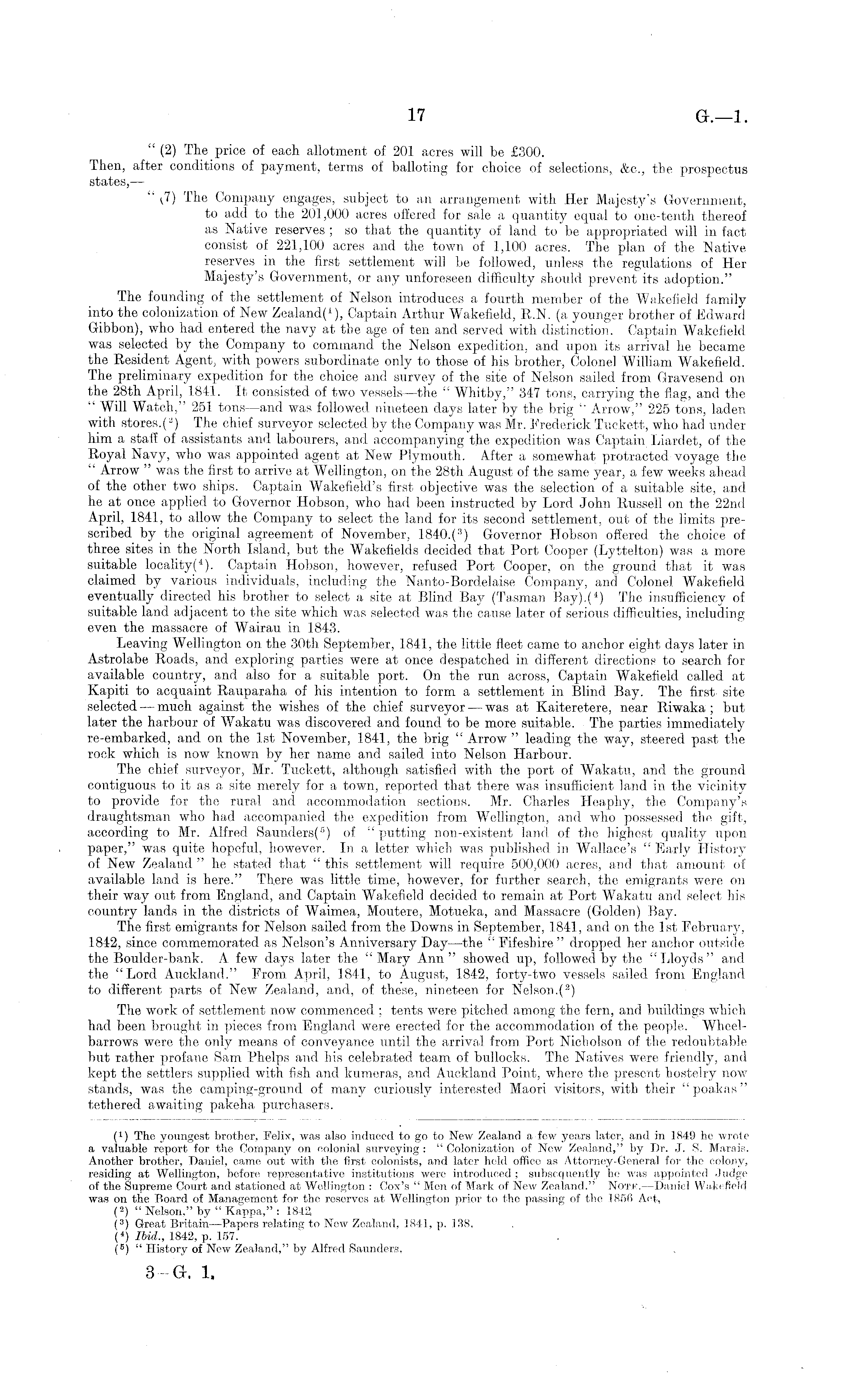 ( 1 ) The youngest brother, Felix, was also induced to go to New Zealand a few years later, and in 1849 he wrote a valuable report for the Company on colonial surveying : " Colonization of New Zealand," by Dr. J. S. Marais. Another brother, Daniel, came out with the first colonists, and later held office as Attorney-General for the colony, residing at Wellington, before representative institutions were introduced ; subsequently he was appointed Judge of the Supreme Court and stationed at Wellington : Cox's " Men of Mark of New Zealand." Note. —Daniel Wakefield was on the Board of Management for the reserves at Wellington prior to the passing of the 1850 Act, ( 2 ) " Nelson," by " Kappa," : 1842, ( 3 ) Great Britain —Papers relating to New Zealand. 1841, p. 138, ( 4 ) Ibid., 1842, p. 157. ( 6 ) " History of New Zealand," by Alfred Saunders,