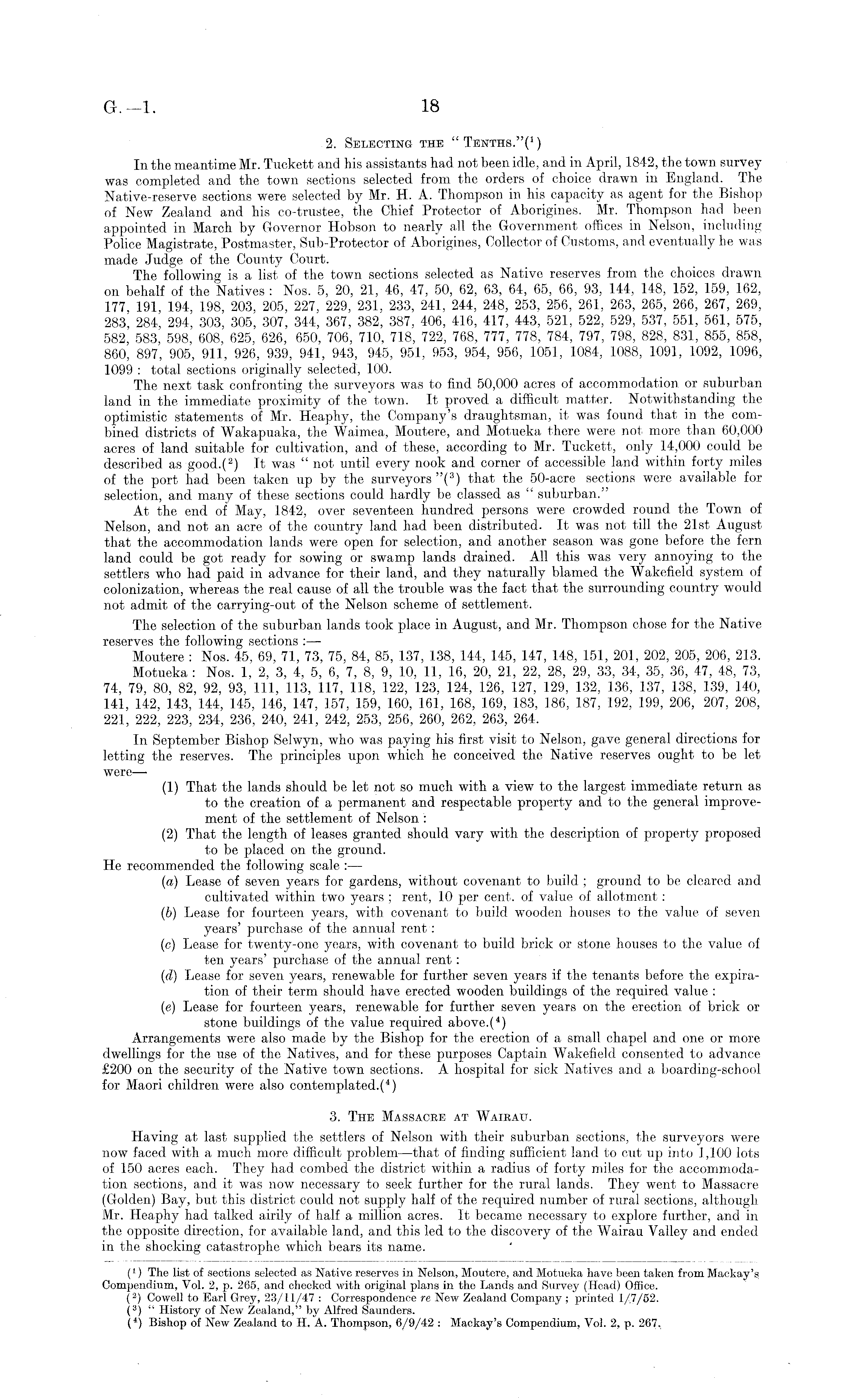 2. Selecting the " ) In the meantime Mr. Tuckett and his assistants had not been idle, and in April, 1842, the town survey was completed and the town sections selected from the orders of choice drawn in England. The Native-reserve sections were selected by Mr. H. A. Thompson in his capacity as agent for the Bishop of New Zealand and his co-trustee, the Chief Protector of Aborigines. Mr. Thompson had been appointed in March by Governor Hobson to nearly all the Government offices in Nelson, including Police Magistrate, Postmaster, Sub-Protector of Aborigines, Collector of Customs, and eventually he was made Judge of the County Court. The following is a list of the town sections selected as Native reserves from the choices drawn on behalf of the Natives : Nos. 5, 20, 21, 46, 47, 50, 62, 63, 64, 65, 66, 93, 144, 148, 152, 159, 162, 177. 191, 194, 198, 203, 205, 227, 229, 231, 233, 241, 244, 248, 253, 256, 261, 263, 265, 266, 267, 269, 283, 284, 294, 303, 305, 307, 344, 367, 382, 387, 406, 416, 417, 443, 521, 522, 529, 537, 551, 561, 575, 582, 583, 598, 608, 625, 626, 650, 706, 710, 718, 722, 768, 777, 778, 784, 797, 798, 828, 831, 855, 858, 860, 897, 905, 911, 926, 939, 941, 943, 945, 951, 953, 954, 956, 1051, 1084, 1088, 1091, 1092, 1096, 1099 : total sections originally selected, 100. The next task confronting the surveyors was to find 50,000 acres of accommodation or suburban land in the immediate proximity of the town. It proved a difficult matter. Notwithstanding the optimistic statements of Mr. Heaphy, the Company's draughtsman, it was found that in the combined districts of Wakapuaka, the Waimea, Moutere, and Motueka there were not more than 60,000 acres of land suitable for cultivation, and of these, according to Mr. Tuckett, only 14,000 could be described as good.( 2 ) It was " not until every nook and corner of accessible land within forty miles of the port had been taken up by the surveyors "( 3 ) that the 50-acre sections were available for selection, and many of these sections could hardly be classed as " suburban." At the end of May, 1842, over seventeen hundred persons were crowded round the Town of Nelson, and not an acre of the country land had been distributed. It was not till the 21st August that the accommodation lands were open for selection, and another season was gone before the fern land could be got ready for sowing or swamp lands drained. All this was very annoying to the settlers who had paid in advance for their land, and they naturally blamed the Wakefield system of colonization, whereas the real cause of all the trouble was the fact that the surrounding country would not admit of the carrying-out of the Nelson scheme of settlement. The selection of the suburban lands took place in August, and Mr. Thompson chose for the Native reserves the following sections :— Moutere : Nos. 45, 69, 71, 73, 75, 84, 85, 137, 138, 144, 145, 147, 148, 151, 201, 202, 205, 206, 213. Motueka : Nos. J, 2, 3, 4, 5, 6, 7, 8, 9, 10, 11, 16, 20, 21, 22, 28, 29, 33, 34, 35, 36, 47, 48, 73, 74, 79, 80, 82, 92, 93, 111, 113, 117, 118, 122, 123, 124, 126, 127, 129, 132, 136, 137, 138, 139, 140, 141, 142, 143, 144, 145, 146, 147, 157, 159, 160, 161, 168, 169, 183, 186, 187, 192, 199, 206, 207, 208, 221, 222, 223, 234, 236, 240, 241, 242, 253, 256, 260, 262, 263, 264. In September Bishop Selwyn, who was paying his first visit to Nelson, gave general directions for letting the reserves. The principles upon which he conceived the Native reserves ought to be let were— (1) That the lands should be let not so much with a view to the largest immediate return as to the creation of a permanent and respectable property and to the general improvement of the settlement of Nelson : (2) That the length of leases granted should vary with the description of property proposed to be placed on the ground. He recommended the following scale :— (a) Lease of seven years for gardens, without covenant to build ; ground to be cleared and cultivated within two years ; rent, 10 per cent, of value of allotment: (b) Lease for fourteen years, with covenant to build wooden houses to the value of seven years' purchase of the annual rent: (c) Lease for twenty-one years, with covenant to build brick or stone houses to the value of ten years' purchase of the annual rent: (d) Lease for seven years, renewable for further seven years if the tenants before the expiration of their term should have erected wooden buildings of the required value : (e) Lease for fourteen years, renewable for further seven years on the erection of brick or stone buildings of the value required above.( 4 ) Arrangements were also made by the Bishop for the erection of a small chapel and one or more dwellings for the use of the Natives, and for these purposes Captain Wakefield consented to advance £200 on the security of the Native town sections. A hospital for sick Natives and a boarding-school for Maori children were also contemplated.(*) 3. The Massacee at Wairau. Having at last supplied the settlers of Nelson with their suburban sections, the surveyors were now faced with a much more difficult problem—that of finding sufficient land to cut up into 1,100 lots of 150 acres each. They had combed the district within a radius of forty miles for the accommodation sections, and it was now necessary to seek further for the rural lands. They went to Massacre (Golden) Bay, but this district could not supply half of the required number of rural sections, although Mr. Heaphy had talked airily of half a million acres. It became necessary to explore further, and in the opposite direction, for available land, and this led to the discovery of the Wairau Valley and ended in the shocking catastrophe which bears its name.