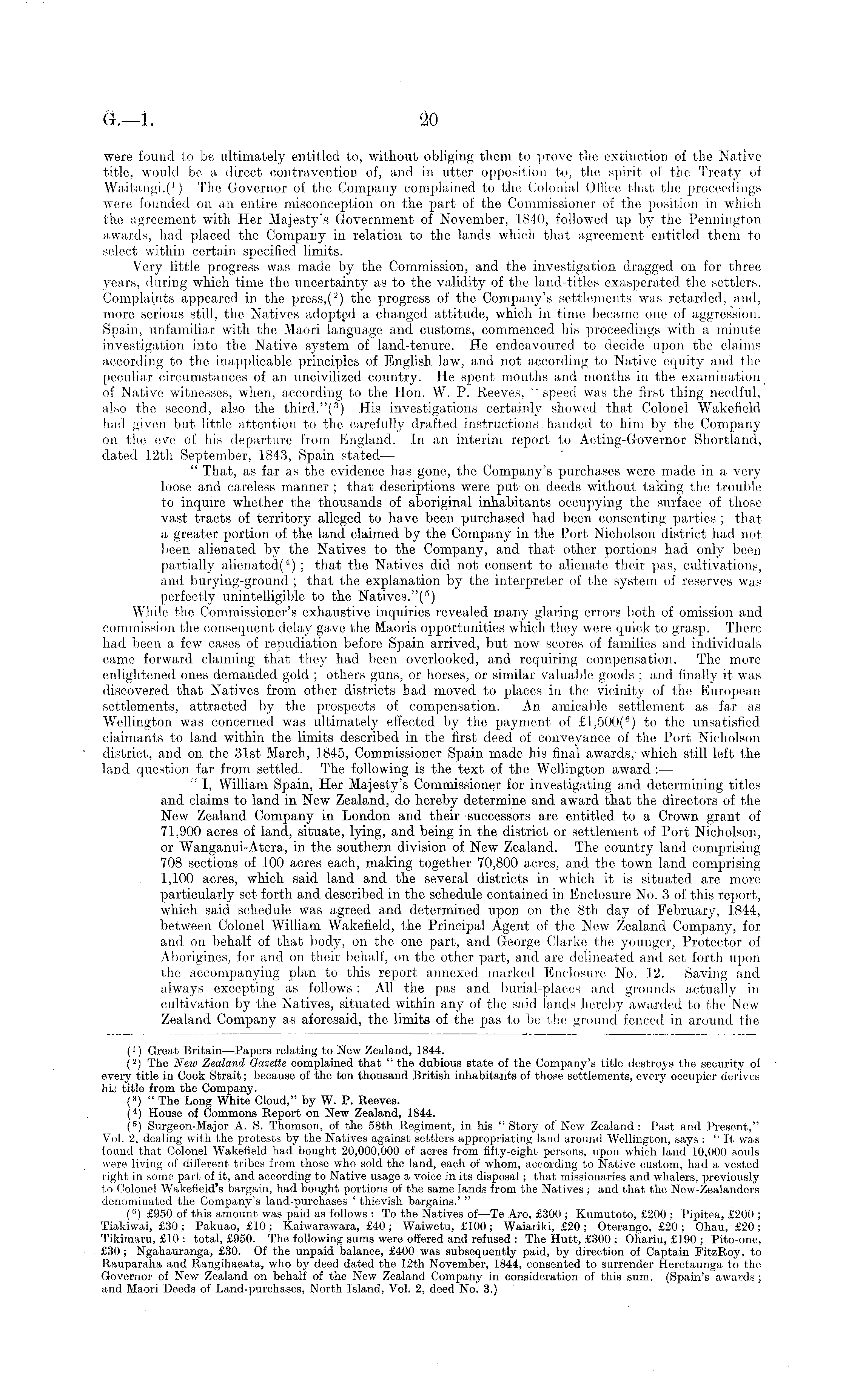 were found to be ultimately entitled to, without obliging them to prove the extinction of the Native title, would be a direct contravention of, and in utter opposition to, the spirit of the Treaty of Waitangi.f 1 ) The Governor of the Company complained to the Colonial Office that the proceedings were founded on an entire misconception on the part of the Commissioner of the position in which the agreement with Her Majesty's Government of November, 1840, followed up by the Pennington awards, had placed the Company in relation to the lands which that agreement entitled them to select within certain specified limits. Very little progress was made by the Commission, and the investigation dragged on for three years, during which time the uncertainty as to the validity of the land-titles exasperated the settlers. Complaints appeared in the press,(-') the progress of the Company's settlements was retarded, and, more serious still, the Natives adoptgd a changed attitude, which in time became one of aggression. Spain, unfamiliar with the Maori language and customs, commenced his proceedings with a minute investigation into the Native system of land-tenure. He endeavoured to decide upon the claims according to the inapplicable principles of English law, and not according to Native equity and the peculiar circumstances of an uncivilized country. He spent months and months in the examination of Native witnesses, when, according to the Hon. W. P. Reeves, " speed was the first thing needful, also the second, also the third."( 3 ) His investigations certainly showed that Colonel Wakefield had given but little attention to the carefully drafted instructions handed to him by the Company on the eve of his departure from England. In an interim report to Acting-Governor Shortland, dated 12th September, 184.3, Spain stated — " That, as far as the evidence has gone, the Company's purchases were made in a very loose and careless ma.nner ; that descriptions were put on deeds without taking the trouble to inquire whether the thousands of aboriginal inhabitants occupying the surface of those vast tracts of territory alleged to have been purchased had been consenting parties ; that a greater portion of the land claimed by the Company in the Port Nicholson district had not been alienated by the Natives to the Company, and that other portions had only been partially alienated( 4 ) ; that the Natives did not consent to alienate their pas, cultivations, and burying-ground ; that the explanation by the interpreter of the system of reserves was perfectly unintelligible to the Natives."( 6 ) While the Commissioner's exhaustive inquiries revealed many glaring errors both of omission and commission the consequent delay gave the Maoris opportunities which they were quick to grasp. There had been a few cases of repudiation before Spain arrived, but now scores of families and individuals came forward claiming that they had been overlooked, and requiring compensation. The more enlightened ones demanded gold ; others guns, or horses, or similar valuable goods ; and finally it was discovered that Natives from other districts had moved to places in the vicinity of the European settlements, attracted by the prospects of compensation. An amicable settlement as far as Wellington was concerned was ultimately effected by the payment of £1,500( 6 ) to the unsatisfied claimants to land within the limits described in the first deed of conveyance of the Port Nicholson district, and on the 31st March, 1845, Commissioner Spain made his final awards," which still left the land question far from settled. The following is the text of the Wellington award : — " I, William Spain, Her Majesty's Commissioner for investigating and determining titles and claims to land in New Zealand, do hereby determine and award that the directors of the New Zealand Company in London and their successors are entitled to a Crown grant of 71,900 acres of land, situate, lying, and being in the district or settlement of Port Nicholson, or Wanganui-Atera, in the southern division of New Zealand. The country land comprising 708 sections of 100 acres each, making together 70,800 acres, and the town land comprising 1,100 acres, which said land and the several districts in which it is situated are more particularly set forth and described in the schedule contained in Enclosure No. 3 of this report, which said schedule was agreed and determined upon on the Bth day of February, 1844, between Colonel William Wakefield, the Principal Agent of the New Zealand Company, for and on behalf of that body, on the one part, and George Clarke the younger, Protector of Aborigines, for and on their behalf, on the other part, and are delineated and set forth upon the accompanying plan to this report annexed marked Enclosure No. 12. Saving and always excepting as follows: All the pas and burial-places and grounds actually in cultivation by the Natives, situated within any of the said lands hereby awarded to the New Zealand Company as aforesaid, the limits of the pas to be the ground fenced in around the
