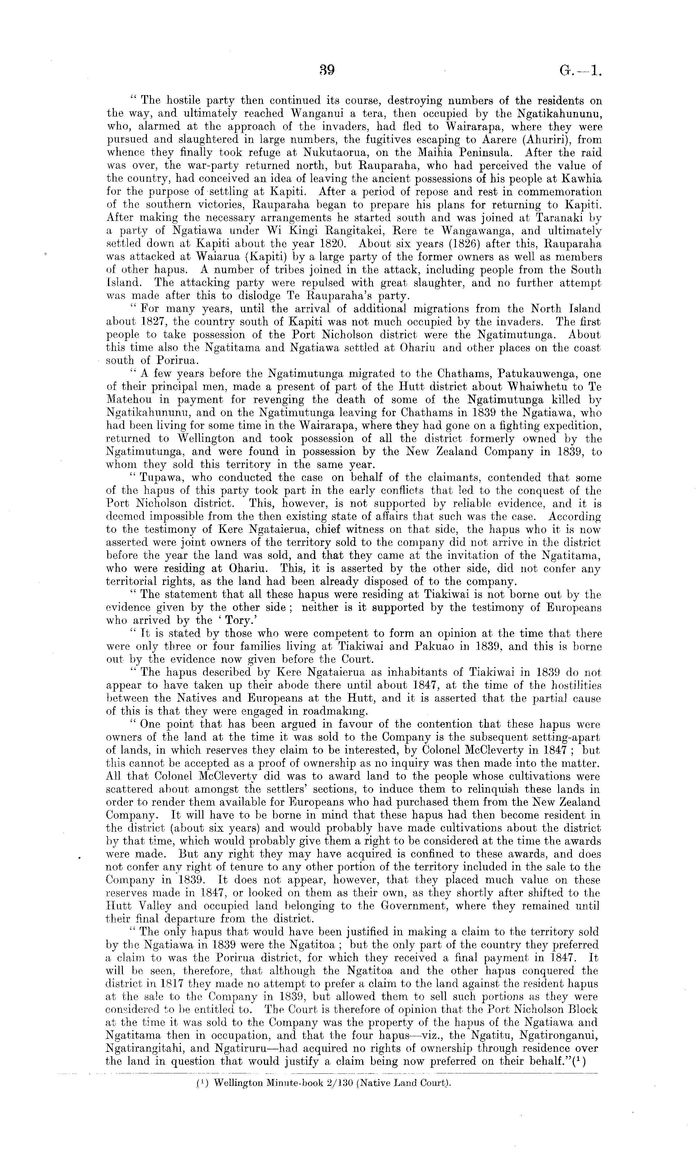 " The hostile party then continued its course, destroying numbers of the residents on the way, and ultimately reached Wanganui a tera, then occupied by the Ngatikahununu, who, alarmed at the approach of the invaders, had fled to Wairarapa, where they were pursued and slaughtered in large numbers, the fugitives escaping to Aarere (Ahuriri), from whence they finally took refuge at Nukutaorua, on the Maihia Peninsula. After the raid was over, the war-party returned north, but Rauparaha, who had perceived the value of the country, had conceived an idea of leaving the ancient possessions of his people at Kawhia for the purpose of settling at Kapiti. After a period of repose and rest in commemoration of the southern victories, Rauparaha began to prepare his plans for returning to Kapiti. After making the necessary arrangements he started south and was joined at Taranaki by a party of Ngatiawa under Wi Kingi Rangitakei, Here te Wangawanga, and ultimately settled down at Kapiti about the year 1820. About six years (1826) after this, Rauparaha was attacked at Waiarua (Kapiti) by a large party of the former owners as well as members of other hapus. A number of tribes joined in the attack, including people from the South Island. The attacking party were repulsed with great slaughter, and no further attempt was made after this to dislodge Te Rauparaha's party. " For many years, until the arrival of additional migrations from the North Island about 1827, the country south of Kapiti was not much occupied by the invaders. The first people to take possession of the Port Nicholson district were the Ngatimutunga. About this time also the Ngatitama and Ngatiawa settled at Ohariu and other places on the coast south of Porirua. " A few years before the Ngatimutunga migrated to the Chathams, Patukauwenga, one of their principal men, made a present of part of the Hutt district about Whaiwhetu to Te Matehou in payment for revenging the death of some of the Ngatimutunga killed by Ngatikahununu, and on the Ngatimutunga leaving for Chathams in 1839 the Ngatiawa, who had been living for some time in the Wairarapa, where they had gone on a fighting expedition, returned to Wellington and took possession of all the district formerly owned by the Ngatimutunga, and were found in possession by the New Zealand Company in 1839, to whom they sold this territory in the same year. " Tupawa, who conducted the case on behalf of the claimants, contended that some of the hapus of this party took part in the early conflicts that led to the conquest of the Port Nicholson district. This, however, is not supported by reliable evidence, and it is deemed impossible from the then existing state of affairs that such was the case. According to the testimony of Kere Ngataierua, chief witness on that side, the hapus who it is now asserted were joint owners of the territory sold to the company did not arrive in the district before the year the land was sold, and that they came at the invitation of the Ngatitama, who were residing at Ohariu. This, it is asserted by the other side, did not confer any territorial rights, as the land had been already disposed of to the company. " The statement that all these hapus were residing at Tiakiwai is not borne out by the evidence given by the other side ; neither is it supported by the testimony of Europeans who arrived by the ' Tory.' " It is stated by those who were competent to form an opinion at the time that there were only three or four families living at Tiakiwai and Pakuao in 1839, and this is borne out by the evidence now given before the Court. " The hapus described by Kere Ngataierua as inhabitants of Tiakiwai in 1839 do not appear to have taken up their a,bode there until about 1847, at the time of the hostilities between the Natives and Europeans at the Hutt, and it is asserted that the partial cause of this is that they were engaged in roadmakmg. " One point that has been argued in favour of the contention that these hapus were owners of the land at the time it was sold to the Company is the subsequent setting-apart of lands, in which reserves they claim to be interested, by Colonel McCleverty in 1847 ; but this cannot be accepted as a proof of ownership as no inquiry was then made into the matter. All that Colonel McCleverty did was to award land to the people whose cultivations were scattered about amongst the settlers' sections, to induce them to relinquish these lands in order to render them available for Europeans who had purchased them from the New Zealand Company. It will have to be borne in mind that these hapus had then become resident in the district (about six years) and would probably have made cultivations about the district by that time, which would probably give them a right to be considered at the time the awards were made. But any right they may have acquired is confined to these awards, and does not confer any right of tenure to any other portion of the territory included in the sale to the Company in 1839. It does not appear, however, that they placed much value on these reserves made in 1847, or looked on them as their own, as they shortly after shifted to the Hutt Valley and occupied land belonging to the Government, where they remained until their final departure from the district. " The only hapus that would have been justified in making a claim to the territory sold by the Ngatiawa in 1839 were the Ngatitoa ; but the only part of the country they preferred a claim to was the Porirua district, for which they received a final payment in 1847. It will be seen, therefore, that although the Ngatitoa and the other hapus conquered the district in 1817 they made no attempt to prefer a claim to the land against the resident hapus at the sale to the Company in 1839, but allowed them to sell such portions as they were considered to be entitled to. The Court is therefore of opinion that the Port Nicholson Block at the time it was sold to the Company was the property of the hapu