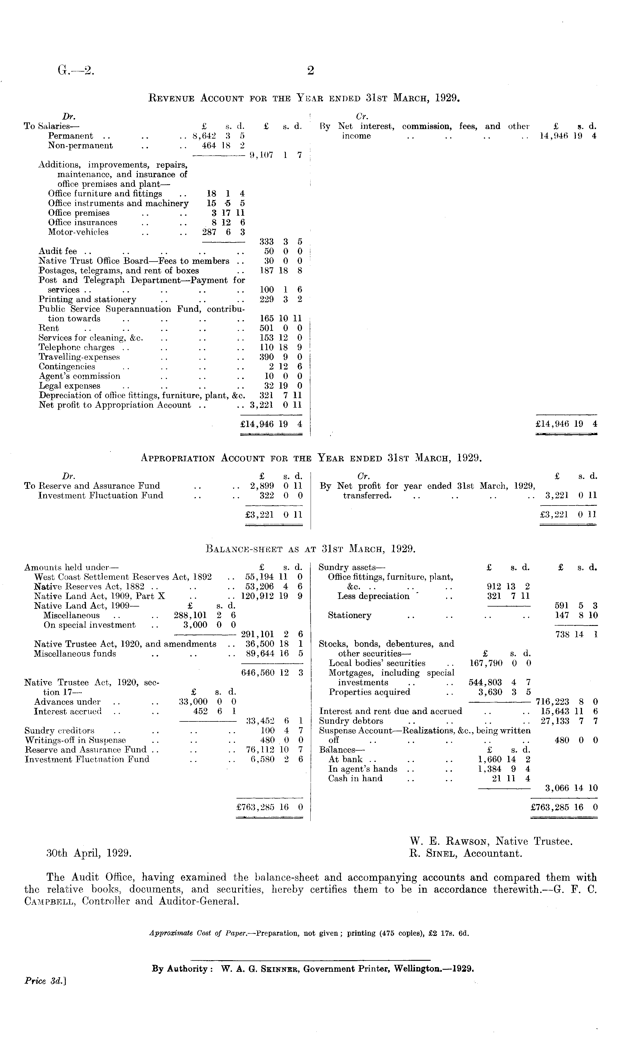 Revenue Account foe the Year ended 31st March, 1929. Dr. ! Cr. To Salaries— £ s. d. £ s. d. By Net interest, commission, fees, and other £ s. d. Permanent .. .. .. 8,642 3 5 income .. .. .. .. 14,946 19 4 Non-permanent .. .. 464 18 2 9,107 1 7 Additions, improvements, repairs, maintenance, and insurance of office premises and plant— Office furniture and fittings .. 18 1 4 Office instruments and machinery 15 *5 5 Office premises .. .. 3 17 11 Office insurances . . .. 8 12 6 Motor-vehicles .. .. 287 6 3 333 3 5 Audit fee .. . . . . .. .. 50 0 0 Native Trust Office Board—Fees to members .. 30 0 0 Postages, telegrams, and rent of boxes .. 187 18 8 Post and Telegraph Department—Payment for services . . .. .. .. .. 100 1 6 Printing and stationery .. .. .. 229 3 2 Public Service Superannuation Fund, contribution towards .. .. .. .. 165 10 11 Rent . . .. .. .. .. 501 0 0 Services for cleaning, &c. .. .. *. 153 12 0 Telephone charges .. .. .. .. 110189 Travelling-expenses . . .. .. 390 9 0 Contingencies .. .. .. .. 2126 Agent's commission . . .. .. 10 0 0 Legal expenses .. .. .. .. 32 19 0 Depreciation of office fittings, furniture, plant, &c. 321 711 Net profit to Appropriation Account .. .. 3,221 0 11 £14,946 19 4 £14,946 19 4 Appropriation Account for the Year ended 31st March, 1929. Dr. £ s. d. Cr. £ s. d. To Reserve and Assurance Fund .. .. 2,899 011 By Net profit for year ended 31st March, 1929, Investment Fluctuation Fund .. .. 322 0 0 transferred. .. .. .. .. 3,221011 £3,221 0 11 £3,221 0 11 Balance-sheet as at 31st March, 1929. Amounts held under — £ s. d. Sundry assets — £ s. d. £ s. d. West Coast Settlement Reserves Act, 1892 .. 55,194 11 0 Office fittings, furniture, plant, Native Reserves Act, 1882 .. .. .. 53,206 4 6 &c. .. .. .. 912 13 2 Native Land Act, 1909, Part X .. .. 120,912 19 9 Less depreciation .. 321 7 11 Native Land Act, 1909 — £ s. d. 591 5 3 Miscellaneous .. .. 288,101 2 6 Stationery .. .. .. .. 147 810 On special investment .. 3,000 0 0 291,101 2 6 738 14 1 Native Trustee Act, 1920, and amendments .. 36,500 18 1 Stocks, bonds, debentures, and Miscellaneous funds .. .. .. 89,644 16 5 other securities— £ s. d. Local bodies'securities .. 167,790 0 0 646,560 12 3 Mortgages, including special Native Trustee Act, 1920, sec- investments .. . . 544,803 4 7 tion 17— £ s. d. Properties acquired .. 3,630 3 5 Advances under .. .. 33,000 0 0 716,223 8 0 Interest accrued .. .. 452 6 1 Interest and rent due and accrued .. .. 15,643 11 6 33,452 6 1 Sundry debtors .. .. .. .. 27,133 7 7 Sundry creditors .. .. .. .. 100 4 7 Suspense Account—Realizations, &c., being written Writings-off in Suspense .. .. .. 480 0 0 off .. .. .. .. .. 480 0 0 Reserve and Assurance Fund .. .. .. 76,112 10 7 Balances — £ s. d. Investment Fluctuation Fund .. .. 6,580 2 6 At bank .. .. .. 1,660 14 2 In agent's hands .. .. 1,384 9 4 Cash in hand .. .. 21 11 4 3,066 14 10 £763,285 16 0 £763,285 16 0 W. E. Raws on, Native Trustee. 30th April, 1929. R. Sinel, Accountant. The Audit Office, having examined the balance-sheet and accompanying accounts and compared them with the relative books, documents, and securities, hereby certifies them to be in accordance therewith.—G. F. C. Campbell, Controller and Auditor-General.