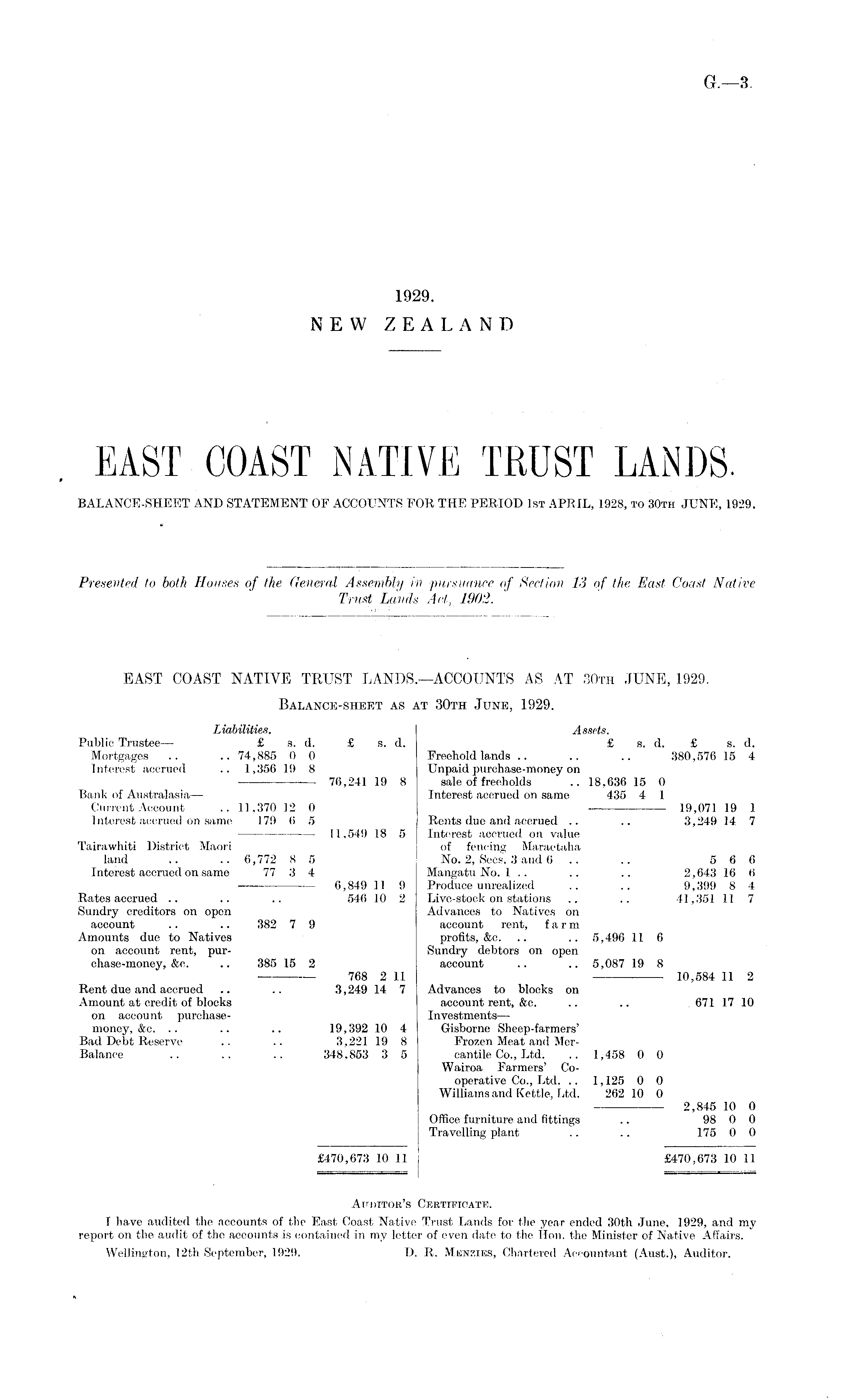 EAST COAST NATIVE TRUST LANDS. BALANCE-SHEET AND STATEMENT OF ACCOUNTS FOR THE PERIOD 1st APRIL, 1928, TO 30th JUNE, 1929.