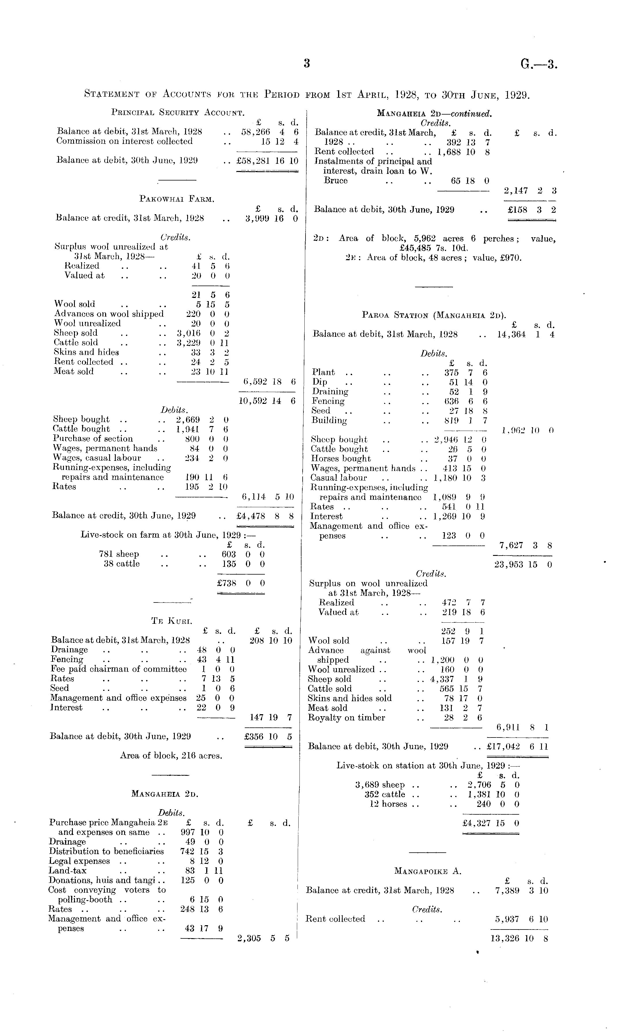 Statement op Accounts for the Period prom Ist April, 1928, to 30th June, 1929. Principal Security Account. Mangaheia 2d—continued. £ s. d. Credits. Balance at debit, 31st March, 1928 .. 58,266 4 6 Balance at credit, 31st March, £ s. d. £ s. d. Commission on interest collected .. 15 12 4 1928 .. .. .. 392 13 7 Rent collected .. .. 1,688 10 8 Balance at debit, 30th June, 1929 .. £58,281 .16 10 Instalments of principal and = interest, drain loan to W. . Bruce .. .. 65 18 0 2,147 2 3 Pakowhai Farm. £ s. d. Balance at debit, 30th June, 1929 .. £158 3 2 Balance at credit, 31st March, 1928 .. 3,999 16 0 - Credits. 2d : Area of block, 5,962 acres 6 perches; value, Surplus wool unrealized at £45,485 7s. lOd. 31st March, 1928 — £ s. d. 2e : Area of block, 48 acres; value, £970. Realized .. .. 41 5 6 Valued at .. .. 20 0 0 21 5 6 Wool sold .. .. 5 15 5 Advances on wool shipped 220 0 0 Pakoa Station (Mangaheia 2d). Wool unrealized .. 20 0 0 £ s. d. Sheep sold .. .. 3,016 0 2 Balance at debit, 31st March, 1928 .. 14,364 1 4 Cattle sold .. .. 3,229 011 Skins and hides .. 33 3 2 Debits. Rent collected .... 24 2 5 £ s. d. Meat sold .. .. 23 10 11 Plant .. .. .. 375 7 6 6,592 18 6 Dip .. .. .. 51 14 0 Draining .. .. 52 1 9 10,592 14 6 Fencing .. .. 636 6 6 Debits. Seed .. .. .. 27 18 8 Sheep bought .. .. 2,669 2 0 Building .. .. 819 1 7 Cattle bought .. .. 1,941 7 6 1,962 10 0 Purchase of section .. 800 0 0 Sheep bought .. .. 2,946 12 0 Wages, permanent hands 84 0 0 Cattle bought .. .. 26 5 0 Wages, casual labour .. 234 2 0 Horses bought .. 37 0 0 Running-expenses, including Wages, permanent hands .. 413 15 0 repairs and maintenance 190 11 6 Casual labour .. .. 1,180 10 3 Rates .. .. 195 2 10 Running-expenses, including 6,114 5 10 repairs and maintenance 1,089 9 9 Rates .. .. .. 541 0 11 Balance at credit, 30th June, 1929 .. £4,478 8 8 Interest .. .. 1,269 10 9 — Management and office ex-Live-stock on farm at 30th June, 1929 : — penses .. .. 123 0 0 £ s. d. 7,627 3 8 781 sheep .. .. 603 0 0 38 cattle .. .. 135 0 0 23,953 15 0 Credits. £738 0 0 Surplus on wool unrealized ===== at 31st March, 1928 — •* Realized .. .. 472 7 7 Valued at .. .. 219 18 6 Te Kubi. £ s. d. £ s. d. 252 9 1 Balance at debit, 31st March, 1928 .. 208 10 10 Wool sold .. .. 157 19 7 Drainage .. .. 48 0 0 Advance against wool Fencing .. .. .. 43 411 shipped .. .. 1,200 0 0 Fee paid chairman of committee 10 0 Wool unrealized .. .. 160 0 0 Rates .. .. .. 713 5 Sheep sold .. .. 4,337 I 9 Seed .. .. .. 10 6 Cattle sold .. .. 565 15 7 Management and office expenses 25 0 0 Skins and hides sold .. 78 17 0 Interest .. .. .. 22 0 9 Meat sold .. .. 131 2 7 147 19 7 Royalty on timber .. 28 2 6 6,911 8 1 Balance at debit, 30th June, 1929 .. £356 10 5 —=■=» Balance at debit, 30th June, 1929 .. £17,042 6 11 Area of block, 216 acres. Live-stock on station at 30th June, 1929 :— £ s. d. 3,689 sheep .. .. 2,706 5 0 Mangaheia 2d. 352 cattle .. .. 1,381 10 0 12 horses .. .. 240 0 0 Debits. Purchase price Mangaheia 2e £ s. d. £ s. d. £4,327 15 0 and expenses on same .. 997 10 0 Drainage .. .. 49 0 0 Distribution to beneficiaries 742 15 3 Legal expenses .. .. 8 12 0 Land-tax .. .. 83 1 II Mangapoike A. Donations, huis and tangi.. 125 0 0 1 £ s. d. Cost conveying voters to 1 Balance at credit, 31st March, 1928 .. 7,389 310 polling-booth .. .. 6 15 0 Rates .. .. .. 248 13 6 ! Credits. Management and office ex- Rent collected .. .. .. 5,937 6 10 penses .. 43 17 9 1 — 2,305 5 5 1 13,326 10 8