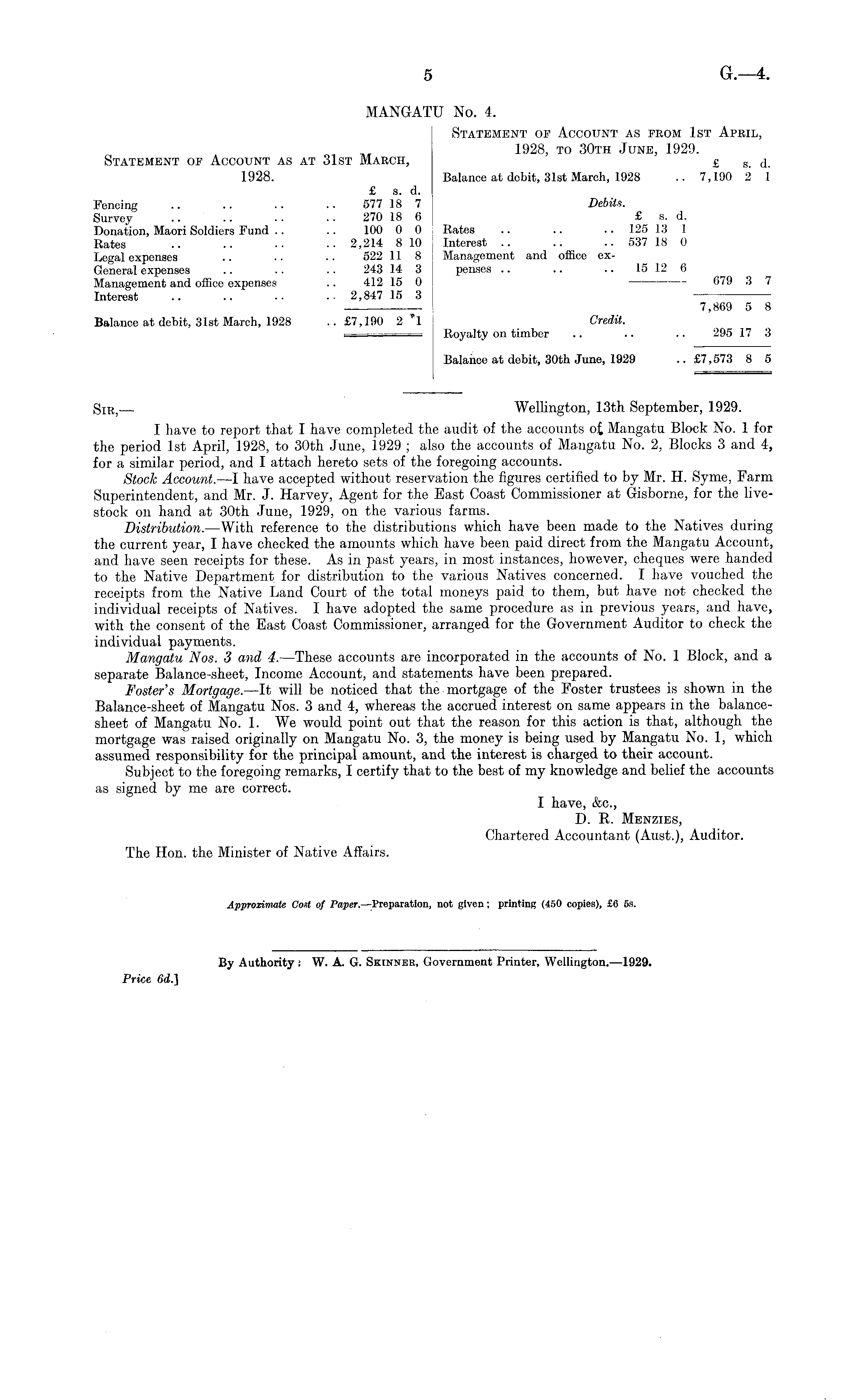 MANGATU No. 4. Statement of Account as from Ist April, 1928, to 30th June, 1929. Statement of Account as at 31st March, £ s <j_ 1928. Balance at debit, 31st March, 1928 .. 7,190 2 1 £ s. d. Fencing .. .. .. . • 577 18 7 Debits. Survey .. .. • • ■ • 270 18 6 £ s. d. Donation, Maori Soldiers Fund .. .. 100 0 0 Rates .. .. .. 125 13 1 Rates .. .. •• .. 2,214 810 Interest .. .. .. 537 18 0 Legal expenses .. . • •. 522 11 8 Management and office exGeneral expenses .. .. .. 243 14 3 penses .. .. .. 15 12 6 Management and office expenses .. 412 15 0 679 3 7 Interest .. .. •• •- 2,847 15 3 — ■ 7,869 5 8 Balance at debit, 31st March, 1928 .. £7,190 2 1 Credit. ===== Royalty on timber .. .. .. 295 17 3 Balance at debit, 30th June, 1929 .. £7,573 8 5 Sir, — Wellington, 13th September, 1929. I have to report that I have completed the audit of the accounts o£ Mangatu Block No. 1 for the period Ist April, 1928, to 30th June, 1929 ; also the accounts of Mangatu No. 2, Blocks 3 and 4, for a similar period, and I attach hereto sets of the foregoing accounts. Stock Account.—l have accepted without reservation the figures certified to by Mr. H. Syme, Farm Superintendent, and Mr. J. Harvey, Agent for the East Coast Commissioner at Gisborne, for the livestock on hand at 30th June, 1929, on the various farms. Distribution. —With reference to the distributions which have been made to the Natives during the current year, I have checked the amounts which have been paid direct from the Mangatu Account, and have seen receipts for these. As in past years, in most instances, however, cheques were handed to the Native Department for distribution to the various Natives concerned. I have vouched the receipts from the Native Land Court of the total moneys paid to them, but have not checked the individual receipts of Natives. I have adopted the same procedure as in previous years, and have, with the consent of the East Coast Commissioner, arranged for the Government Auditor to check the individual payments. Mangatu Nos. 3 and 4.—These accounts are incorporated in the accounts of No. 1 Block, and a separate Balance-sheet, Income Account, and statements have been prepared. Foster's Mortgage.—lt will be noticed that the mortgage of the Foster trustees is shown in the Balance-sheet of Mangatu Nos. 3 and 4, whereas the accrued interest on same appears in the balancesheet of Mangatu No. 1. We would point out that the reason for this action is that, although the mortgage was raised originally on Mangatu No. 3, the money is being used by Mangatu No. 1, which assumed responsibility for the principal amount, and the interest is charged to their account. Subject to the foregoing remarks, I certify that to the best of my knowledge and belief the accounts as signed by me are correct. I have, &c., D. R. Menzies, Chartered Accountant (Aust.), Auditor. The Hon. the Minister of Native Affairs.