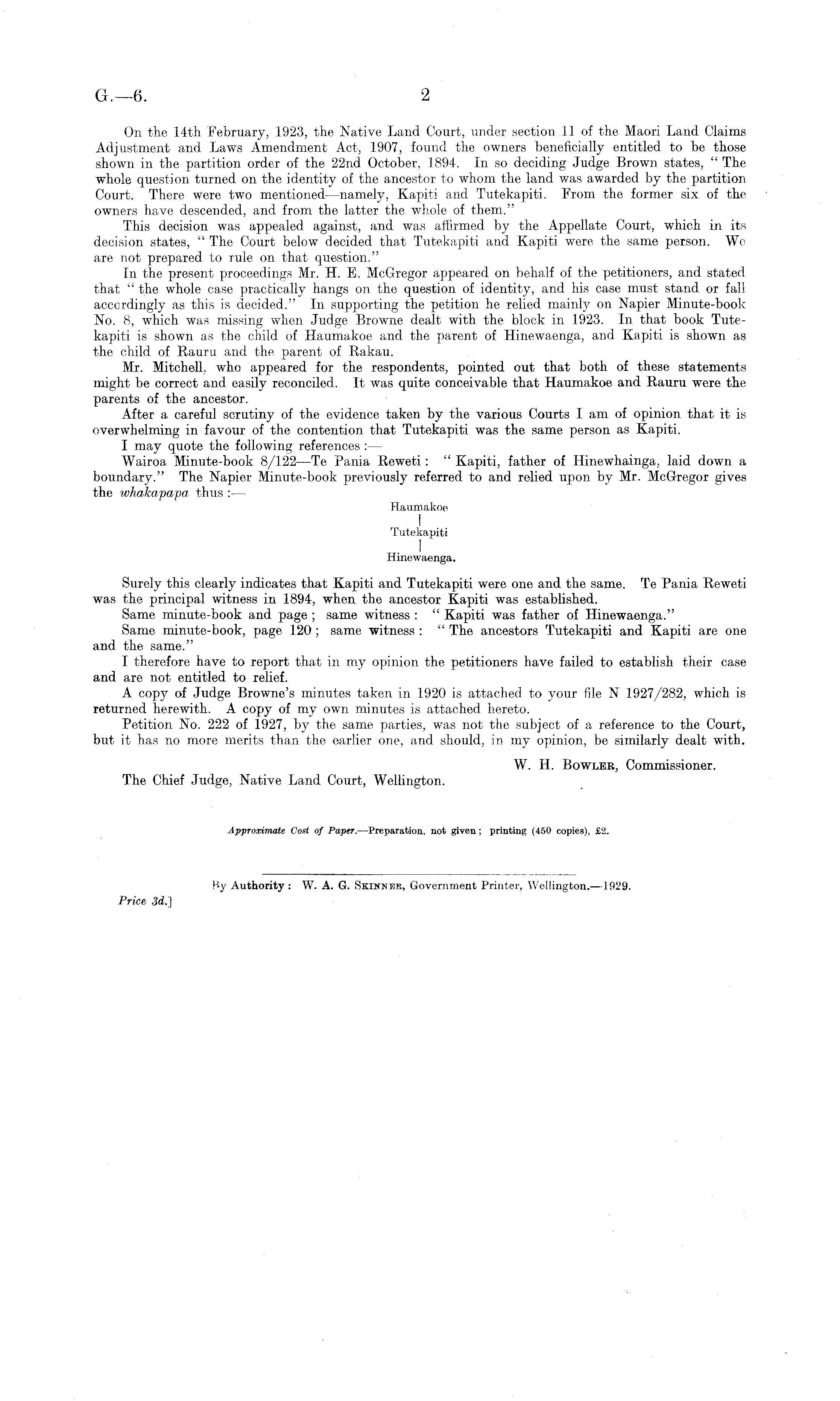 On the 14th February, 1923, the Native Land Court, under section 11 of the Maori Land Claims Adjustment and Laws Amendment Act, 1907, found the owners beneficially entitled to be those shown in the partition order of the 22nd October, 1894. In so deciding Judge Brown states, " The whole question turned on the identity of the ancestor to whom the land was awarded by the partition Court. There were two mentioned—namely, Kapiti and Tutekapiti. From the former six of the owners have descended, and from the latter the whole of them." This decision was appealed against, and was affirmed by the Appellate Court, which in its decision states, " The Court below decided that Tutekapiti and Kapiti were the same person. We are not prepared to rule on that question." In the present proceedings Mr. H. E. McGregor appeared on behalf of the petitioners, and stated that " the whole case practically hangs on the question of identity, and his case must stand or fall accordingly as this is decided." In supporting the petition he relied mainly on Napier Minute-book No. 8, which was missing when Judge Browne dealt with the block in 1923. In that book Tutekapiti is shown as the child of Haumakoe and the parent of Hinewaenga, and Kapiti is shown as the child of Rauru and the parent of Rakau. Mr. Mitchell, who appeared for the respondents, pointed out that both of these statements might be correct and easily reconciled. It was quite conceivable that Haumakoe and Rauru were the parents of the ancestor. After a careful scrutiny of the evidence taken by the various Courts I am of opinion that it is overwhelming in favour of the contention that Tutekapiti was the same person as Kapiti. I may quote the following references : — Wairoa Minute-book 8/122 —Te Pania Reweti: " Kapiti, father of Hinewhainga, laid down a boundary." The Napier Minute-book previously referred to and relied upon by Mr. McGregor gives the whakapa'pa thus : — Haumakoe i Tutekapiti I Hinewaenga. Surely this clearly indicates that Kapiti and Tutekapiti were one and the same. Te Pania Reweti was the. principal witness in 1894, when the ancestor Kapiti was established. Same minute-book and page ; same witness : " Kapiti was father of Hinewaenga." Same minute-book, page 120 ; same witness : " The ancestors Tutekapiti and Kapiti are one and the same." I therefore have to report that in my opinion the petitioners have failed to establish their case and are not entitled to relief. A copy of Judge Browne's minutes taken in 1920 is attached to your file N 1927/282, which is returned herewith. A copy of my own minutes is attached hereto. Petition No. 222 of 1927, by the same parties, was not the subject of a reference to the Court, but it has no more merits than the earlier one, and should, in my opinion, be similarly dealt with. W. H. Bowler, Commissioner. The Chief Judge, Native Land Court, Wellington.