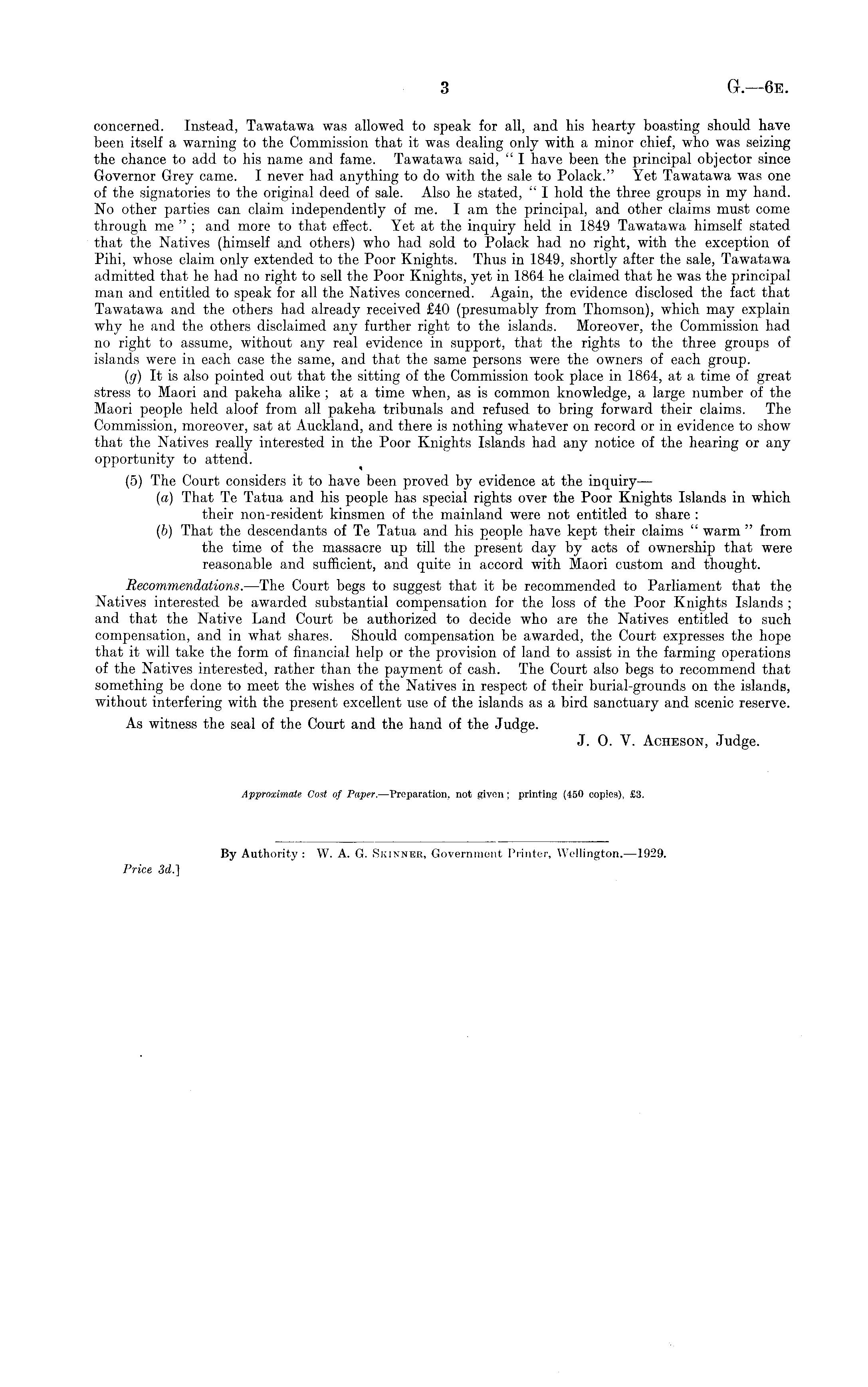 concerned. Instead, Tawatawa was allowed to speak for all, and his hearty boasting should have been itself a warning to the Commission that it was dealing only with a minor chief, who was seizing the chance to add to his name and fame. Tawatawa said, " I have been the principal objector since Governor Grey came. I never had anything to do with the sale to Polack." Yet Tawatawa was one of the signatories to the original deed of sale. Also he stated, " I hold the three groups in my hand. No other parties can claim independently of me. I am the principal, and other claims must come through me"; and more to that effect. Yet at the inquiry held in 1849 Tawatawa himself stated that the Natives (himself and others) who had sold to Polack had no right, with the exception of Pihi, whose claim only extended to the Poor Knights. Thus in 1849, shortly after the sale, Tawatawa admitted that he had no right to sell the Poor Knights, yet in 1864 he claimed that he was the principal man and entitled to speak for all the Natives concerned. Again, the evidence disclosed the fact that Tawatawa and the others had already received £40 (presumably from Thomson), which may explain why he and the others disclaimed any further right to the islands. Moreover, the Commission had no right to assume, without any real evidence in support, that the rights to the three groups of islands were in each case the same, and that the same persons were the owners of each group. (g) It is also pointed out that the sitting of the Commission took place in 1864, at a time of great stress to Maori and pakeha alike ; at a time when, as is common knowledge, a large number of the Maori people held aloof from all pakeha tribunals and refused to bring forward their claims. The Commission, moreover, sat at Auckland, and there is nothing whatever on record or in evidence to show that the Natives really interested in the Poor Knights Islands had any notice of the hearing or any opportunity to attend. (5) The Court considers it to have been proved by evidence at the inquiry— (a) That Te Tatua and his people has special rights over the Poor Knights Islands in which their non-resident kinsmen of the mainland were not entitled to share : (b) That the descendants of Te Tatua and his people have kept their claims " warm " from the time of the massacre up till the present day by acts of ownership that were reasonable and sufficient, and quite in accord with Maori custom and thought. Recommendations.—The Court begs to suggest that it be recommended to Parliament that the Natives interested be awarded substantial compensation for the loss of the Poor Knights Islands ; and that the Native Land Court be authorized to decide who are the Natives entitled to such compensation, and in what shares. Should compensation be awarded, the Court expresses the hope that it will take the form of financial help or the provision of land to assist in the farming operations of the Natives interested, rather than the payment of cash. The Court also begs to recommend that something be done to meet the wishes of the Natives in respect of their burial-grounds on the islands, without interfering with the present excellent use of the islands as a bird sanctuary and scenic reserve. As witness the seal of the Court and the hand of the Judge. J. 0. V. Acheson, Judge.