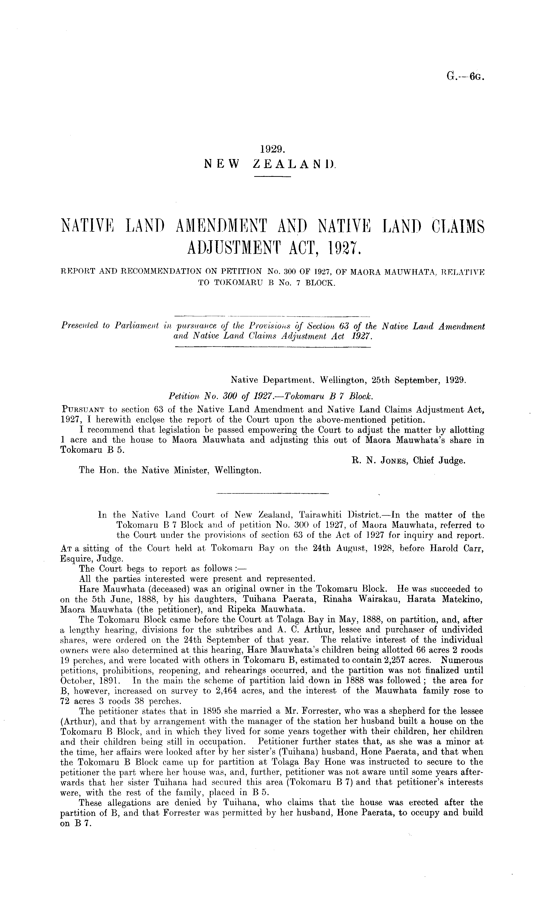 Native Department, Wellington, 25th September, 1929. Petition No. 300 of 1927. —Tokomaru B 7 Block. Pursuant to section 63 of the Native Land Amendment and Native Land Claims Adjustment Act, 1927, I herewith enclose the report of the Court upon the above-mentioned petition. I recommend that legislation be passed empowering the Court to adjust the matter by allotting 1 acre and the house to Maora Mauwhata and adjusting this out of Maora Mauwhata's share in Tokomaru B 5. R. N. Jones, Chief Judge. The Hon. the Native Minister, Wellington.