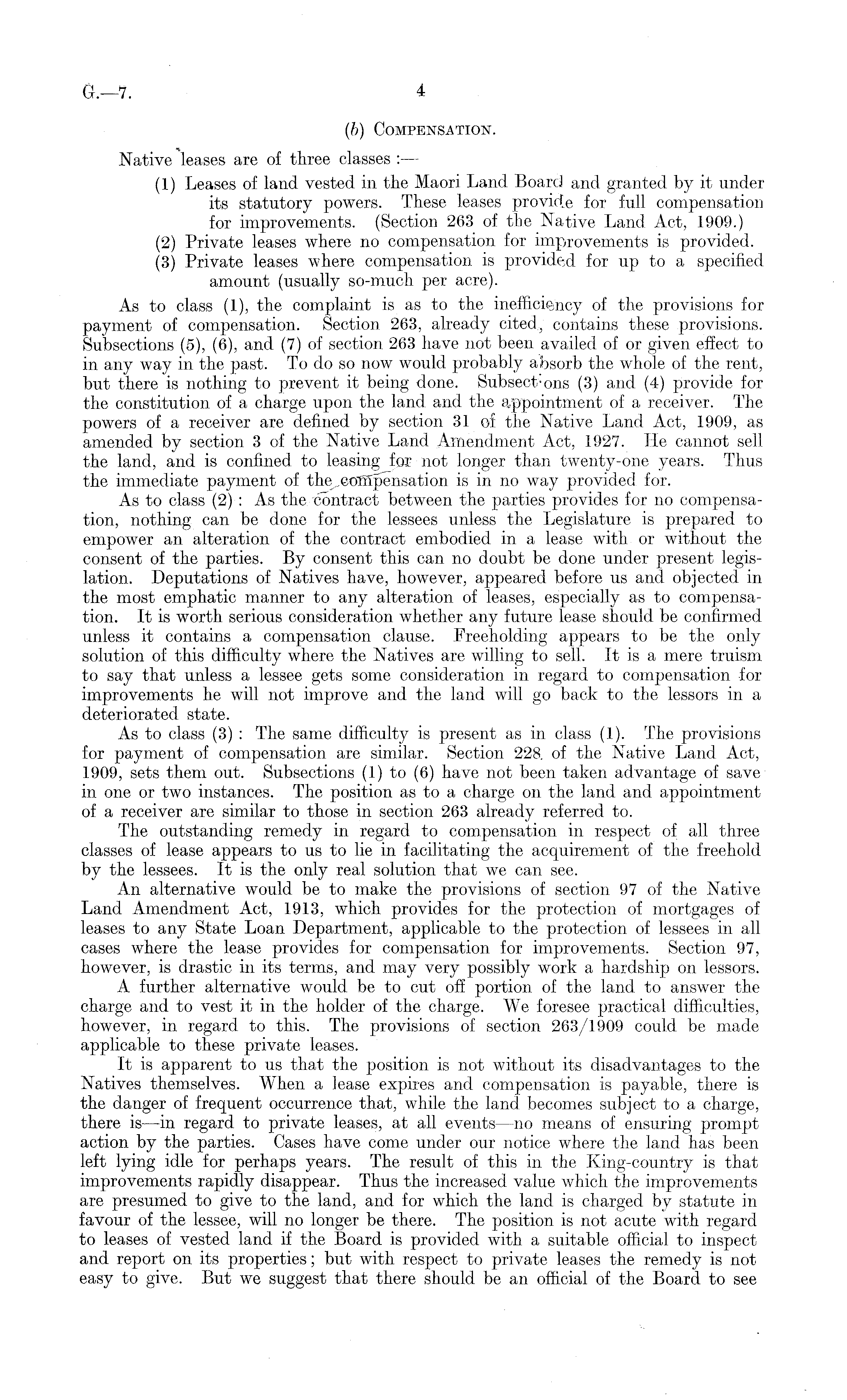 (b) Compensation. Native leases are of three classes : — (1) Leases of land vested in the Maori Land Board and granted by it under its statutory powers. These leases provide for full compensation for improvements. (Section 263 of the Native Land Act, 1909.) (2) Private leases where no compensation for improvements is provided. (3) Private leases where compensation is provided for up to a specified amount (usually so-much per acre). As to class (1), the complaint is as to the inefficiency of the provisions for payment of compensation. Section 263, already cited,,; contains these provisions. Subsections (5), (6), and (7) of section 263 have not been availed of or given effect to in any way in the past. To do so now would probably absorb the whole of the rent, but there is nothing to prevent it being clone. Subsections (3) and (4) provide for the constitution of a charge upon the land, and the appointment of a receiver. The powers of a receiver are defined by section 31 ef the Native Land Act, 1909, as amended by section 3 of the Native Land Amendment Act, 1927. He cannot sell the land, and is confined to leasing for--not longer than twenty-one years. Thus the immediate payment of t on is in no way provided for. As to class (2) : As the, contract between the parties provides for no compensation, nothing can be done for the lessees unless the Legislature is prepared to empower an alteration of the contract embodied in a lease with or without the consent of the parties. By consent this can no doubt be done under present legislation. Deputations of Natives have, however, appeared before us and objected in the most emphatic manner to any alteration of leases, especially as to compensation. It is worth serious consideration whether any future lease should be confirmed unless it contains a compensation clause. Freeholding appears to be the only solution of this difficulty where the Natives are willing to sell. It is a mere truism to say that unless a lessee gets some consideration in regard to compensation for improvements he will not improve and the land will go back to the lessors in a deteriorated state. As to class (3) : The same difficulty is present as in class (1). The provisions for payment of compensation are similar. Section 228. of the Native Land Act, 1909, sets them out. Subsections (1) to (6) have not been taken advantage of save in one or two instances. The position as to a charge on the land and appointment of a receiver are similar to those in section 263 already referred to. The outstanding remedy in regard to compensation in respect of all three classes of lease appears to us to lie in facilitating the acquirement of the freehold by the lessees. It is the only real solution that we can see. An alternative would be to make the provisions of section 97 of the Native Land Amendment Act, 1913, which provides for the protection of mortgages of leases to any State Loan Department, applicable to the protection of lessees in all cases where the lease provides for compensation for improvements. Section 97, however, is drastic in its terms, and may very possibly work a hardship on lessors. A further alternative would be to cut off portion of the land to answer the charge and to vest it in the holder of the charge. We foresee practical difficulties, however, in regard to this. The provisions of section 263/1909 could be made applicable to these private leases. It is apparent to us that the position is not without its disadvantages to the Natives themselves. When a lease expires and compensation is payable, there is the danger of frequent occurrence that, while the land becomes subject to a charge, there is—in regard to private leases, at all events —no means of ensuring prompt action by the parties. Cases have come under our notice where the land has been left lying idle for perhaps years. The result of this in the King-country is that improvements rapidly disappear. Thus the increased value which the improvements are presumed to give to the land, and for which the land is charged by statute in favour of the lessee, will no longer be there. The position is not acute with regard to leases of vested land if the Board is provided with a suitable official to inspect and report on its properties; but with respect to private leases the remedy is not easy to give. But we suggest that there should be an official of the Board to see