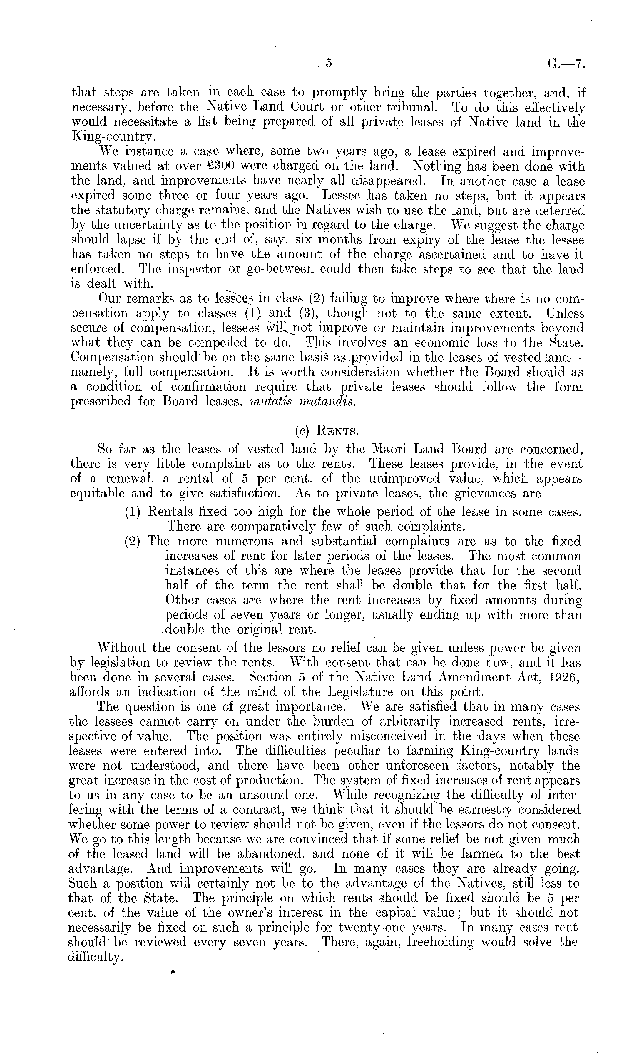 that steps are taken in each case to promptly bring the parties together, and, if necessary, before the Native Land Court or other tribunal. To do this effectively would necessitate a list being prepared of all private leases of Native land in the King-country. We instance a case where, some two years ago, a lease expired and improvements valued at over .£3OO were charged on the land. Nothing has been done with the land, and improvements have nearly all disappeared. In another case a lease expired some three or four years ago. Lessee has taken no steps, but it appears the statutory charge remains, and the Natives wish to use the land, but are deterred by the uncertainty as to the position in regard to the charge. We suggest the charge should lapse if by the end of, say, six months from expiry of the lease the lessee has taken no steps to have the amount of the charge ascertained and to have it enforced. The inspector or go-between could then take steps to see that the land is dealt with. Our remarks as to lessees in class (2) failing to improve where there is no compensation apply to classes (f). and (3), though not to the same extent. Unless secure of compensation, lessees wiiLnot improve or maintain improvements beyond what they can be compelled to do. ""?!his involves an economic loss to the State. Compensation should be on the same basis as-provided in the leases of vested land — namely, full compensation. It is worth consideration whether the Board should as a condition of confirmation require that private leases should follow the form prescribed for Board leases, mutatis mutandis. (c) Rents. So far as the leases of vested land by the Maori Land Board are concerned, there is very little complaint as to the rents. These leases provide, in the event of a renewal, a rental of 5 per cent, of the unimproved value, which appears equitable and to give satisfaction. As to private leases, the grievances are — (1) Rentals fixed too high for the whole period of the lease in some cases. There are comparatively few of such complaints. (2) The more numerous and substantial complaints are as to the fixed increases of rent for later periods of the leases. The most common instances of this are where the leases provide that for the second half of the term the rent shall be double that for the first half. Other cases are where the rent increases by fixed amounts during periods of seven years or longer, usually ending up with more than double the original rent. Without the consent of the lessors no relief can be given unless power be given by legislation to review the rents. With consent that can be done now, and it has been done in several cases. Section 5 of the Native Land Amendment Act, 1926, affords an indication of the mind of the Legislature on this point. The question is one of great importance. We are satisfied that in many cases the lessees cannot carry on under the burden of arbitrarily increased rents, irrespective of value. The position was entirely misconceived in the days when these leases were entered into. The difficulties peculiar to farming King-country lands were not understood, and there have been other unforeseen factors, notably the great increase in the cost of production. The system of fixed increases of rent appears to us in any case to be an unsound one. While recognizing the difficulty of interfering with the terms of a contract, we think that it should be earnestly considered whether some power to review should not be given, even if the lessors do not consent. We go to this length because we are convinced that if some relief be not given much of the leased land will be abandoned, and none of it will be farmed to the best advantage. And improvements will go. In many cases they are already going. Such a position will certainly not be to the advantage of the Natives, still less to that of the State. The principle on which rents should be fixed should be 5 per cent, of the value of the owner's interest in the capital value; but it should not necessarily be fixed on such a principle for twenty-one years. In many cases rent should be reviewed every seven years. There, again, freeholding would solve the difficulty.