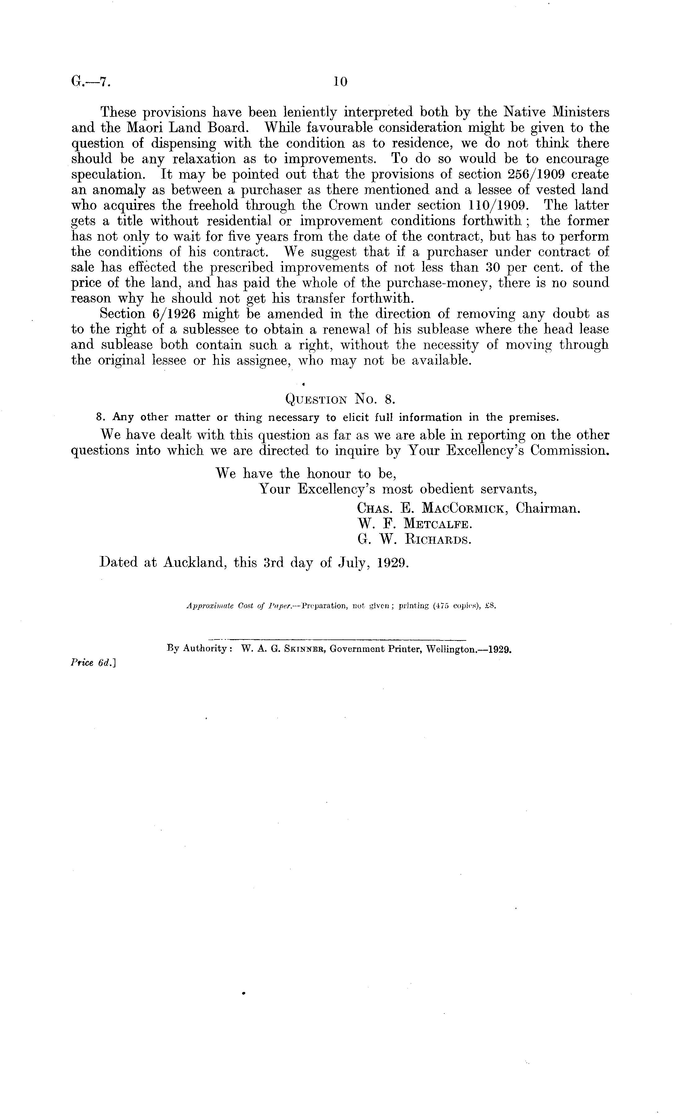 These provisions have been leniently interpreted both, by the Native Ministers and the Maori Land Board. While favourable consideration might be given to the question of dispensing with the condition as to residence, we do not think there should be any relaxation as to improvements. To do so would be to encourage speculation. It may be pointed out that the provisions of section 256/1909 create an anomaly as between a purchaser as there mentioned and a lessee of vested land who acquires the freehold through the Crown under section 110/1909. The latter gets a title without residential or improvement conditions forthwith ; the former has not only to wait for five years from the date of the contract, but has to perform the conditions of his contract. We suggest that if a purchaser under contract of sale has effected the prescribed improvements of not less than 30 per cent, of the price of the land, and has paid the whole of the purchase-money, there is no sound reason why he should not get his transfer forthwith. Section 6/1926 might be amended in the direction of removing any doubt as to the right of a sublessee to obtain a renewal of his sublease where the head lease and sublease both contain such a right, without the necessity of moving through the original lessee or his assignee, who may not be available. 4 Question No. 8. 8. Any other matter or thing necessary to elicit full information in the premises. We have dealt with this question as far as we are able in reporting on the other questions into which we are directed to inquire by Your Excellency's Commission. We have the honour to be, Your Excellency's most obedient servants, Chas. E. MacCormick, Chairman. W. F. Metcalfe. G. W. Richards. Dated at Auckland, this 3rd day of July, 1929.