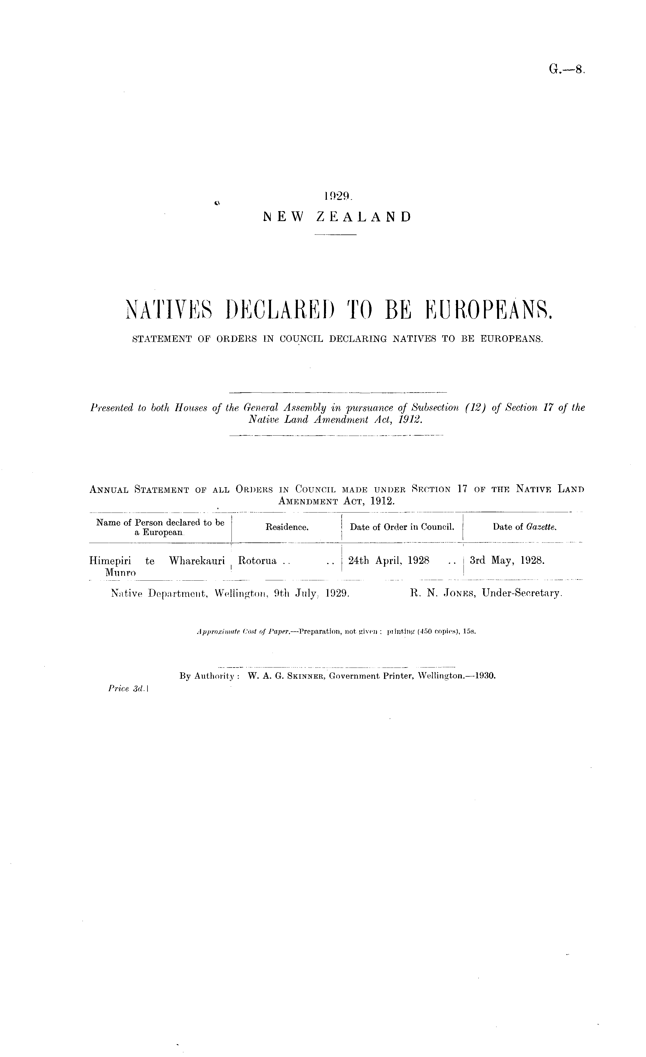 Name of Person declared to be Residence. i Date of Order in Council. ; Date of Gazette. a European Himepiri te Wharekauri Rotorua .. .. 24th April, 1928 .. 3rd May, 1928. Munro ' Native Department, Wellington, 9th July. 1929. R. N. Jones, Under-Secretary.