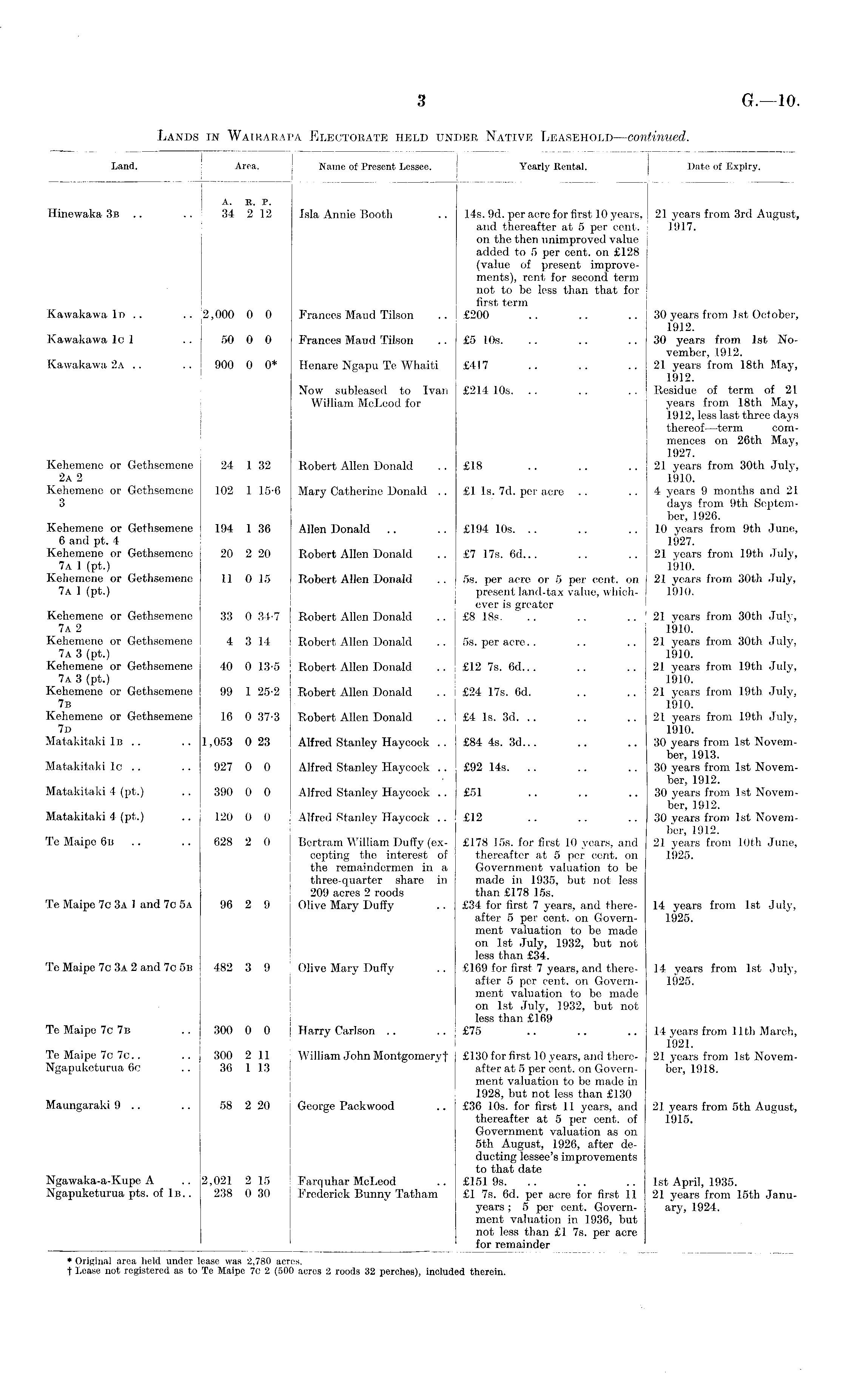 i Land. Area. J Name of Present Lessee. Yearly Rental. Date of Expiry. A. R. P. Hinewaka 3b .. .. 34 2 12 Jsla Annie Booth .. 14s. 9d. per acre for first 10 years, 21 years from 3rd August, and thereafter at 5 per cent. 1917. on the then unimproved value added to 5 per cent, on £128 (value of present improvements), rent for second term not to be less than that for first term Kawakawa lr> .. .. 2,000 0 0 Frances Maud Tilson .. £200 .. .. .. 30 years from 1st October, 1912. Kawakawa 1c 1 .. 50 0 0 Frances Maud Tilson .. £5 10s. .. .. 30 years from 1st November, 1912. Kawakawa 2a .. .. 900 0 0* Henare Ngapu Te Whaiti £417 .. .. ..21 years from 18th May, 1912. Now subleased to Ivan £214 10s. .. .. .. Residue of term of 21 William McLeod for years from 18th May, 1912, less last three days thereof —term commences on 26th May, 1927. Kehemene or Gethsemene 24 1 32 Robert Allen Donald .. £18 .. .. 21 years from 30th July, 2A 2 1910. Kehemene or Gethsemene 102 1 15-0 Mary Catherine Donald .. £1 Is. 7d. per acre .. 4 years 9 months and 21 3 days from 9th September, 1926. Kehemene or Gethsemene 194 1 36 Allen Donald .. .. £194 10s. .. .. 10 years from 9th June, 6 and pt. 4 1927. Kehemene or Gethsemene 20 2 20 Robert Allen Donald .. £7 17s. 6d... .. ..21 years from 19th July, 7a 1 (pt.) 1910. Kehemene or Gethsemene 11 0 15 Robert Allen Donald .. 5s. per acre or 5 per cent, on 21 years from 30th July, 7a 1 (pt.) present land-tax value, which- 1910. ever is greater Kehemene or Gethsemene 33 0 34-7 Robert Allen Donald .. £8 18s. .. .. .. ' 21 years from 30th July, 7a 2 1910. Kehemene or Gethsemene 4 3 14 Robert Allen Donald .. 5s. per acre.. .. ..21 years from 30th July, 7a 3 (pt.) 1910. Kehemene or Gethsemene 40 0 13-5 Robert Allen Donald .. £12 7s. 6d... .. .. 21 years from 19th July, 7a 3 (pt.) 1910. Kehemene or Gethsemene 99 1 25-2 Robert Allen Donald .. i £24 17s. 6d. .. 21 years from 19th Julv, 7 b I 1910. Kehemene or Gethsemene 16 0 37-3 Robert Allen Donald .. I £4 Is. 3d. .. .. .. 21 years from 19th July, 7d 1910. Matakitaki 1b .. .. 1,053 0 23 Alfred Stanley Haycock .. £84 4s. 3d... .. .. 30 years from 1st November, 1913. Matakitaki lc .. .. 927 0 0 Alfred Stanley Haycock .. £92 14s. .. .. 30 years from 1st November, 1912. Matakitaki 4 (pt.) .. 390 0 0 Alfred Stanley Haycock .. £51 .. .. 30 years from 1st November, 1912. Matakitaki 4 (pt.) .. 120 0 0 Alfred Stanley Haycock .. £12 .. .. 30 years from 1st November, 1912. Te Maipe 6b .. .. 628 2 0 Bertram William Duffy (ex- £178 15s. for first 10 years, and 21 years from 10th June, eepting the interest of thereafter at 5 per cent, on 1925. the remaindermen in a Government valuation to be three-quarter share in made in 1935, but not less 209 acres 2 roods than £178 15s. Te Maipe 7c 3a 1 and 7o 5a 96 2 9 Olive Mary Duffy .. £34 for first 7 years, and there- 14 years from 1st July, after 5 per cent, on Govern- 1925. ment valuation to be made on 1st July, 1932, but not less than £34. Te Maipe 7c 3a 2 and 7c 5b 482 3 9 Olive Mary Duffy .. £169 for first 7 years, and there- 14 years from 1st July, after 5 per cent, on Govern- 1925. ment valuation to be made on 1st July, 1932, but not less than £169 Te Maipe 7c 7b .. 300 0 0 j Harry Carlson .. .. £75 .. .. .. 14 years from 11th March, 1921. Te Maipe 7c 7c.. .. 300 2 11 William John Montgomeryf £130 for first 10 years, and there- 21 years from 1st NovemNgapuketurua 6c .. 36 1 13 after at 5 per cent, on Govern- ber, 1918. ment valuation to be made in 1928, but not less than £130 Maungaraki 9 .. .. 58 2 20 George Packwood .. £36 10s. for first 11 years, and 21 years from 5th August, thereafter at 5 per cent, of 1915. Government valuation as on 5th August, 1926, after deducting lessee's improvements to that date Ngawaka-a-Kupe A .. 2,021 2 15 Farquhar McLeod .. £151 9s. .. .. .. 1st April, 1935. Ngapuketurua pts. of 1b. . 238 0 30 Frederick Bunny Tatham £1 7s. 6d. per acre for first 11 21 years from 15th Januyears ; 5 per cent. Govern- ary, 1924. ment valuation in 1936, but not less than £1 7s. per acre for remainder * Original area held under lease was 2,780 acres. f Lease not registered as to Te Maipe 7c 2 (500 acres 2 roods 32 perches), included therein.
