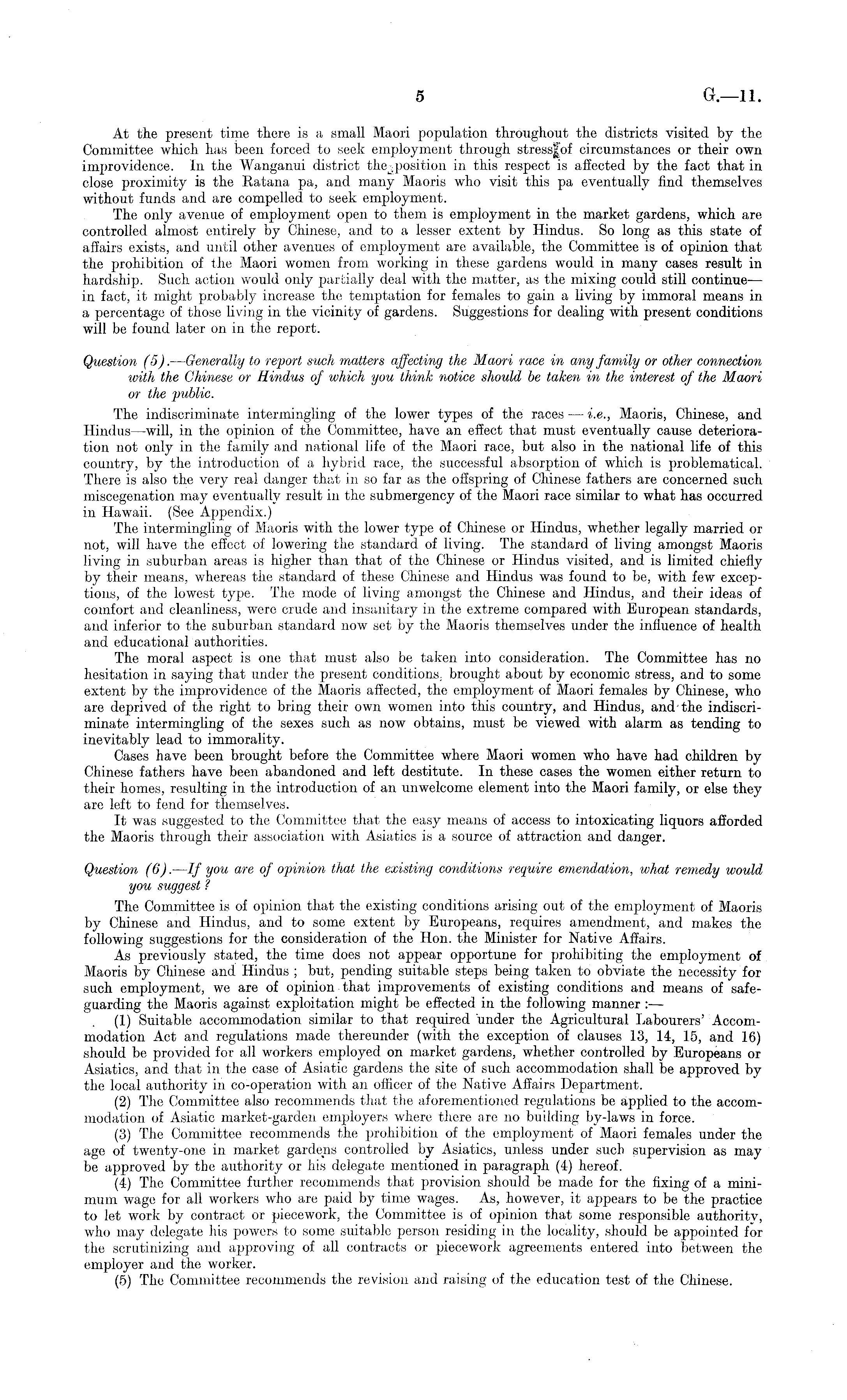 At the present time there is a small Maori population throughout the districts visited by the Committee which has been forced to seek employment through stressfof circumstances or their own improvidence. In the Wanganui district in this respect is affected by the fact that in close proximity is the Ratana pa, and many Maoris who visit this pa eventually find themselves without funds and are compelled to seek employment. The only avenue of employment open to them is employment in the market gardens, which are controlled almost entirely by Chinese, and to a lesser extent by Hindus. So long as this state of affairs exists, and until other avenues of employment are available, the Committee is of opinion that the prohibition of the Maori women from working in these gardens would in many cases result in hardship. Such action would only partially deal with the matter, as the mixing could still continue — in fact, it might probably increase the temptation for females to gain a living by immoral means in a percentage of those living in the vicinity of gardens. Suggestions for dealing with present conditions will be found later on in the report. Question (5). —Generally to report such matters affecting the Maori race in any family or other connection with the Chinese or Hindus of which you think notice should be taken in the interest of the Maori or the public. The indiscriminate intermingling of the lower types of the races — i.e., Maoris, Chinese, and Hindus —will, in the opinion of the Committee, have an effect that must eventually cause deterioration not only in the family and national life of the Maori race, but also in the national life of this country, by the introduction of a hybrid race, the successful absorption of which is problematical. There is also the very real danger that in so far as the offspring of Chinese fathers are concerned such miscegenation may eventually result in the submergency of the Maori race similar to what has occurred in Hawaii. (See Appendix.) The intermingling of Maoris with the lower type of Chinese or Hindus, whether legally married or not, will have the effect of lowering the standard of living. The standard of living amongst Maoris living in suburban areas is higher than that of the Chinese or Hindus visited, and is limited chiefly by their means, whereas the standard of these Chinese and Hindus was found to be, with few exceptions, of the lowest type. The mode of living amongst the Chinese and Hindus, and their ideas of comfort and cleanliness, were crude and insanitary in the extreme compared with European standards, and inferior to the suburban standard now set by the Maoris themselves under the influence of health and educational authorities. The moral aspect is one that must also be taken into consideration. The Committee has no hesitation in saying that under the present conditions, brought about by economic stress, and to some extent by the improvidence of the Maoris affected, the employment of Maori females by Chinese, who are deprived of the right to bring their own women into this country, and Hindus, and the indiscriminate intermingling of the sexes such as now obtains, must be viewed with alarm as tending to inevitably lead to immorality. Cases have been brought before the Committee where Maori women who have had children by Chinese fathers have been abandoned and left destitute. In these cases the women either return to their homes, resulting in the introduction of an unwelcome element into the Maori family, or else they are left to fend for themselves. It was suggested to the Committee that the easy means of access to intoxicating liquors afforded the Maoris through their association with Asiatics is a source of attraction and danger. Question (6). —If you are of opinion that the existing conditions require emendation, what remedy would you suggest ? The Committee is of opinion that the existing conditions arising out of the employment of Maoris by Chinese and Hindus, and to some extent by Europeans, requires amendment, and makes the following suggestions for the consideration of the Hon. the Minister for Native Affairs. As previously stated, the time does not appear opportune for prohibiting the employment of Maoris by Chinese and Hindus ; but, pending suitable steps being taken to obviate the necessity for such employment, we are of opinion that improvements of existing conditions and means of safeguarding the Maoris against exploitation might be effected in the following manner : — (1) Suitable accommodation similar to that required under the Agricultural Labourers' Accommodation Act and regulations made thereunder (with the exception of clauses 13, 14, 15, and 16) should be provided for all workers employed on market gardens, whether controlled by Europeans or Asiatics, and that in the case of Asiatic gardens the site of such accommodation shall be approved by the local authority in co-operation with an officer of the Native Affairs Department. (2) The Committee also recommends that the aforementioned regulations be applied to the accommodation of Asiatic market-garden employers where there are no building by-laws in force. (3) The Committee recommends the prohibition of the employment of Maori females under the age of twenty-one in market gardens controlled by Asiatics, unless under such supervision as may be approved by the authority or his delegate mentioned in paragraph (4) hereof. (4) The Committee further recommends that provision should be made for the fixing of a minimum wage for all workers who are paid by time wages. As, however, it appears to be the practice to let work by contract or piecework, the Committee is of opinion that some responsible authoritv, who may delegate his powers to some suitable person residing in the locality, should be appointed for the scrutinizing and approving of all contracts or piecework agreements entered into between the employer and the worker. (5) The Committee recommends the revision a