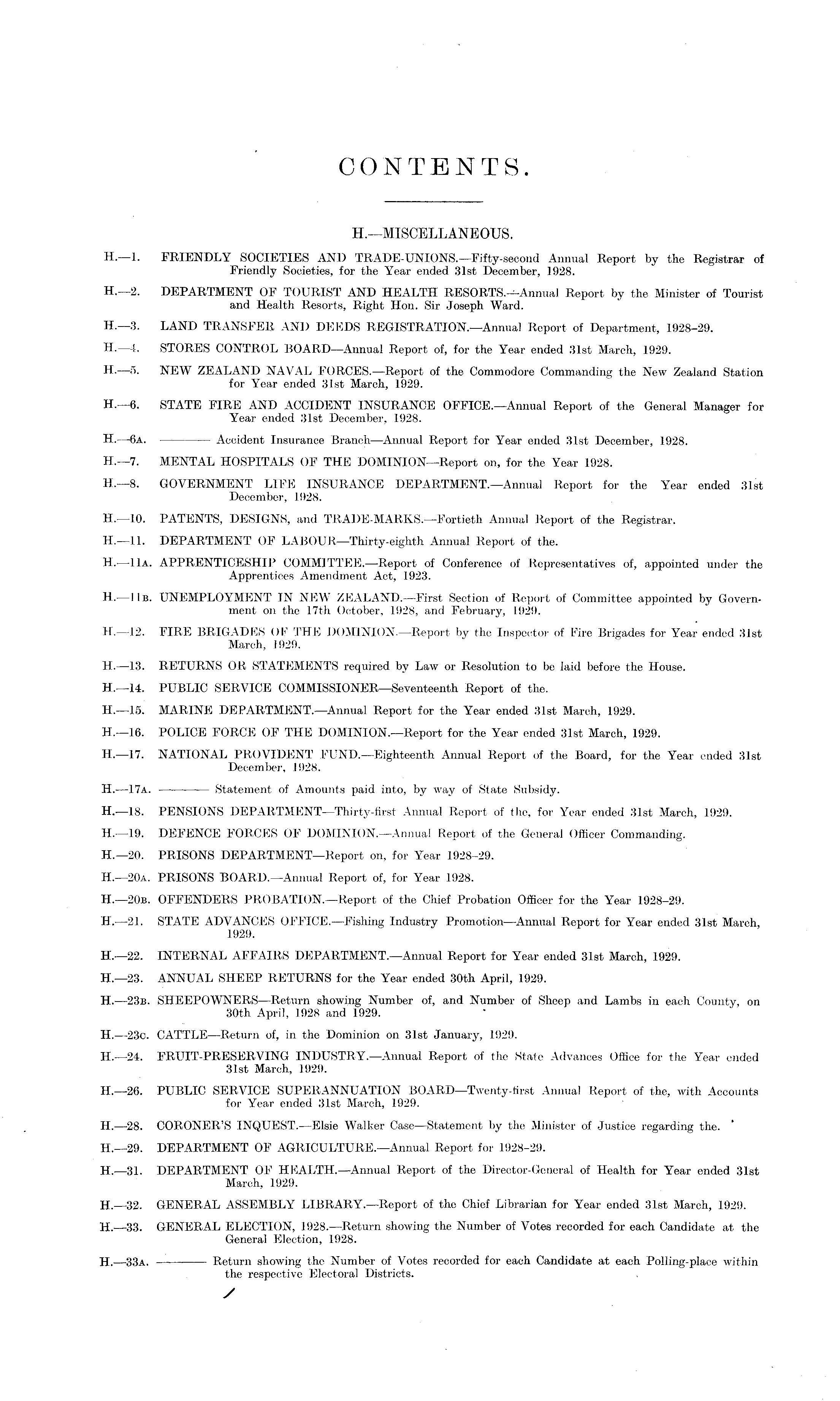 H.—MISCELLANEOUS. H.—l. FRIENDLY SOCIETIES AND TRADE-UNIONS.—Fifty-second Annual Report by the Registrar of Friendly Societies, for the Year ended 31st December, 1928. H.—2. DEPARTMENT OF TOURIST AND HEALTH Report by the Minister of Tourist and Health Resorts, Right Hon. Sir Joseph Ward. H.—3. LAND TRANSFER AND DEEDS REGISTRATION.—AnnuaI Report of Department, 1928-29. H. —4. STORES CONTROL BOARD—Annual Report of, for the Year ended 31st March, 1929. H.—s. NEW ZEALAND NAVAL FORCES. —Report of the Commodore Commanding the New Zealand Station for Year ended 31st March, 1929. H.—6. STATE FIRE AND ACCIDENT INSURANCE OFFICE.—Annual Report of the General Manager for Year ended 31st December, 1928. H.—6a. Accident Insurance Branch—Annual Report for Year ended 31st December, 1928. H.—7. MENTAL HOSPITALS OF THE DOMINION—Report on, for the Year 1928. H. —8. GOVERNMENT LIFE INSURANCE DEPARTMENT. —Annual Report for the Year ended 31st December, 1928. H. —10. PATENTS, DESIGNS, and TRADE-MARKS. —Fortieth Annual Report of the Registrar. H.—ll. DEPARTMENT OF LABOUR—Thirty-eighth Annual Report of the. H.—lla. APPRENTICESHIP COMMITTEE. —Report of Conference of Representatives of, appointed under the Apprentices Amendment Act, 1923. H.—lle. UNEMPLOYMENT IN NEW ZEALAND.—First Section of Report of Committee appointed by Government on the 17th October, 1928, and February, 1929. H.—l2. FIRE BRIGADES OF THE DOMINION, —Report by the Inspector of Fire Brigades for Year ended 31st March, 1929. H. —13. RETURNS OR STATEMENTS required by Law or Resolution to be laid before the House. H.—l4. PUBLIC SERVICE COMMISSIONER—Seventeenth Report of the. H.—ls. MARINE DEPARTMENT.—AnnuaI Report for the Year ended 31st March, 1929. H.—l6. POLICE FORCE OF THE DOMINION.—Report for the Year ended 31st March, 1929. H.—l7. NATIONAL PROVIDENT FUND.—Eighteenth Annual Report of the Board, for the Year ended 31st December, 1928. H. —17a. Statement of Amounts paid into, by way of State Subsidy. H. —18. PENSIONS DEPARTMENT —Thirty-first Annual Report of the, for Year ended 31st March, 1929. H. —19. DEFENCE FORCES OF DOMINION. —Annual Report of the General Officer Commanding. H.—2o. PRISONS DEPARTMENT—Report on, for Year 1928-29. H.—2oa. PRISONS BOARD.—Annual Report of, for Year 1928. H.—2ob. OFFENDERS PROBATION. —Report of the Chief Probation Officer for the Year 1928-29. H.—2l. STATE ADVANCES OFFlCE.—Fishing Industry Promotion —Annual Report for Year ended 31st March, 1929. H.—22. INTERNAL AFFAIRS DEPARTMENT. —Annual Report for Year ended 31st March, 1929. H.—23. ANNUAL SHEEP RETURNS for the Year ended 30th April, 1929. H. —23b. SHEEPOWNERS —Return showing Number of, and Number of Sheep and Lambs in each County, on 30th April, 1928 and 1929. H.—23c. CATTLE —Return of, in the Dominion on 31st January, 1929. H. —24. FRUIT-PRESERVING INDUSTRY. —Annual Report of the State Advances Office for the Year ended 31st March, 1929. H.—26. PUBLIC SERVICE SUPERANNUATION BOARD—Twenty-first Annual Report of the, with Accounts for Year ended 31st March, 1929. H.—2B. CORONER'S INQUEST. —Elsie Walker Case —Statement by the Minister of Justice regarding the. H.—29. DEPARTMENT OF AGRICULTURE.—AnnuaI Report for 1928-29. H.—3l. DEPARTMENT OF HEALTH.—AnnuaI Report of the Director-General of Health for Year ended 31st March, 1929. H. —32. GENERAL ASSEMBLY LIBRARY. —Report of the Chief Librarian for Year ended 31st March, 1929. H.—33. GENERAL ELECTION, 1928.—Return showing the Number of Votes recorded for each Candidate at the General Election, 1928. H.—33a. Return showing the Number of Votes recorded for each Candidate at each Polling-place within the respective Electoral Districts. y