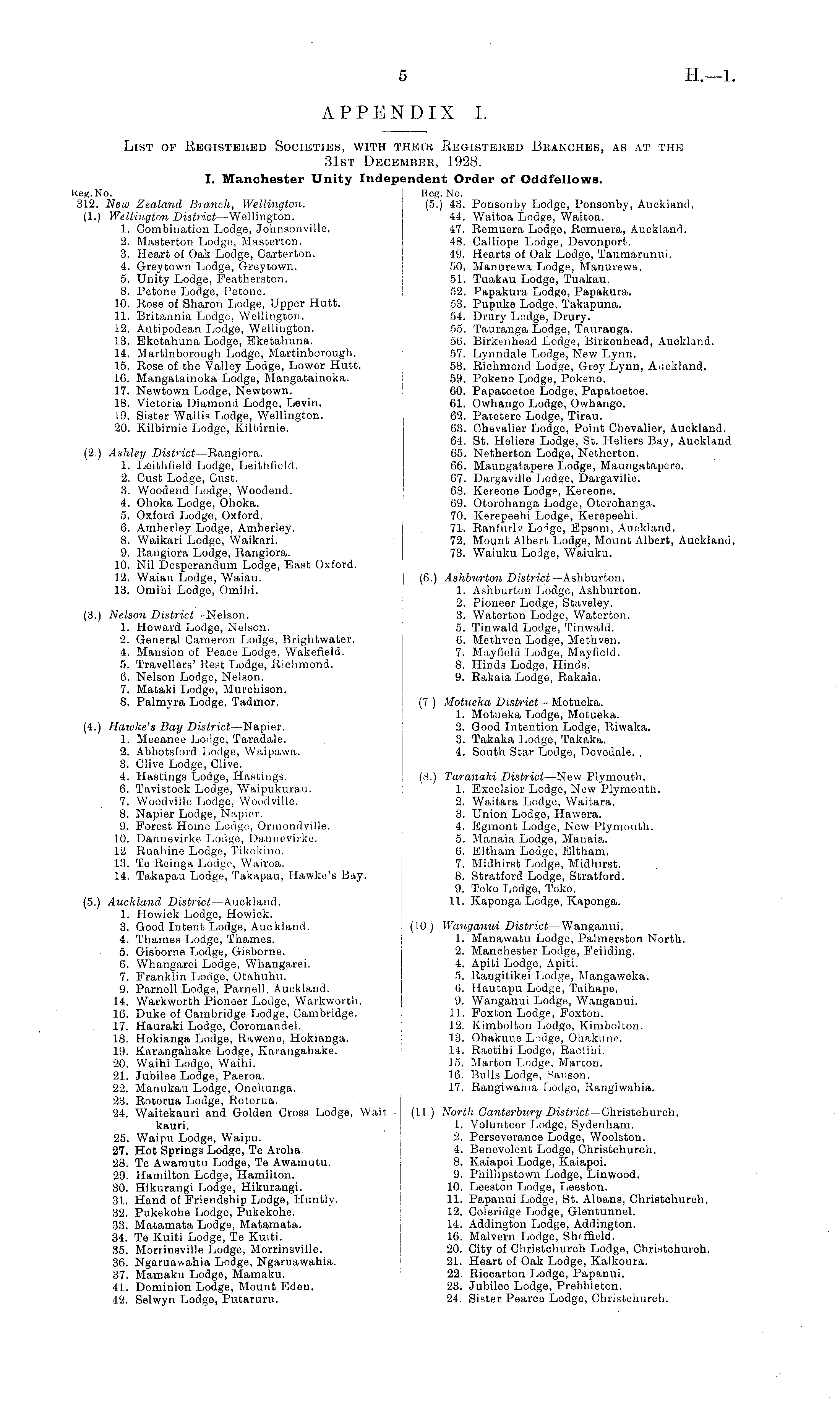 APPENDIX I. List op Registered Societies, with theik Registered Branches, as at the 31st December, 1928. I. Manchester Unity Independent Order of Oddfellows. Keg. No. Reg. No. 312. New Zealand Branch, Wellington. (5.) 43. Ponsonby Lodge, Ponsonby, Auckland. (1.) Wellington District—Wellington. 44. Waitoa Lodge, Waitoa. 1. Combination Lodge, Johnsonville. 47. Remuera Lodge, Remuera, Auckland. 2. Masterton Lodge, Mastercon. 48. Calliope Lodge, Devonport. 3. Heart of Oak Lodge, Carterton. j 49. Hearts of Oak Lodge, Taumarunui. 4. Greytown Lodge, Greytown. 50, Manurewa Lodge, Manurewa. 5. Unity Lodge, Featherston. 51. Tuakau Lodge, Tuakau. 8. Petone Lodge, Petone. 52. Papakura Lodge, Papakura. 10. Rose of Sharon Lodge, Upper Hutt. 53. Pupuke Lodge. Takapuna. 11. Britannia Lodge, Wellington. 54. Drury Lodge, Drury. 12. Antipodean Lodge, Wellington. 55. Tauranga Lodge, Tauranga. 13. Eketahuna Lodge, Eketahuna. 56. Birkenhead Lodge, Birkenhead, Auckland. 14. Martinborough Lodge, Martinborough. 57. Lynndale Lodge, New Lynn. 15. Rose of the Valley Lodge, Lower Hutt. 58. Richmond Lodge, Grey Lynn, Auckland. 16. Mangatainoka Lodge, Mangatainoka. 59. Pokeno Lodge, Pokeno. 17. Newtown Lodge, Newtown. 60. Papatoetoe Lodge, Papatoetoe. 18. Victoria Diamond Lodge, Levin. 61. Owhango Lodge, Owhango. 19. Sister Wallis Lodge, Wellington. 62. Patetere Lodge, Tirau. 20. Kilbirnie Lodge, Kilbirnie. 63. Chevalier Lodge, Point Chevalier, Auckland. 64. St. Heliers Lodge, St. Heliers Bay, Auckland (2.) Ashley District—Rangiora. 65. Netherton Lodge, Netherton. 1. Leithfield Lodge, Leithfield. 66. Maungatapere Lodge, Maungatapere. 2. Cust Lodge, Cust. 67. Dargaville Lodge, Dargaville. 3. Woodend Lodge, Woodend. 68. Kereone Lodge, Kereone. 4. Ohoka Lodge, Ohoka. 69. Otorohanga Lodge, Otorohanga. 0. Oxford Lodge, Oxford. ! 70. Kerepeehi Lodge, Kerepeehi. 6. Amberley Lodge, Amberley. 71. Ranfurlv Lodge, Epsom, Auckland. 8. Waikari Lodge, Waikari. 72. Mount Albert Lodge, Mount Albert, Auckland, 9. Rangiora Lodge, Rangiora. 73. Waiuku Lodge, Waiuku. 10. Nil Desperandum Lodge, East Oxford. 12. Waiau Lodge, Waiau. (6.) Ashburton District—Ashburton. 13. Omihi Lodge, Omihi. 1. Ashburton Lodge, Ashburton. 2. Pioneer Lodge, Staveley. (3.) Nelson District—Nelson. 3. Waterton Lodge, Waterton. 1. Howard Lodge, Nelson. 5. Tinwald Lodge, Tinwald. 2. General Cameron Lodge, Brightwater. 6. Methven Lodge, Methven. 4. Mansion of Peace Lodge, Wakefield. 7. Mayfield Lodge, Mayfield. 5. Travellers' Rest Lodge, Richmond. 8. Hinds Lodge, Hinds. 6. Nelson Lodge, Nelson. 9. Rakaia Lodge, Rakaia. 7. Mataki Lodge, Murohison. 8. Palmyra Lodge, Tadmor. (7.) Motueka District—Motueka. 1. Motueka Lodge, Motueka. (4.) Hawke's Bay District —Napier. 2. Good Intention Lodge, Riwaka. 1. Meeanee Lodge, Taradale. 3. Takaka Lodge, Takaka. 2. Abbotsford Lodge, Waipawa. 4. South Star Lodge, Dovedale. , 3. Clive Lodge, Clive. 4. Hastings Lodge, Hastings. (8.) Taranahi District —New Plymouth. 6. Tavistock Lodge, Waipukurau. 1. Excelsior Lodge, New Plymouth. 7. Woodville Lodge, Woodville. 2. Waitara Lodge, Waitara. 8. Napier Lodge, Napier. 3. Union Lodge, Hawera. 9. Forest Home Lodge, Ormondville. 4. Egmont Lodge, New Plymouth. 10. Dannevirke Lodge, Dannevirke. 5. Manaia Lodge, Manaia. 12 Rualiine Lodge, Tikokino. 6. Eltham Lodge, Eltham. 13. Te Reinga Lodge, Wairoa. 7. Midhirst Lodge, Midhirst. 14. Takapau Lodge, Takapau, Hawke's Bay. 8. Stratford Lodge, Stratford. 9. Toko Lodge, Toko. (5.) Auckland District —Auckland. 11. ICaponga Lodge, Kaponga. 1. Howick Lodge, Howick. 3. Good Intent Lodge, Auckland. (10.) Wanganui District —Wanganui. 4. Thames Lodge, Thames. 1. Manawatu Lodge, Palmerston North. 5. Gisborne Lodge, Gisborne. 2. Manchester Lodge, Feilding. 6. Whangarei Lodge, Whangarei. 4. Apiti Lodge, Apiti. 7. Franklin Lodge, Otahuhu. 5. Rangitikei Lodge, Marigaweka. 9. Parnell Lodge, Parnell, Auckland. 0. Hautapu Lodge, Taihape. 14. Warkworth Pioneer Lodge, Warkworth. 9. Wanganui Lodge, Wanganui. 16. Duke of Cambridge Lodge, Cambridge. 11. Foxton Lodge, Foxton. 17. Hauraki Lodge, Coromandel. 12. Kimbolton Lodge, Kimbolton. 18. Hokianga Lodge, Rawene, Hokianga. 13. Ohakune Lidge, Ohaktine. 19. Karangahake Lodge, Karangahake. 14. Raetihi Lodge, Raetihi. 20. Waihi Lodge, Waihi. 15. Marton Lodge, Martou. 21. Jubilee Lodge, Paeroa. 16. Bulls Lodge, Sanson. 22. Manukau Lodge, Onehunga. 17. Rangiwahia Lodge, Rangiwahia. 23. Rotorua Lodge, Rotorua. 24. Waitekauri and Golden Cross Lodge, Wait - (11.) North Canterbury District—Christchurcli. kauri, 1. Volunteer Lodge, Sydenham. 25. Waipu Lodge, Waipu. 2. Perseverance Lodge, Woolston. 27. Hot Springs Lodge, Te Aroha. 4. Benevolent Lodge, Christchurch. 28. Te Awamutu Lodge, Te Awamutu. 8. Kaiapoi Lodge, Kaiapoi. 29. Hamilton Lodge, Hamilton. 9. Phillipstown Lodge, Linwood. 30. Hikurangi Lodge, Hikurangi. 10. Leeston Lodge, Leeston. 31. Hand of Friendship Lodge, Huntlv. 11. Papanui Lodge, St. Albans, Christchuroh. 32. Pukekohe Lodge, Pukekohe. 12. Coleridge Lodge, Glentunnel. 33. Matamata Lodge, Matamata. 14. Addington Lodge, Addington. 34. Te Kuiti Lodge, Te Kuiti. | 16. Malvern Lodge, Shfffield. 35. Morrinsville Lodge, Morrinsville. 20. City of Christchurch Lodge, Christchurch. 36. Ngaruawa'nia Lodge, Ngaruawahia. 21. Heart of Oak Lodge, Kaikoura. 37. Mamaku Lodge, Mamaku. 22. Riccarton Lodge, Papanui. 41. Dominion Lodge, Mount Eden. 23. Jubilee Lodge, Prebbleton. 42. Selwyn Lodge, Putaruru. \ 24. Sister Pearce Lodge, Christchurch.