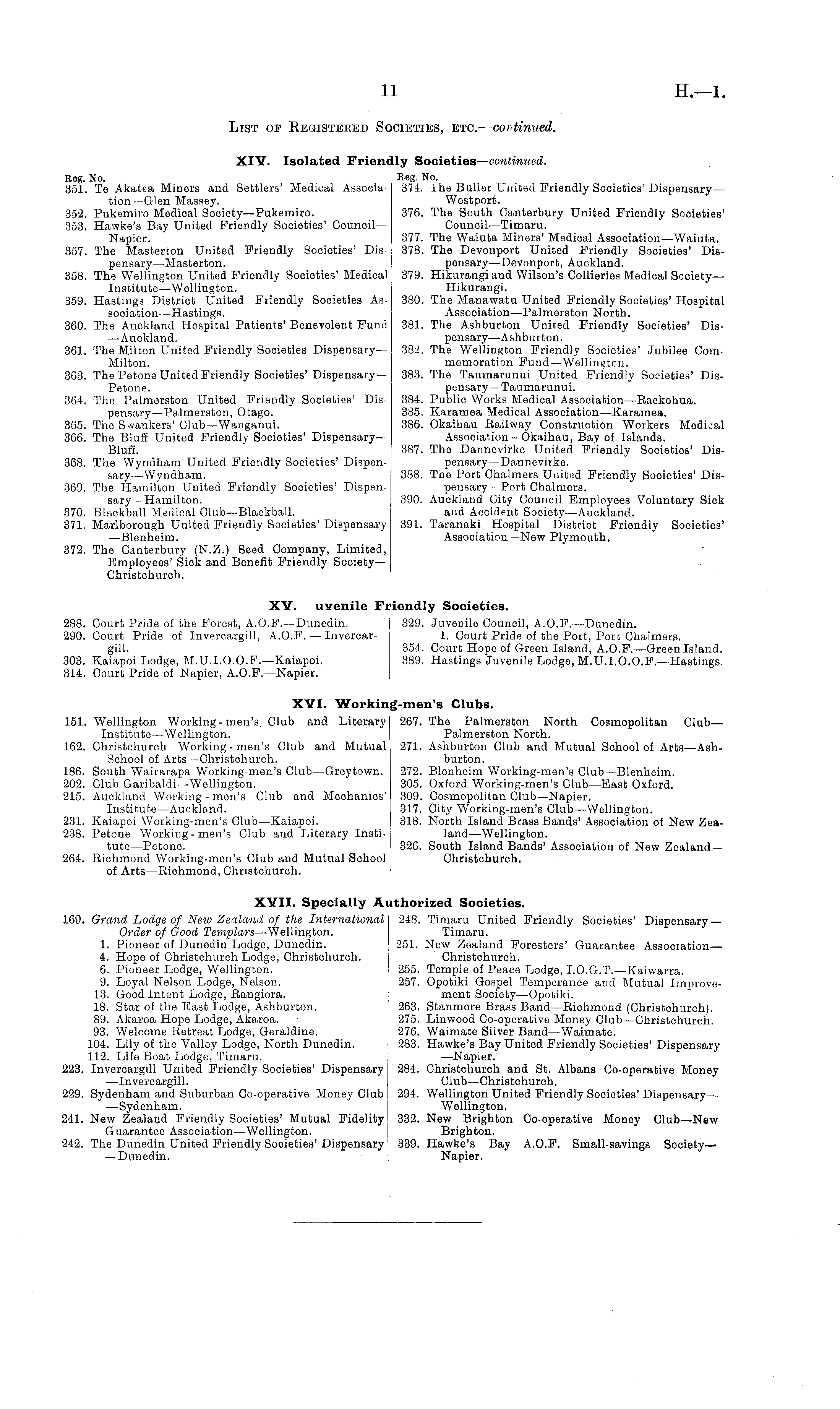 List of Registered Societies, etc. —continued. XIV. Isolated Friendly Societies —continued. Reg. No. Reg. No. 351. Te Akatea Miners and Settlers' Medical Assoeia- 374. ihe Buller United Friendly Societies' Dispensary— tion —Glen Massey. Westport. 352. Pukemiro Medical Society—Pukemiro. 376. The South Canterbury United Friendly Societies' 353. Hawke's Bay United Friendly Societies' Council — Council —Timaru. Napier. 377. The Waiuta Miners' Medical Association—Waiuta. 357. The Masterton United Friendly Societies' Dis- 378. The Devonport United Friendly Societies' Dispensary —Masterton. pensary—Devonport, Auckland. 358. The Wellington United Friendly Societies' Medical 379. Hikurangi and Wilson's Collieries Medical Society— Institute —Wellington. Hikurangi. 359. Hastings District United Friendly Sooieties As- 380. The Manawatu United Friendly Societies' Hospital sociation—Hastings. Association —Palmerston North. 360. The Auckland Hospital Patients' Benevolent Fund 381. The Ashburton United Friendly Societies' Dis—Auckland. pensary—Ashburton. 361. The Milcon United Friendly Societies Dispensary— 382. The Wellington Friendly Societies' Jubilee ComMilton. metnoration Fund—Wellington. 363. The Petone United Friendly Societies' Dispensary— 383. The Taumarunui United Friendly Societies' DisPetone. pensary—Taumarunui. 364. The Palmerston United Friendly Societies' Dis- 384. Public Works Medioal Association—Raekohua. pensary—Palmerston, Otago. 385. Karamea Medical Association—Karamea. 365. The Swankers' Club—Wanganui. 386. Okaihau Railway Construction Workers Medical 366. The Bluff United Friendly Societies' Dispensary— Association—Okaihau, Bay of Islands. Bluff. 387. The Dannevirke United Friendly Societies' Dis--368. The Wyndham United Friendly Societies' Dispen- pensary—Dannevirke. sary—Wyndham. 388. The Port Chalmers United Friendly Societies' Dis--369. The Hamilton United Friendly Societies' Dispen- pensary- Port Chalmers. sary Hamilton. 390. Auckland City Council Employees Voluntary Sick 370. Blackball Medical Club —Blackball. ana Accident Society—Auckland. 371. Marlborough United Friendly Societies' Dispensary 391. Taranaki Hospital District Friendly Societies' —Blenheim. Association—New Plymouth. 372. The Canterbury (N.Z.) Seed Company, Limited, Employees' Sick and Benefit Friendly Society— Christchurch. XV. uvenile Friendly Societies. 288. Court Pride of the Forest, A.O.F.—Dunedin. | 329. Juvenile Council, A.O.F.—Dunedin. 290. Court Pride of Invercargill, A.O.F. — Invercar- 1. Court Pride of the Port, Pore Chalmers. gill. 354. Court Hope of Green Island, A.O.F.—Greenlsland. 303. Kaiapoi Lodge, M.U.1.0.0.F. —Kaiapoi. 389. Hastings Juvenile Lodge, M.U.1.0.0.F. —Hastings. 314. Court Pride of Napier, A.O.F.—Napier. XVI. Working-men's Clubs. 151. Wellington Working-men's. Club and Literary 267. The Palmerston North Cosmopolitan Club— Institute—Wellington. Palmerston North. 162. Christchurch Working-men's Club and Mutual 271. Ashburton Club and Mutual School of Arts—AshSchool of Arts—Christchurch. burton. 186. South Wairarapa Working-men's Club—Greytown. 272. Blenheim Working-men's Club—Blenheim. 202. Club Garibaldi —Wellington. 305. Oxford Working-men's Club—East Oxford. 215. Auckland Working-men's Club and Meohanics' 309. Cosmopolitan Club —Napier. Institute—Auckland. 317. City Working-men's Club—Wellington. 231. Kaiapoi Working-men's Club —Kaiapoi. 318. North Island Brass Bands' Association of New Zea--238. Petone Working-men's Club and Literary Insti- land—Wellington. tute—Petone. 326. South Island Bands' Association of New Zealand — 264. Richmond Working-men's Club and Mutual School Christchurch. of Arts —Richmond, Christchurch. XVII. Specially Authorized Societies. 169. Grand Lodge of New Zealand of the International 248. Timaru United Friendly Societies' Dispensary — Order of Good Templars—Wellington. Timaru. 1. Pioneer of Dunedin Lodge, Dunedin. 251. New Zealand Foresters' Guarantee Association— 4. Hope of Christchurch Lodge, Christchurch. Christchurch. 6. Pioneer Lodge, Wellington. 255. Temple of Peace Lodge, I.O.G.T.—Kaiwarra. 9. Loyal Nelson Lodge, Nelson. 257. Opotiki Gospel. Temperance and Mutual Improve--13. Good Intent Lodge, Rangiora. ment Society—Opotiki. 18. Star of the East Lodge, Ashburton. 263. Stanmore Brass Band—Richmond (Christchurch). 89. Akaroa Hope Lodge, Akaroa. 275. Linwood Co-operative Money Club—Christchurch. 93. Welcome Retreat Lodge, Geraldine. 276. Waimate Silver Band—Waimate. 104. Lily of the Valley Lodge, North Dunedin. 283. Hawke's Bay United Friendly Societies' Dispensary 112. Life Boat Lodge, Timaru. —Napier. 223. Invercargill United Friendly Societies' Dispensary 284. Christchurch and St. Albans Co-operative Money • —lnvercargill. Club—Christchurch. 229. Sydenham and Suburban Co-operative Money Club 294. Wellington United Friendly Societies' Dispensary— —Sydenham. Wellington. 241. New Zealand Friendly Societies' Mutual Fidelity 332. New Brighton Co-operative Money Club—New Guarantee Association —Wellington. Brighton. 242. The Dunedin United Friendly Societies' Dispensary 339. Hawke's Bay A.O.F. Small-savings Society— — Dunedin. Napier.
