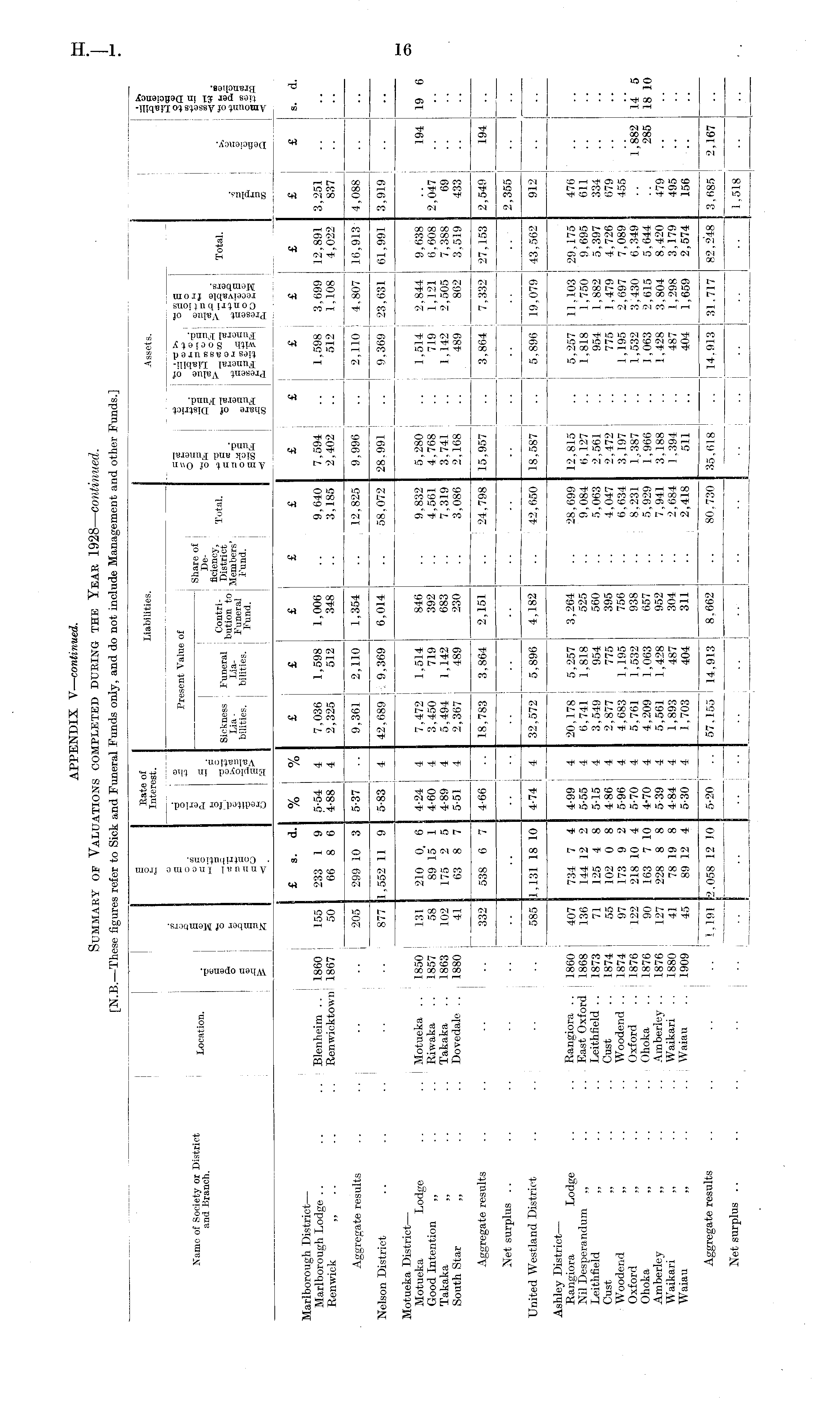 KJ U1VJ.iUAfl X UI Y dUUfliiUilO uui'i-i UiilXJi-' *-> KJ xvxx\ \_T JLJJL.1I1 -1_ JJJxlXv it/flU W/W/C^M-C/W. [N.B. —These figures refer to Sick and Funeral Funds only, and do not include Management and other Funds.] | Interest. Liabilities. Assets. || o ; j 1 — o % J Present Value of £ °5®-p | °§n ° ■ -r* © 2 i3 • 2 M ® • 1 -2 ° ,2c! Name of Society or District Toration I $ - ' ; r - Share of g .2d a-Sp-l £"~ and Branch. Location. ■§" g 5-2 * -2 d \ De- -gfi fig ■§£«. Jl;j . I -£ 6 oS Sickness Funeral b^™*: ri , TMstrict TotaL eg "Sa '' , 3j tD '3 Total - >• o s| & 8 SS I |S Lia- Lia- b ~° Members' s"-B I %% Z 2 I t*S g a ag S a,* bilities. I bilities. j -Fund. ! o-g g g 3 |g»|gg 0 g| 3 - s ggg Si So % I ! ■ a as §£ gSsSfi & <§ p£ j £ & o. S h I! «!$££ £ s. d. % % £ £ £ £ £ £ £ £ £ £ £ £ s. d. Marlborough District — Marlborough Lodge .. .. .. Blenheim.. 1860 155 233 1 9 5-54 4 7,036 1,598 1,006 .. 9,640 7,594 .. 1,598 3,699 12,891 3,251 Renwick „ .. .. Renwicktown 1867 50 66 8 6 4-88 4 2,325 512 348 .. 3,185 2,402 .. 512 1,108 4,022 837 Aggregate results .. .. : •• 205 299 10 3 5-37 .. 9,361 2,110 1,354 .. 12,825 9,996 .. 2,110 4,807 16,913 4,088 Nelson District .. .. .. .. .. 877 1,552 11 9 5-83 4 42,689 .9,369 6,014 .. 58,072 28.991 .. 9,369 | 23,631 61,991 3,919 Motueka District — ; Motueka Lodge .. .. Motueka .. 1850 131 210 0. 6 4-24 4 7,472 1,514 846 .. 9,832 5,280 .. 1,514! 2,844 9,638 .. 194 19 6 Good Intention „ .. .. Riwaka .. 1857 58 89 15 1 4-60 4 3,450 719 392 .. 4,561 4.768 .. 719 1,121 6,608 2,047 Takaka „ .. .. Takaka .. 1863 102 175 2 5 4-89 4 5,494 1,142 683 .. 7,319 3.741 .. 1,142 2,505 7,388 69 South Star „ .. .. Dovedale .. 1880 41 63 8 7 5-51 4 2,367 489 230 .. 3,086 2,168 .. 489 862 3,519 433 Aggregate results .. .. .. .. 332 538 6 7 4-66 .. 18,783 3,864 2,151 .. 24,798 15,957 .. 3,864! 7,332 27,153 2,549 194 Net surplus .. . . .. .. .. .. .. .. .. .. .. .. .. .. .... .. .. .. 2,355 United Westland District .. .. .. .. 585 1,131 18 10 4-74 4 32,572 5,896 4,182 .. 42,650 18,587 .. 5,896 19,079 43,562 912 Ashley District — Rangiora Lodge .. .. Rangiora .. 1860 407 734 7 4 4-99 4 20,178 5,257 3,264 .. 28,699 12,815 .. 5,257 11,103 29,175 476 Nil Desperandum „ .. .. East Oxford 1868 136 144 12 2 5-55 4 6,741 1.818 525 .. 9,084 6,127 .. 1,818 1,750 9,695 611 Leithfield „ .. .. Leithfield.. 1873 71 125 4 8 5-15 4 3,549 954 560 .. 5,063 2,561 .. 954 1,882 5,397 334 Cust „ .. .. Oust .. 1874 55 102 0 8 4 86 4 2,877 775 395 .. 4,047 2,472 .. 775 1.479 4,726 679 Woodend „ .. .. Woodend .. 1874 97 173 9 2 5-96 4 4,683 1,195 756 .. 6,634 3,197 .. 1,195 2,697 7,089 455: Oxford „ .. .. Oxford .. 1876 122 218 10 4 5-70 4 5,761 1,532 938 .. 8,231 1,387 .. 1,532 3,430 6,349 .. i 1,882 14 5 Ohoka „ .. .. Ohoka .. 1876 90 163 7 10 4-70 4 4,209 1,063 657 .. 5,929 1,966 .. ],063 2,615 5,644 ... 285 18 10 Amberley „ .. .. Amberley .. 1876 127 228 8 8 5-39 4 5,561 1,428 952 .. 7,941 3.188 .. 1,428 3,804 8,420 479' Waikari „ .. .. Waikari .. 1880 41 78 19 8 4-84 4 1,893 487 304 .. 2,684 1.394 .. 487 1,298 3,179 495 Waiau „ .. .. Waiau .. 1909 45 89 12 4 5-30 4 1,703 404 311 .. 2,418 511 .. 404 1,659 2,574 156 Aggregate results .. .. .. .. 1,191 2,058 12 10 5-20 .. 57,155 14,913 8,662 .. 80,730 35,618 .. 14,913 31.717 82,248 3,685 2,167 Net surplus .. .. .. . . . . .. .. .. .. .. .. .. .. .. .. | . .. .. 1,518
