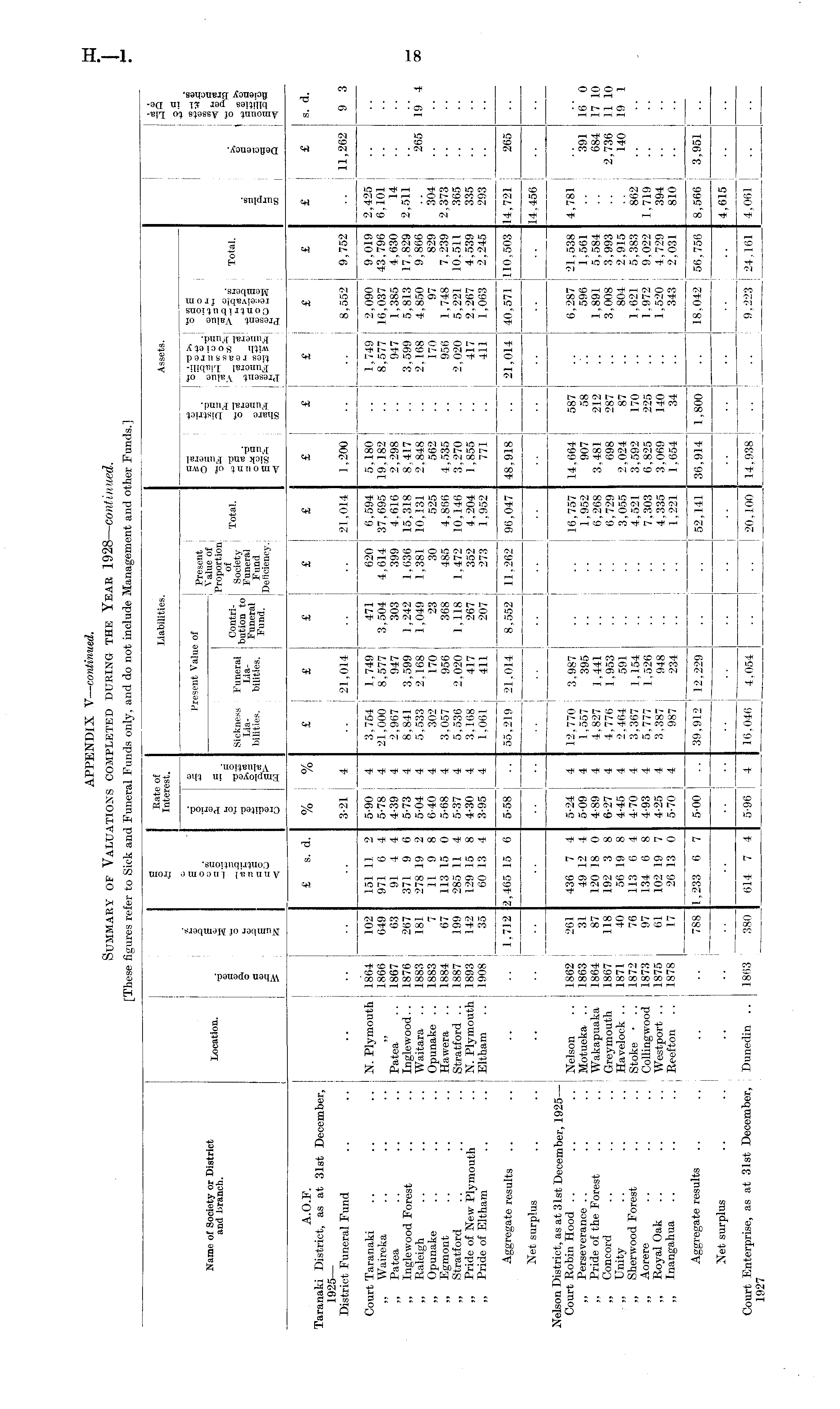 [These figures refer to Sick and Funeral Funds only, and do not include Management and other Funds.] | Interest. Liabilities. Assets. I o.S « c - 1 ' ~ I i | i tn ' I oa o S ~ Valnp of i o ® I j J2 rj 5M o . .2 =3 Jrresenc value oi Present j ££ V . £ £% . .2° ©■*£ Name of Society or District TnnatinTi § ? - Value of i § a»-oc § and branch. Lorat ' on - * j f.2 * -5 fi . Proportion! *£ «| «S| | = e « & 2 E ° Sickness Funeral Society : rota1 ' r|. 'Sg a 2 j! Total - & 1 °g& & S 2s ® §■§ Ua- Lia- ° Funeral g - § - - S «c~a 3 g a| | 5 1 sg §1,3 biUties. bilities. | Fund o|§ £§l§SS§§o§J -3, S gg-g ja § co 9 * un<t ' Deficiency. So £S b "SI <3 O W | <! OQ Pn PM CO|Q|^ A.O.F. j £ s. a. % % £ £ £ £ £ £ £ £ £ £ £ £ s. d. Taranaki District, as at 31st December, ! 1925— District Funeral Fund .. .. .. .. .. .. 3-21 j 4 .. 21,014 .. .. 21,014 1,200 .. .. 8,552 9,752 .. 1 11,262 9 3 Court Taranaki .. .. .. 'N.Plymouth 1864 102 151 11 2 5-90 4 3,754 1,749 471 620 6,594 5,180 .. 1,749 2,090 9,019 2,425 „ Waireka .. .. .. ■ „ 1866 649 971 6 4 5-78 4 21,000 8,577 3,504 4,614 37,695 19.182 .. 8,577 16,037 43,796 6,101 „ Patea .. .. .. j Patea .. 1867 63 91 4 4 4-39 4 2,967 947 303 399 4.616 2,298 .. 947 1,385 4,630 14 „ Inglewood Forest .. .. i Inglewood.. 1876 267 371 9 6 5-73 4 8,841 3,599 1,242 1.636 15,318 8.417 .. 3,599 5,813 17,829 2,511 „ Raleigh .. .. ..I Waitara .. 1883 181 278 19 2 5-04 4 5,533 2,168 1,049 1,381 10,131 2,848 .. 2.168 4,850 9,866 .. 265 19 4 „ Opunake .. .. .. Opunake .. 1883 7 11 9 8 6-40 4 302 170 23 30 525 562 .. 170 97 829 304 „ Egmont .. .. ... Hawera .. 1884 67 .113 15 0 5-68 4 3,057 956 368 485 4,866 4,535 .. 956 1,748 7,239 2,373 „ Stratford .. .. .. Stratford .. 1887 199 285 11 4 5-37 4 5,536 2,020 1,118 1.472 10,146 3,270 .. 2,020 5,221 10.511 365 „ Pride of New Plymouth .. 1 N. Plymouth 1893: 142 129 15 8 4-30 4 3,168 417 267 352 4,204 1,855 .. 417 2.267 4,539 335 „ Pride of Eltham .. .. Eltham .. 1908 35 60 13 4 3-95 4 1,061 411 207 273 1,952 771 .. 411 1,063 2,245 293 Aggregate results .. .. .. 1,712 2,465 15 6 5-58 .. 55,219 21,014 8,552 11,262 96,047 48,918 .. 21,014 40,571 110,503 14,721 265 Net surplus .. .. j .. I .. .. .. .. .. .. .. .. .. .. .. .. .. 14,456 Nelson District, as at 31st December, 1925 — Court Robin Hood .. .. .. Nelson .. 1862 261 436 7 4 5-24 4 12,770 3,987 .. .. 16,757 14,664 587 .. 6,287 | 21,538 4,781 „ Perseverance .. .. .. Motueka .. 1863 31 49 12 4 5-09 4 1,557 395 .. .. 1,952 907 58 .'. 596 1,561 .. 391 16 0 „ Pride of the Forest .. .. Wakapuaka 1864 87 120 18 0 4-89 4 4,827 1,441 .. .. 6,268 3,481 212 .. 1,891 j 5,584 .. 684 17 10 „ Concord .. .. .. Greymouth 1867 118 192 3 8 6-27 4 4,776 1,953 .. .. 6,729 698 287 .. 3,008 ' 3,993 .. 2,736 11 10 „ Unity .. .. .. Havelock .. 1871 40 56 19 8 4-45 4 2,464 591 .. .. 3,055 2,024 87 .. 804 2,915 140 19 1 „ Sherwood Forest .. .. Stoke .. 1872 76 113 6 4 4-70 4 3,367 1,154 .. .. 4,521 3,592 170 .. 1,621 i 5,383 862 „ Aorere .. .. .. 1 Collingwood 1873 97 134 6 8 4-93 4 5,777 1.526 .. .. 7,303 6,825 225 .. 1.972 : 9,022 1,719 „ Royal Oak .. .. .. Westport .. 1875 61 102 19 7 4-25 4 3,387 948 .. .. 4,335 3,069 140 .. 1,520 | 4,729 394 „ Inangahua .. .. .. j Reefton .. | 1878 17 26 13 0 5-70 4 987 234 .. .. 1,221 1,654 34 .. 343 j 2,031 810 Aggregate results .. .. .. .. 788 1,233 6 7 5-00 .. 39,912 12,229 .. .. 52,141 36,914 1,800 .. 18,042 56,756 8,566 3,951 Net surplus .. .. .. .. .. .. .. .. .. .. . _ .. ._ .. .. .. .. .. 4,615 Court Enterprise, as at 31st December, Dunedin .. 1863 380 614 7 4 5-96 4 16,046 4,054 .. 20 100 14 938 .. .. 9,223 24,161 4,061 ! 1927 1 1 ! 1