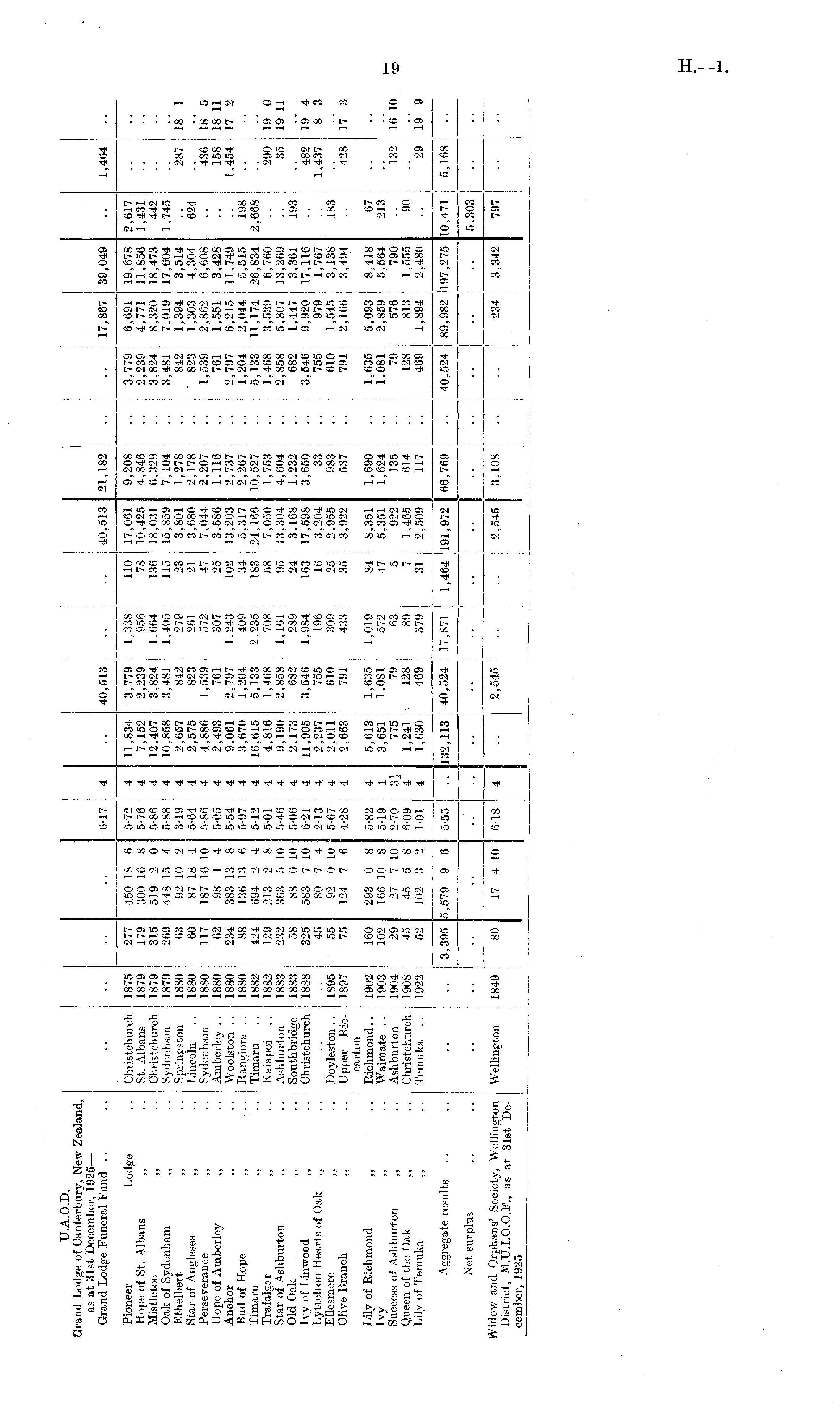U.A.O.D. 1 ! Grand Lodge of Canterbury, New Zealand, as at 31st December, 1925 — Grand Lodge Funeral Fund .. .. .. .. .. .. 6-17 4 .. 40,513 .. .. 40,513 21,182 .. .. 17,867 39,049 .. 1,464 Pioneer Lodge .. Christohureh 1875 277 450 18 6 5-72 4 j 11,834 3,779 1,338 110 17,061 9,208 .. 3,779 6,691 19,678 2,617 Hope of St. Albans „ .. St. Albans 1879 179 300 16 8 5-76; 4 7,152 2,239 956 78 ' 10,425 4,846 .. 2,239 4,771 11,856 1,431 Mistletoe „ .. Christchurch 1879 315 519 2 0 5-86! 4 12,407 3.824! 1,664 136 18,031 6,329 .. 3,824 8,320 18,473 442 Oak of Sydenham „ .. Sydenham 1879 269 448 15 4 5-88' 4 10.858 3,481 ' 1,405 115 15,859 7,104 .. 3,481 7.019 17,604 1,745 Ethelbert „ .. Springston 1880 63 92 10 2 3-19 4 2,657 842 279 23 3,801 1,278 .. 842 1,394 3,514 .. 287 18 1 Star of Anglesea „ .. Lincoln .. 1880 60 87 18 4 5-64 4 2,575 823 261 2] 3,680 2,178 .. 823 1,303 4,304 624 Perseverance „ .. Sydenham 1880 117 187 16 10 5-86 4 4,886 1,539 572 47 7,044 2,207 .. 1,539 2,862 6,608 .. 436 18 5 Hope of Amberley „ .. Amberley .. 1880 62 98 1 4 5-05 4 2,493 761 307 25 3,586 1,116 .. 761 1,551 3,428 .. 158 18 11 Anchor „ .. Woolston .. 1880 234 383 13 8 5-54 4 9,061 2,797 1,243 102 13,203 2,737 .. 2,797 6,215 11,749 .. 1,454 17 2 Bud of Hope „ .. Rangiora .. 1880 88 136 13 6 5-97 4 3,670 1,204 409 34 5,317 2,267 .. 1,204 2,044 5,515 198 Timaru „ .. Timaru .. 1882 424 694 2 4 5-12. 4 16,615 5,133 2,235 183 24,166 10,527 .. 5,133 11,174 26,834 2,668 Trafalgar ,, .. Kaiapoi .. 1882 129 213 2 8 5-01 I 4 4,816 (,468 708 58 7,050 1,753 j .. 1,468 3,539 6,760 .. 290 19 0 Star of Ashburton ,, .. Ashburton 1883 232 363 5 10 5-46 4 9,190 2,858 1,161 95 13,304 4,604! .. 2,858 5,807 13,269 .. 35 19 11 Old Oak „ .. Southbridge 1883 58 88 0 10 5-06 4 2,173 682 289 24 3,168 1,232 .. 682 1.447 3,361 193 Ivy of Linwood „ .. Christchurch 1888 325 583 7 10 6-21 4 11,905 3,546 1,984 163 17,598 3,650 .. 3,546 9,920 17,116 .. 482 19 4 Lyttelton Hearts of Oak „ .. .. .. 45 80 7 4 2-13 4 2,237 755 196 16 3,204 33 .. 755 979 1,767 .. 1,437 8 3 EUesmere „ .. Doyleston .. 1895 55 92 0 10 5-67 I 4 2,0.11 610 309 25 2,955 983 .. 610 1,545 3,138 183 Olive Branch ,, .. Upper Ric- 1897 75 124 7 6 4-28: 4 2,663 791 433! 35 3,922 537 .. 791 2,166 3,494 .. 428 17 3 carton Lilv of Richmond „ .. Richmond.. 1902 160 293 0 8 5-82 ' 4 5,613 1,635 1,019 84 8,351 1,690 .. 1,635 5,093 8,418 67 Ivy „ .. Waimate .. 1903 102 166 10 8 5-19 4 3,651 1.081 572 47 5.351 1,624 .. 1.081 2,859 5,564 213 Success of Ashburton „ . . Ashburton 1904 29 27 7 10 2-70 : 31 775 79 63 5 922 135 .. 79 576 790 .. 132 16 10 Queen of the Oak ,, .. Christchurch 1908 45 45 5 8 6-09 4~ 1,241 128 89 j 7 1,465 614 .. 128 813) 1,555 90 Lily of Temuka „ .. Temuka .. 1922 52 102 3 2 1-01 | 4 1.630 469, 379! 31 2,509 117 .. 469 1,894 2,480 .. 29 19 9 Aggregate results .. .. .. .. 3,395 5,579 9 6 5-55 .. 132,113 j 40,524 ! 17,871 1 1,464 191,972 66,769 .. 40,524 89,982 197, 275 10,471 5,168 Net surplus .. .. .. .. .. .. .. .. .. .. .. .. .. .. 5,303 j Widow and Orphans' Society, Wellington ' Wellington 1849 80 17 4 10 6-18 4 .. 2,545 .. .. 2,545 3,108 .. j .. 234 3,342 797! District, M.U.I.O.O.F., as at 31st De- ~ J cember, 1925 j |