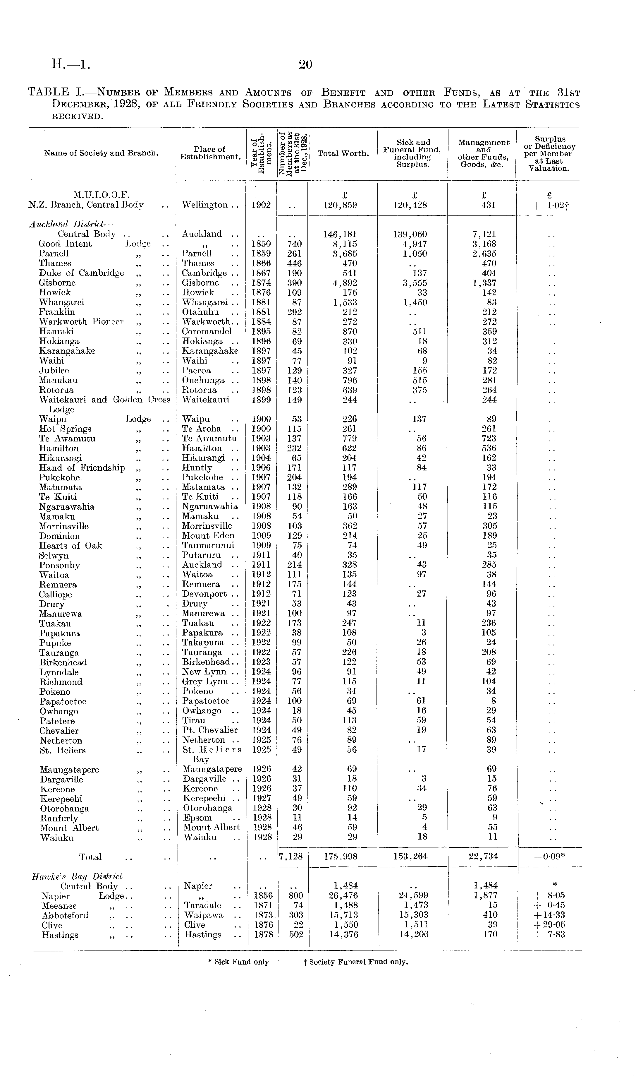 TABLE I.—Number of Members and Amounts of Benefit and other Funds, as at the 31st December, 1928, of all Friendly Societies and Branches according to the Latest Statistics received.