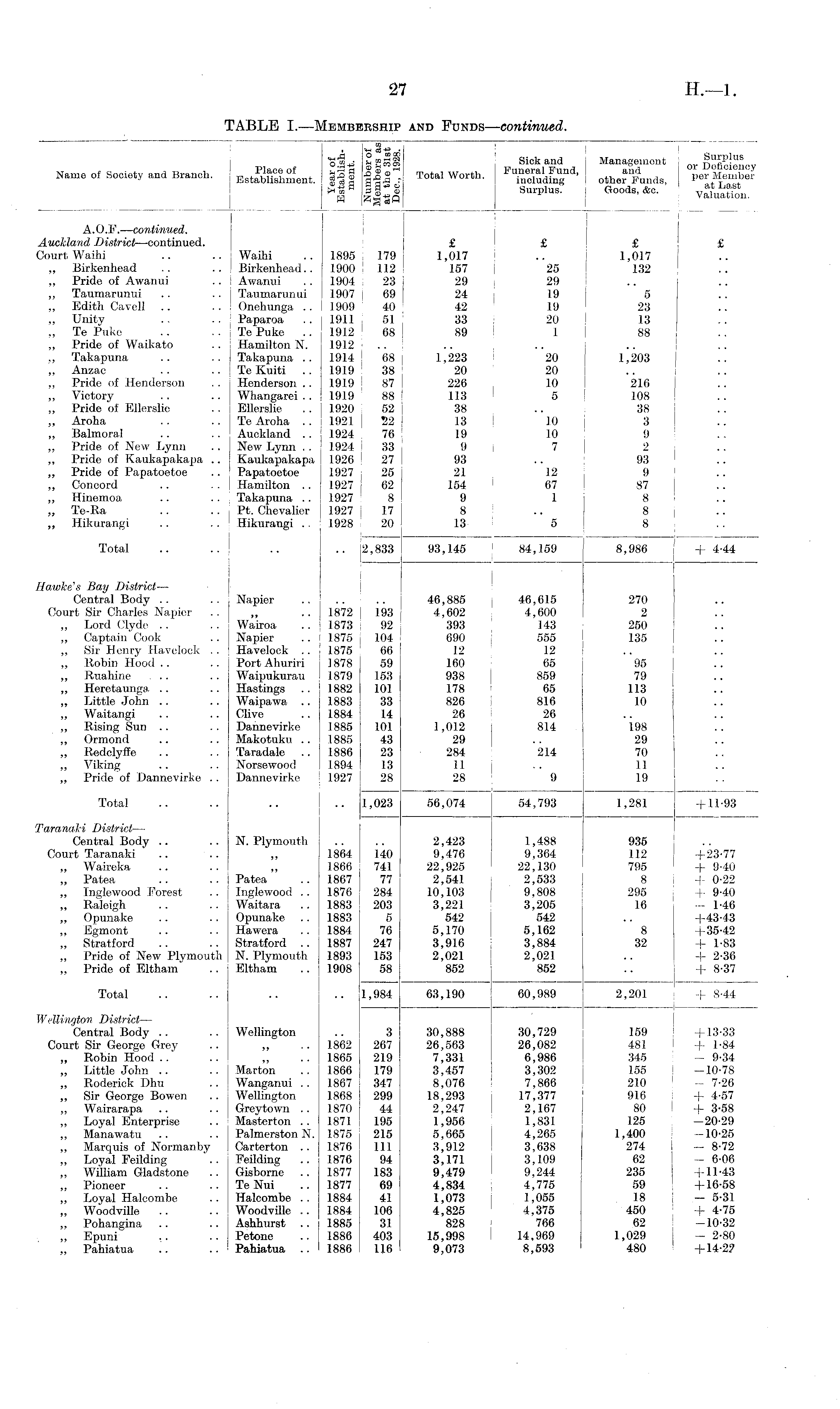 CO I ! oJU |s£3§ , Sick and Management Deflciencv Name of Society and Branch. B6tab Sf s hment. §l§a|.3~ Total Worth ' TTcluaFng ' othe? U Funds, Member 3 ||-| j Sur P' us - Goods, & c. Valuation. j I A.O.E.—continued. Auckland District—continued. £ £ £ ' £ Court Waihi .. .. Waihi .. 1895 179 1,017 .. 1,017 i „ Birkenhead .. .. Birkenhead.. 1900 ! 112 157 25 132 „ Pride of Awanui .. Awanui .. 1904 23 29 29 ,, Taumarunui .. .. Taumarunui 1907 j 69 24 19 5 „ Edith Cavell .. .. Onehunga .. 1909 40 42 19 23 ,, Unity .. . . Paparoa . . 1911 j 51 33 20 13 „ Te Puke .. . . j Te Puke .. 1912 1 68 89 1 88 „ Pride of Waikato .. Hamilton N. 1912 .. „ Takapuna .. .. Takapuna .. 1914 | 68 1,223 20 1,203 „ Anzac .. Te Kuiti .. 1919 38 20 20 „ Pride of Henderson . . Henderson .. 1919 j 87 226 , 10 216 „ Victory .. .. Whangarei . . 1919 88 113 5 108 „ Pride of Ellerslie . . Ellerslie . . i 1920 52 38 .. 38 „ Aroha . . Te Aroha . . 1 1921 22 13 10 3 „ Balmoral .. .. Auckland . . 1924 76 19 10 9 „ Pride of New Lynn . . New Lynn . . 1924 33 9 7 2 „ Pride of Kaukapakapa .. Kaukapakapa 1926 27 93 .. 93 „ Pride of Papatoetoe .. Papatoetoe 1927 25 21 12 9 ,, Concord .. . . Hamilton .. 1927 62 154 67 87 ,, Hinemoa .. . . Takapuna .. 1927 8 9 1 8 „ Te-Ra .. .. , Pt. Chevalier | 1927 17 8 .. 8 ,, Hikurangi .. .. Hikurangi .. 1928 20 13 5 8 Total .. .. .. .. 2,833 93,145 84,159 8,986 + 4-44 Hawke's Bay District— Central Body .. .. Napier .. .. .. 46,885 | 46,615 270 Court Sir Charles Napier .. ,, .. 1872 193 4,602 4,600 2 „ Lord Clyde .. .. Wairoa .. 1873 92 393 \ 143 250 „ Captain Cook .. Napier .. 1875 104 690 555 135 ,, Sir Henry Havelock .. Havelock .. 1875 66 12 12 „ Robin Hood.. .. PortAhuriri 1878 59 160 65 95 ,, Ruahine ... . . Waipukurau 1879 153 938 859 79 „ Heretaunga .. .. Hastings .. 1882 101 178 65 113 „ Little John .. .. Waipawa .. 1883 33 826 816 10 „ Waitangi .. . . Clive .. 1884 14 26 26 „ Rising Sun .. .. Dannevirke 1885 101 1,012 814 198 ,, Ormond .. .. Makotuku .. 1885 43 29 .. 29 „ Redclyffe .. .. Taradale .. 1886 23 284 214 70 ,, Viking .. .. Norsewood 1894 13 11 .. 11 „ Pride of Dannevirke .. Dannevirke 1927 28 28 9 19 Total .. .. .. .. 1,023 56,074 54,793 1,281 +11-93 Taranalci District — Central Body .. .. N. Plymouth .. .. 2,423 1,488 935 Court Ta,ranaki .. .. ,, 1864 140 9,476 9,364 112 +23-77 „ Waireka .. .. „ 1866 741 22,925 22,130 795 + 9-40 „ Patea .. .. Patea .. 1867 77 2,541 2,533 8 + 0-22 „ Inglewood Forest .. Inglewood .. 1876 284 10,103 9,808 295 + 9-40 „ Raleigh .. .. Waitara .. 1883 203 3,221 3,205 16 - 1-46 „ Opunake .. .. Opunake .. 1883 5 542 542 .. +43-43 „ Egmont .. .. Hawera .. 1884 76 5,170 5,162 8 +35-42 „ Stratford .. .. Stratford .. 1887 247 3,916 3,884 32 + 1-83 „ Pride of New Plymouth N. Plymouth 1893 153 2,021 2,021 .. + 2-36 „ Pride of Eltham" .. Eltham .. 1908 58 852 852 .. + 8-37 Total .. .. .. .. 1,984 63,190 60,989 2,201 + 8-44 W ellington District— Central Body .. .. Wellington .. 3 30,888 30,729 159 +13-33 Court Sir George Grey .. ,, .. 1862 267 26,563 26,082 481 + 1-84 „ Robin Hood.. .. „ .. 1865 219 7,331 6,986 345 - 9-34 „ Little John .. .. Marton .. 1866 179 3,457 3,302 155 -10-78 ,, Roderick Dim .. Wanganui .. 1867 347 8,076 7,866 210 — 7-26 „ Sir George Bowen .. Wellington 1868 299 18,293 17,377 916 + 4-57 „ Wairarapa .. .. Greytown .. 1870 44 2,247 2,167 80 + 3-58 „ Loyal Enterprise .. Masterton .. 1871 195 1,956 1,831 125 —20-29 ,, Manawatu .. .. Palmerston N. 1875 215 5,665 4,265 1,400 —10-25 ,, Marquis of Normanby Carterton .. 1876 111 3,912 3,638 274 — 8-72 ,, Loyal Feilding .. Feilding .. 1876 94 3,171 3,109 62 — 6-06 ,, William Gladstone .. Gisborne .. 1877 183 9,479 9,244 235 +11-43 „ Pioneer .. . . Te Nui .. 1877 69 4,834 4,775 59 +16-58 „ Loyal Halcombe .. Halcombe ., 1884 41 1,073 1,055 18 — 5-31 „ Woodville .. .. Woodville .. 1884 106 4,825 4,375 450 + 4-75 „ Pohangina .. .. Ashhurst .. 1885 31 828 766 62 —10-32 „ Epuni .. .. Petone .. 1886 403 15,99S 14,969 1,029 - 2-80 „ Pahiatua .. .. Pahiatua .. 1886 116 9,073 8,593 480 +14-2?