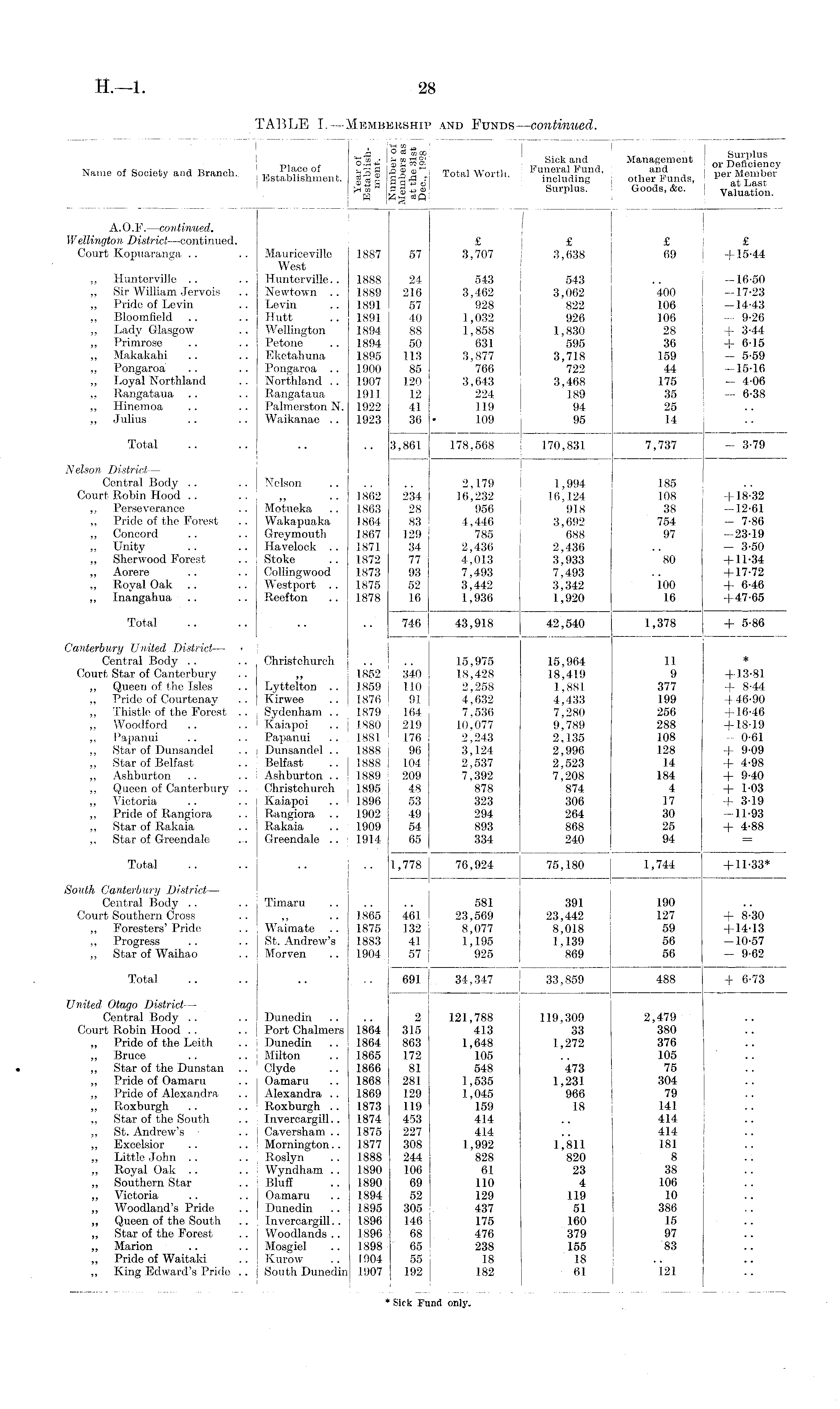 I SSSS ' Sick and Management : or Deficiency Name of Society and Branch., ! Es Sishment. §§8 f|.Tr| Total Worth. j J P er Member *! l®«Q Surplus. Goods, &c. i y aluation . I I A.O.I 1 . —continued. Wellington District—continued. £ i £ £ £ Court Kopuaranga .. .. Mauriceville 1887 57 3,707 3,638 69 +15-44 West „ Hunterville .. .. Hunterville.. 1888 24 543 543 .. —16-50 „ Sir William .Jervois .. Newtown .. 1889 216 3,462 3,062 400 -17-23 „ Pride of Levin .. Levin .. 1891 57 928 822 106 —14-43 „ Bloomfield .. .. Hutt .. 1891 40 1,032 926 106 — 9-26 „ Lady Glasgow .. Wellington 1894 88 1,858 1,830 28 + 3-44 „ Primrose .. .. Petone .. 1894 50 631 595 36 + 6-15 „ Makakahi .. .. Eketahuna 1895 113 3,877 3,718 159 - 5-59 „ Pongaroa .. .. Pongaroa .. 1900 85 766 722 44 —15-16 „ Loyal Northland .. Northland .. 1907 120 3,643 3,468 175 — 4-06 ,, Rangataua .. .. Rangataua 1911 12 224 189 35 — 6-38 „ Hinemoa .. .. Palmerston N. 1922 41 119 94 25 „ Julius .. .. Waikanae ,. 1923 36 • 109 95 14 Total .. .. .. .. 3,861 178,568 170,831 7,737 - 3-79 Nelson District— Central Body .. .. Nelson 2,179 1,994 185 Court Robin Hood .. .. „ .. 1862 234 16,232 16,124 108 +18-32 ,, Perseverance .. Mot.ueka .. 1863 28 956 918 38 —12-61 „ Pride of the Forest .. Wakapuaka 1864 83 4,446 3,692 754 — 7-86 „ Concord .. .. Greymouth 1867 129 785 688 97 -23-19 „ Unity .. .. Havelock .. 1871 34 2,436 2,436 .. — 3-50 „ Sherwood Forest .. Stoke .. 1872 77 4,013 3,933 80 +11-34 „ Aorere .. .. Collingwood 1873 93 7,493 7,493 .. +17-72 ., Royal Oak .. .. Westport .. 1875 52 3,442 3,342 100 + 6-46 ,, Inangahua .. .. Reefton .. 1878 16 1,936 1,920 16 +47-65 Total .. .. .. .. 74-6 43,918 42,540 1,378 + 5-86 Canterbury United District — Central Body .. .. Christchurch .. .. 15,975 15,964 11 * Court Star of Canterbury .. ,, 1852 340 18,428 18,419 9 +13-81 „ Queen of the Isles .. Lyttelton .. 1859 110 2,258 1,881 377 + 8-44 „ Pride of Courtenay .. Kirwee .. 1876 i 91 4,632 4,433 199 +46-90 ,, Thistle of the Forest .. Sydenham .. 1879 164 7,536 7,280 256 +16-46 „ Woodford .. .. Kaiapoi .. 1880. 219 10,077 9,789 288 +18-19 ,, Papanui .. .. Papanui .. 1881 176 2,243 2,135 108 0-61 „ Star of Dunsandel .. Dunsandel .. 1888 96 3,124 2,996 128 + 9-09 ,, Star of Belfast .. Belfast .. I 1888 104 2,537 2,523 14 + 4-98 „ Ashburton .. .. Ashburton .. 1 1889 209 7,392 7,208 184 + 9-40 ,, Queen of Canterbury .. Christchurch j 1895 48 878 874 4 + 1-03 „ Victoria .. .. Kaiapoi .. ! 1896 53 323 306 17 + 3-19 ,, Pride of Rangiora .. Rangiora .. 1902 49 294 264 30 11-93 ,, Star of Rakaia .. Rakaia .. 1909 54 893 868 25 + 4-88 ,, Star of Greendale ... Greendale .. 1914 65 334 240 94 = Total .. .. .. .. 1,778 76,924 75,180 1,744 +11-33* South Canterbury District — Central Body .. .. Timaru .. .. .. 581 391 j 190 Court Southern Cross .. „ .. 1865 461 23,569 23,442 127 + 8-30 „ Foresters'Pride .. Waimate .. 1875 132 8,077 8,018 59 +14-13 ,, Progress .. .. St. Andrew's 1883 41 1,195 1,139 56 —10-57 ,, Star of Waihao .. Morven .. 1904 57 925 869 56 — 9-62 Total .. .. .. .. 691 34,347 j 33,859 488 -f 6-73 United Otago District — Central Body .. .. Dunedin .. .. 2 121,788 i 119,309 2,479 Court Robin Hood . . .. Port Chalmers 1864 315 413 1 33 380 „ Pride of the Leith .. Dunedin .. 1864 863 1,648 1,272 376 ,, Bruce .. .. Milton .. 1865 172 105 . . 105 ,, Star of the Dunstan .. Clyde .. 1866 81 548 473 75 „ Pride of Oamaru .. Oamaru .. 1868 281 1,535 1,231 304 „ Pride of Alexandra .. Alexandra .. 1869 129 1,045 966 79 ,, Roxburgh .. .. Roxburgh .. 1873 119 159 18 141 „ Star of the South .. Invercargill.. 1.874 453 414 .. 414 „ St. Andrew's .. Caversham .. 1875 227 414 .. ; 414 ,, Excelsior .. .. Mornington.. 1877 308 1,992 1,811 181 „ Little John .. .. j Roslyn .. 1888 244 828 820 8 „ Royal Oak .. .. Wyndham .. 1890 106 61 23 38 ,, Southern Star .. Bluff .. 1890 69 110 4 106 „ Victoria .. .. Oamaru .. 1894 52 129 119 10 „ Woodland's Pride .. Dunedin .. 1895 305 437 51 386 ,, Queen of the South .. Invercargill.. 1896 146 175 160 15 ,, Star of the Forest .. Woodlands .. 1896 68 476 379 97 „ Marion .. .. Mosgiel .. 1898 65 238 155 83 „ Pride of Waitaki .. Kurow .. 1904 55 18 18 „ King Edward's Pride .. South Dunedin 1907 192 182 61 j 121 * Sick Fund only.
