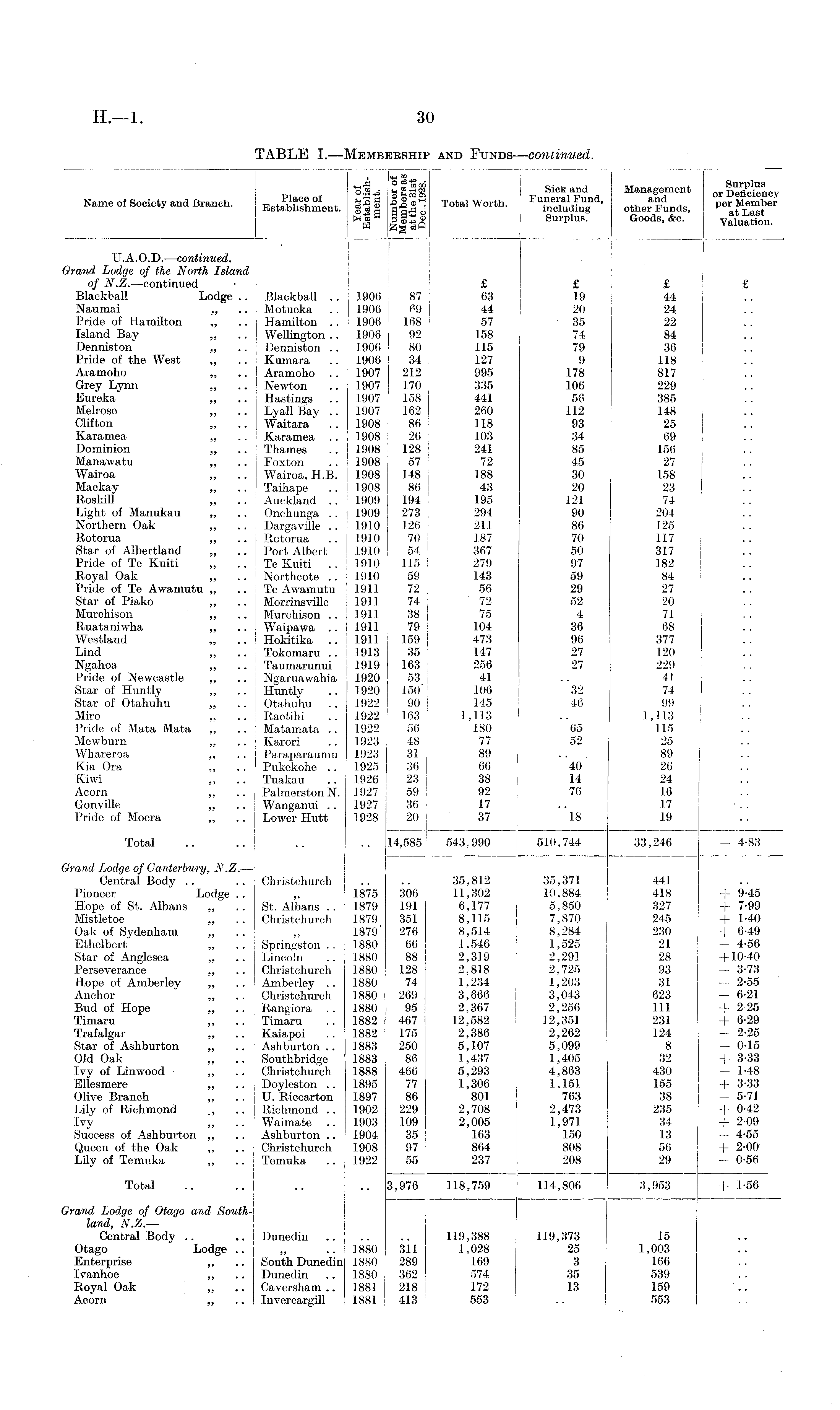 oj.rf Sick and Management Deflcienev Name of Society and Branch. Estfbhshment. g£| Total Worth. Fu S™' other Funds, p »S er 3 |||| Surplus 8 Goods, 4c. v ™ n . U.A.O.D.—continued. Or and Lodge of the North Island of N.Z. —continued ■ £ £ £ £ Blackball Lodge .. Blackball .. 1906 87 63 19 44 Naumai „ .. ! Motueka .. 1900 69 44 20 24 ! Pride of Hamilton „ .. Hamilton .. 1906 168 57 35 22 Island Bay „ .. | WelHngton .. 1906 | 92 158 74 84 Denniston „ .. Denniston .. 1906 1 80 115 79 36 Pride of the West „ .. Kumara .. 1906 34 127 9 118 Aramoho „ .. i Aramoho .. 1907 212 995 178 817 Grey Lynn „ .. j Newton .. 1907 170 335 106 229 Eureka „ .. Hastings .. 1907 158 441 56 385 Melrose „ .. Lyall Bav .. 1907 162 260 112 148 Clifton „ .. Waitara" .. 1908 86 118 93 25 Karamea ,, .. Karamea .. 1908 26 103 34 69 Dominion „ .. Thames .. 1908 128 241 85 156 Manawatu „ .. Eoxton .. 1908 57 72 45 27 Wairoa „ .. Wairoa, H.B. 1908 148 188 30 158 ! Mackay „ .. 1 Taihape .. 1908 86 43 20 23 I Roskill „ .. Auckland .. 1909 194 195 121 74 Light of Manukau „ .. Onehunga .. 1909 273 294 90 204 Northern Oak „ .. Dargaville .. 1910 126 211 86 125 ; Rotorua „ .. Rotorua .. 1910 70 | 187 70 117 Star of Albertland „ .. Port Albert 1910 54 1 367 50 317 Pride of Te Kuiti „ .. Te Kuiti .. 1910 115 ! 279 97 182 Royal Oak ,, .. Northcote .. 1910 59 143 59 84 Pride of Te Awamutu „ .. Te Awamutu 1911 72 56 29 27 Star of Piako „ .. Morrinsville 1911 74 72 52 20 ! Murchison „ .. Murchison .. 1911 38 75 4 71 Ruataniwha ,, .. Waipawa .. 1911 79 104 36 68 Westland „ .. Hokitika .. 1911 159 473 96 377 ! Lind „ .. Tokomaru .. 1913 35 147 27 120 1 Ngahoa „ ... Taumarunui 1919 163 256 27 229 Pride of Newcastle „ .. Ngaruawahia 1920 53 41 .. 41 , Star of Huntly „ .. Huntly .. 1920 150 106 | 32 74 Star of Otahuhu „ .. Otahuhu .. 1922 90 145 46 99 .. Miro „ .. Raetihi .. 1922 163 1,113 J .. 1,113 j Pride of Mata Mata ,, .. j Matamata .. 1922 56 j 180 ! 65 115 j Mewburn „ .. Karori .. 1923 48 77 52 25 Whareroa ,, .. Paraparaumu 1923 31 89 .. 89 Kia Ora „ .. Pukekohe .. 1925 36 66 40 26 Kiwi „ .. Tuakau .. 1926 23 38 14 24 Acorn „ .. j PalmerstonN. 1927 59 92 76 16 Gonville „ .. Wanganui .. 1927 36 17 .. 17 Pride of Moera ,, .. Lower Hutt 1928 20 37 18 19 Total .. .. .. 14,585 543,990 j 510,744 33,246 - 4-83 Grand Lodge of Canterbury, N.Z. — Central Body .. .. Christchurch .. .. 35,812 35,371 441 Pioneer Lodge .. ,, 1875 306 11,302 10,884 418 + 9-45 Hope of St. Albans „ .. St. Albans .. 1879 191 6,177 5,850 327 -j- 7-99 Mistletoe „ .. Christchurch 1879 351 8,115 7,870 245 + 1-40 Oak of Sydenham „ „ 1879' 276 8,514 8,284 230 + 6-49 Ethelbert „ .. Springston .. 1880 66 1,546 1,525 21 — 4-56 Star of Anglesea „ .. Lincoln .. 1880 88 2,319 2,291 28 +10-40 Perseverance ,, .. Christchurch 1880 128 2,818 2,725 93 — 3-73 Hope of Amberley „ .. Amberley .. 1880 74 1,234 1,203 31 — 2-55 Anchor ,, .. Christchurch 1880 269 3,666 3,043 623 — 6'21 Bud of Hope „ .. Rangiora .. 1880 95 2,367 2,256 111 + 2 25 Timaru „ .. Timaru .. 1882 467 12,582 12,351 231 + 6-29 Trafalgar „ .. Kaiapoi .. 1882 175 2,386 2,262 124 - 2-25 Star of Ashburton „ .. Ashburton .. 1883 250 5,107 5,099 8 — 0-15 Old Oak „ .. Southbridge 1883 86 1,437 1,405 32 + 3-33 Ivy of Linwood ,, .. Christchurch 1888 466 5,293 4,863 430 — I-48 Ellesmere „ .. Doyleston .. 1895 77 1,306 1,151 155 -J- 3-33 Olive Branch „ U. Riccarton 1897 86 801 763 38 — 5-71 Lily of Richmond , .. Richmond.. 1902 229 2,708 2,473 235 + 0-42 Ivy „ .. Waimate .. 1903 109 2,005 1,971 34 + 2-09 Success of Ashburton ,, .. Ashburton .. 1904 35 163 150 13 — 4-55 Queen of the Oak ,, .. Christchurch 1908 97 864 808 56 + 2'00 Lily of Temuka „ .. Temuka. .. 1922 55 237 208 29 — 0-56 Total .. .. .. .. 3,976 118,759 114,806 3,953 + 1-56 Grand Lodge of Otago and Southland, N.Z.— Central Body .. .. Dunedin .. .. .. 119,388 119,373 15 Otago Lodge .. „ ..1880 311 1,028 25 1,003 Enterprise „ .. South Dunedin 1880 289 169 3 166 Ivanhoe „ .. Dunedin .. 1880 362 574 35 539 Royal Oak „ .. Caversham .. 1881 218 172 13 159 Acorn „ .. Invercargill 1881 413 553 .. 553