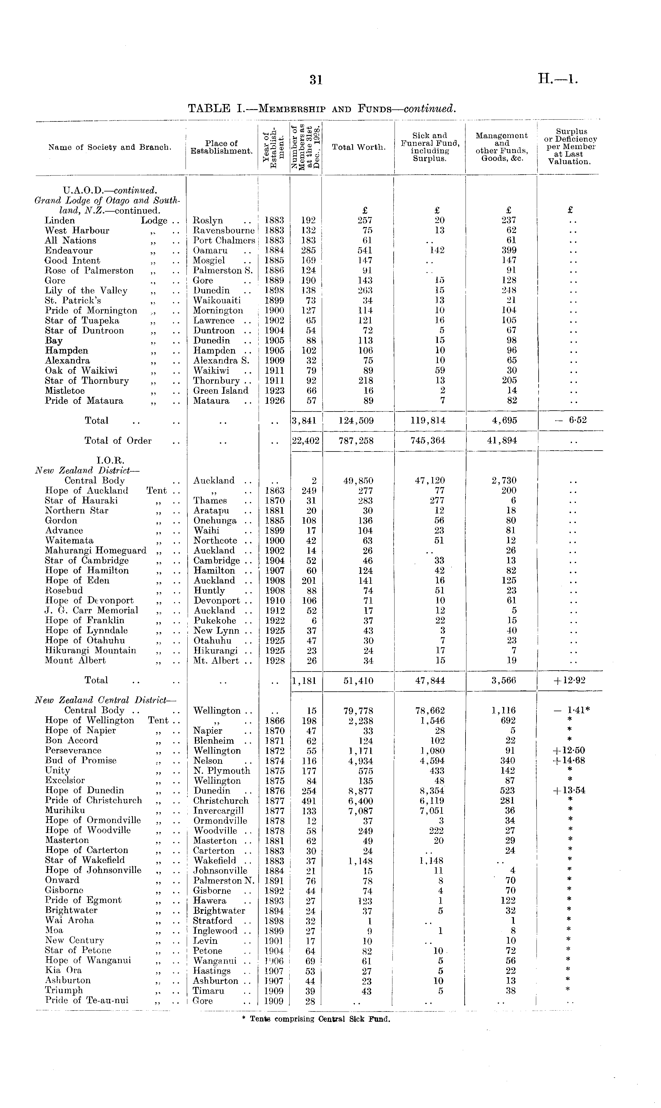 i , «H « 43 • i o»4i Sick and Management or Deficiency Name of Society and Branch. g? S flS* Total Worth. ' other Funds, tSj a |!il Surplus. Goods, 4c. vlluatSn. W «o U.A.O.D.—continued. Grand Lodge of Otago and Southland, N.Z. —continued. £ £ £ £ Linden Lodge .. Roslyn .. 1883 192 257 20 237 West Harbour ,, .. Ravensbourne 1883 132 j 75 13 62 All Nations ,, .. Port Chalmers 1883 183 ' 61 i 61 Endeavour ,, .. Oamaru .. 1884 285 j 54.1 142 399 Good Intent „ .. Mosgiel .. 1885 169 147 .. 147 Rose of Palmerston „ .. Palmerston S. 1886 124 91 . . 91 Gore „ .. Gore .. 1889 190 143 15 128 Lily of the Valley „ .. Dunedin .. 1898 138 263 15 248 St. Patrick's „ .. Waikouaiti 1899 73 34 13 21 Pride of Mornington ,, .. Mornington 1900 127 114 10 104 Star of Tuapeka ,, .. Lawrence .. 1902 65 121 16 105 Star of Duntroon ,, .. Duntroon .. 1904 54 72 5 67 Bay ,, .. Dunedin .. 1905 88 113 15 98 Hampden ,, .. Hampden .. 1905 102 106 10 96 Alexandra „ .. Alexandra S. 1909 32 75 10 65 Oak of Waikiwi „ .. Waikiwi .. 1911 79 89 59 30 Star of Thornbury „ .. Thornbury .. 1911 92 218 13 205 Mistletoe „ .. Green Island | 1923 66 16 2 14 ] Pride of Mataura ,, .. Mataura .. 1926 57 89 7 82 Total .. .. .. .. 3,841 124,509 119,814 4,695 - 6-52 Total of Order .. .. .. 22,402 787,258 745,364 41,894 I.O.R. New Zealand District— Central Body .. Auckland .. .. 2 49,850 47,120 2,730 Hope of Auckland Tent .. ,, .. 1863 249 277 77 200 Star of Hauraki ,, .. Thames .. 1870 31 283 277 6 Northern Star „ .. Aratapu .. 1881 20 30 12 18 Gordon „ .. Onehunga .. 1885 108 136 56 80 Advance ,, .. Waihi .. 1899 17 104 23 81 Waitemata ,, .. Northeote .. 1900 42 63 51 12 Mahurangi Homeguard ,, .. Auckland .. 1902 14 26 .. 26 Star of Cambridge ,, .. Cambridge .. 1904 52 46 33 13 Hope of Hamilton ,, .. Hamilton .. 1907 60 124 42 82 Hope of Eden ,, .. Auckland .. 1908 201 141 16 125 Rosebud „ . . Huntly .. 1908 88 74 51 23 Hope of Dcvonport ,, .. Devonport .. 1910 106 71 10 61 J. G. Carr Memorial ,, .. Auckland .. 1912 52 17 12 5 Hope of Franklin ,, .. Pukekohe .. 1922 6 37 22 15 Hope of Lynndale „ .. New Lynn .. 1925 37 43 3 40 Hope of Otahuhu ,, .. Otahuhu .. 1925 47 30 7 23 Hikurangi Mountain ,, .. Hikurangi .. 1925 23 24 17 7 Mount Albert „ .. Mt. Albert .. 1928 26 34 15 19 Total .. .. .. .. 1,181 51,410 47,844 3,566 +12-92 New Zealand Central District— Central Body .. .. Wellington.. .. 15 79,778 78,662 1,116 — 1-41* Hope of Wellington Tent.. „ .. 1866 198 2,238 1,546 692 * Hope of Napier „ .. Napier .. 1870 47 33 28 5 Bon Accord „ .. Blenheim .. 1871 62 124 102 22 * Perseverance „ .. Wellington 1872 55 1,171 1,080 91 + 12-50 Bud of Promise ,, .. Nelson .. 1874 116 4,934 4,594 340 +14-68 Unity „ .. N. Plymouth 1875 177 575 433 142 * Excelsior „ .. Wellington 1875 84 135 48 87 * Hope of Dunedin „ .. Dunedin .. 1876 254 8,877 8,354 523 +13-54 Pride of Christchurch „ .. Christchurch 1877 491 6,400 6,119 281 * Murihiku „ .. Invercargill 1877 133 7,087 7,051 36 * Hope of Ormondville ,, .. Ormondville 1878 12 37 3 34 * Hope of Woodville „ .. Woodville ., 1878 58 249 222 27 Masterton „ .. Masterton .. 1881 62 49 20 29 * Hope of Carterton „ .. Carterton .. 1883 30 24 .. 24 Star of Wakefield „ .. Wakefield .. 1883 37 1,148 1,148 Hope of Johnsonville „ .. Johnsonville 1884 21 15 11 4 Onward „ .. Palmerston N. 1891 76 78 8 70 * Gisborne „ .. Gisborne . . 1892 44 74 4 70 Pride of Egmont ,, .. Hawera .. 1893 27 123 1 122 * Brightwater „ .. Brightwater 1894 24 37 5 32 * Wai Aroha „ .. Stratford .. 1898 32 I .. 1 * Moa „ .. Inglewood .. 1899 27 9 1 8 * New Century „ .. Levin .. 1901 17 10 j 10 * Star of Petone „ .. i Petone . . 1904 64 82 10 j 72 Hope of Wanganui ,, .. Wanganui .. ]'J06 69 61 5 56 Kia Ora „ .. j Hastings . . 1907 53 27 5 j 22 * Ashburton ,. .. j Ashburton .. J907 44 23 10 13 Triumph ,, .. | Timaru .. 1909 39 43 5 38 Pride of Te-au-nui ,, .. i Gore . . 1909 I 28 .. .. .. I * Tents comprising Central Sick Fund.