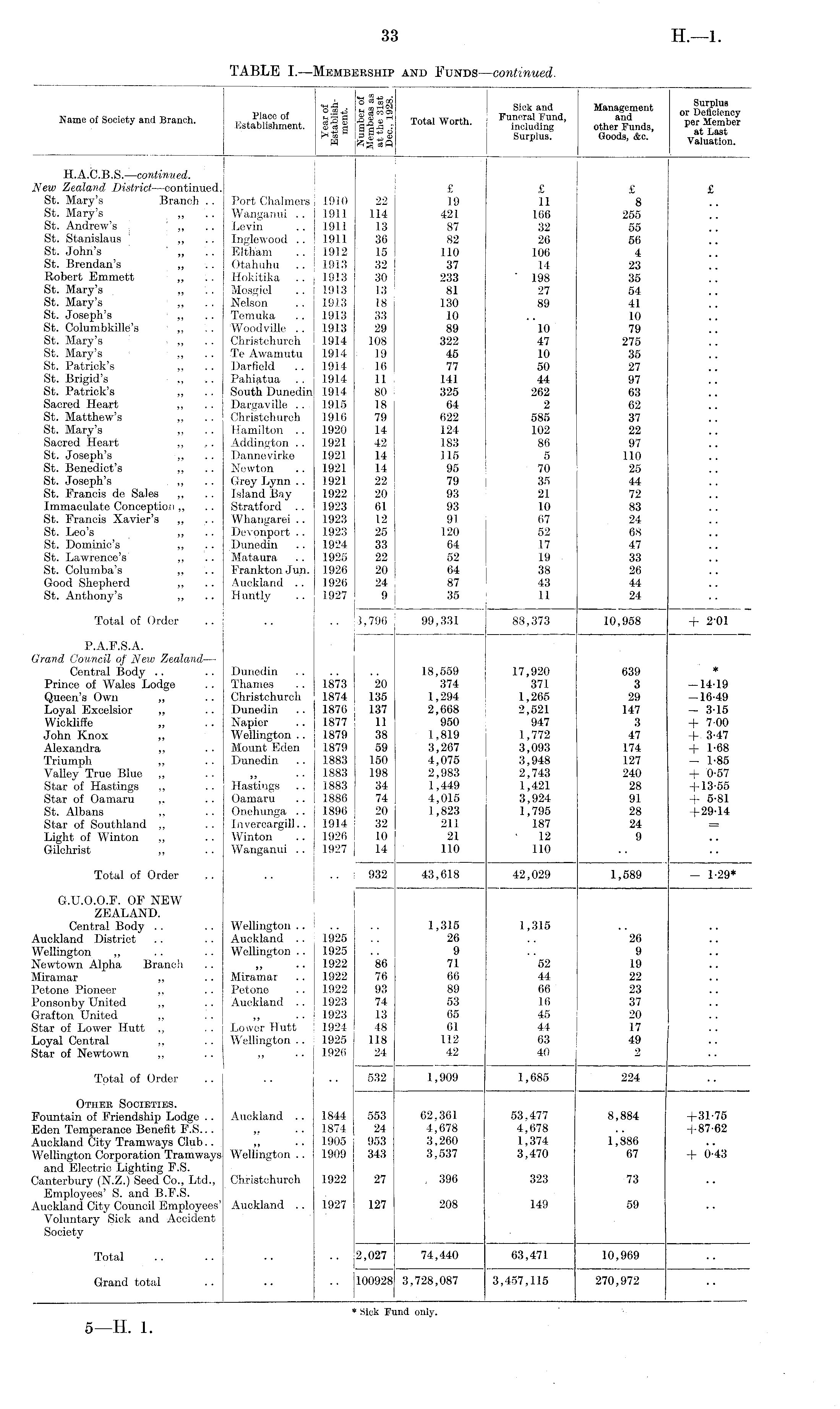 Sick and Management 0 r Defldenov Name of Society and Branch. S? | lis" Total Worth. other Funds, p6 a r t^5 ber »g S ||5| Surplusf Goods, & c.' v^_ H.A.C.B.S.—continued. New Zealand District—continued. ' f £ £ £ St. Mary's Branch .. Port Chalmers I 1910 22 19 11 8 St. Mary's „ .. Wanganui .. 1911 114 421 166 255 St. Andrew's „ .. Levin .. 1911 .13 87 32 55 St. Stanislaus ,, Inglewood .. 1911 36 82 26 56 St. John's „ .. Eltham .. 1912 15 110 106 4 St. Brendan's „ .. Otahuhu .. 1913 32 37 14 23 Robert Emmett „ .. Hokitika .. 1913 30 233 " 198 35 St. Mary's „ Mosgiel .. 1913 13 81 27 54 St. Mary's „ . . Nelson .. 1913 18 130 89 41 St. Joseph's „ .. Temuka .. 1913 33 10 .. 10 St. Columbkille's 1 „ . . Woodville .. 1913 29 89 10 79 St. Mary's , „ . . Christehurch 1914 108 322 47 275 St. Mary's „ .. Te Awamutu 1914 19 45 10 35 St. Patrick's ,, .. Darfield .. 1914 16 77 50 27 St. Brigid's „ i. Pahiatua .. 1914 11 141 44 97 St. Patrick's „ .. South Dunedin 1914 80 325 262 63 Sacred Heart ,, .. Dargaville .. 1915 18 64 2 62 St. Matthew's „ .. Christehurch 1916 79 622 585 37 St. Mary's ,, .. Hamilton .. 1920 14 124 102 22 Sacred Heart ,, ,. Addington .. 1921 42 183 86 97 St. Joseph's ■„ .. Dannevirke 1921 14 J15 5 110 St. Benedict's ,, .. Newton .. 1921 14 95 70 25 St. Joseph's , „ .. Grey Lynn .. 1921 22 79 35 44 St. Francis de Sales ,, .. Island Bay 1922 20 93 21 72 Immaculate Conception,, .. Stratford .. 1923 61 93 10 83 St. Francis Xavier's ,, .. Whangarei .. 1923 12 91 67 24 St. Leo's ,, .. Devonport .. 1923 25 120 52 68 St. Dominic's „ Dunedin .. 1924 33 64 17 47 St. Lawrence's „ .. Mataura .. 1925 22 52 19 33 St. Columba's ,, .. Franktonjun. 1926 20 64 38 26 Good Shepherd ,, .. Auckland .. 1926 24 87 43 44 St. Anthony's ,, Huritly .. 1927 9 35 11 24 Total of Order .. .. .. 3,796 99,331 88,373 10,958 + 2'01 P.A.F.S.A. Grand Council of New Zealand-— Central Body .. .. Dunedin 18,559 17,920 639 * Prince of Wales Lodge .. Thames .. 1873 20 374 371 3 -14-19 Queen's Own ,, .. Christchurch 1874 135 1,294 1,265 29 —16-49 Loyal Excelsior ,, .. Dunedin .. 1876 137 2,668 2,521 147 — 3-15 Wickliffe „ .. Napier .. 1877 11 950 947 3 + 7-00 John Knox „ Wellington.. 1879 38 1,819 1,772 47 +■ 3-47 Alexandra ,, . . Mount Eden 1879 59 3,267 3,093 174 + 1-68 Triumph „ .. Dunedin .. 1883 150 4,075 3,948 127 - 1-85 Valley True Blue „ .. „ .. 1883 198 2,983 2,743 240 + 0-57 Star of Hastings „ .. Hastings .. 1883 34 1,449 1,421 28 +13-55 Star of Oamaru ,, .. Oamaru .. 1886 74 4,015 3,924 91 -j- 5-81 St. Albans „ .. Onehunga .. 1896 20 1,823 1,795 28 +29-14 Star of Southland „ .. Invercargill.. 1914 32 211 187 24 = Light of Winton „ .. Winton .. 1926 10 21 '12 9 Gilchrist „ .. Wanganui .. 1927 14 110 110 Total of Order .. .. ; 932 43,618 42,029 1,589 - 1-29* G.U.O.O.F. OF NEW ZEALAND. Central Body .. .. Wellington.. .. .. 1,315 1,315 Auckland District .. .. Auckland .. 1925 .. 26 .. 26 Wellington „ .. .. Wellington .. 1925 .. 9 .. 9 Newtown Alpha Branch .. ,, .. 1922 86 71 52 19 Miramar „ .. Miramar .. 1922 76 66 44 22 Petone Pioneer ,, .. Petone .. 1922 93 89 66 23 Ponsonby United ,, .. Auckland .. 1923 74 53 16 37 Grafton United „ .. . 1923 13 65 45 20 Star of Lower Hutt „ .. Lower Hutt 1924 48 61 44 17 Loyal Central „ .. Wellington.. 1925 118 112 63 49 Star of Newtown ,, .. ,, • • 1926 24 42 40 2 Total of Order .. .. .. 532 1,909 1,685 224 Othek Societies. Fountain of Friendship Lodge .. Auckland .. 1844 553 62,361 53,477 8,884 +31-75 Eden Temperance Benefit F.S... ,, .. 1874 24 4,678 4,678 .. +87-62 Auckland City Tramways Club.. ,, .. 1905 953 3,260 1,374 1,886 Wellington Corporation Tramways Wellington.. 1909 343 3,537 3,470 67 + 0-43 and Electric Lighting F.S. Canterbury (N.Z.) Seed Co., Ltd., Christchurch 1922 27 396 323 73 Employees' S. and B.t'.S. Auckland City Council Employees' Auckland .. 1927 127 208 149 59 Voluntary Sick and Accident Society Total .. .. .. .. 2,027 74,440 63,471 10,969 Grand total .. .. .. 100928 3,728,087 3,457,115 270,972 * Sick Fund only. 5—H. 1.