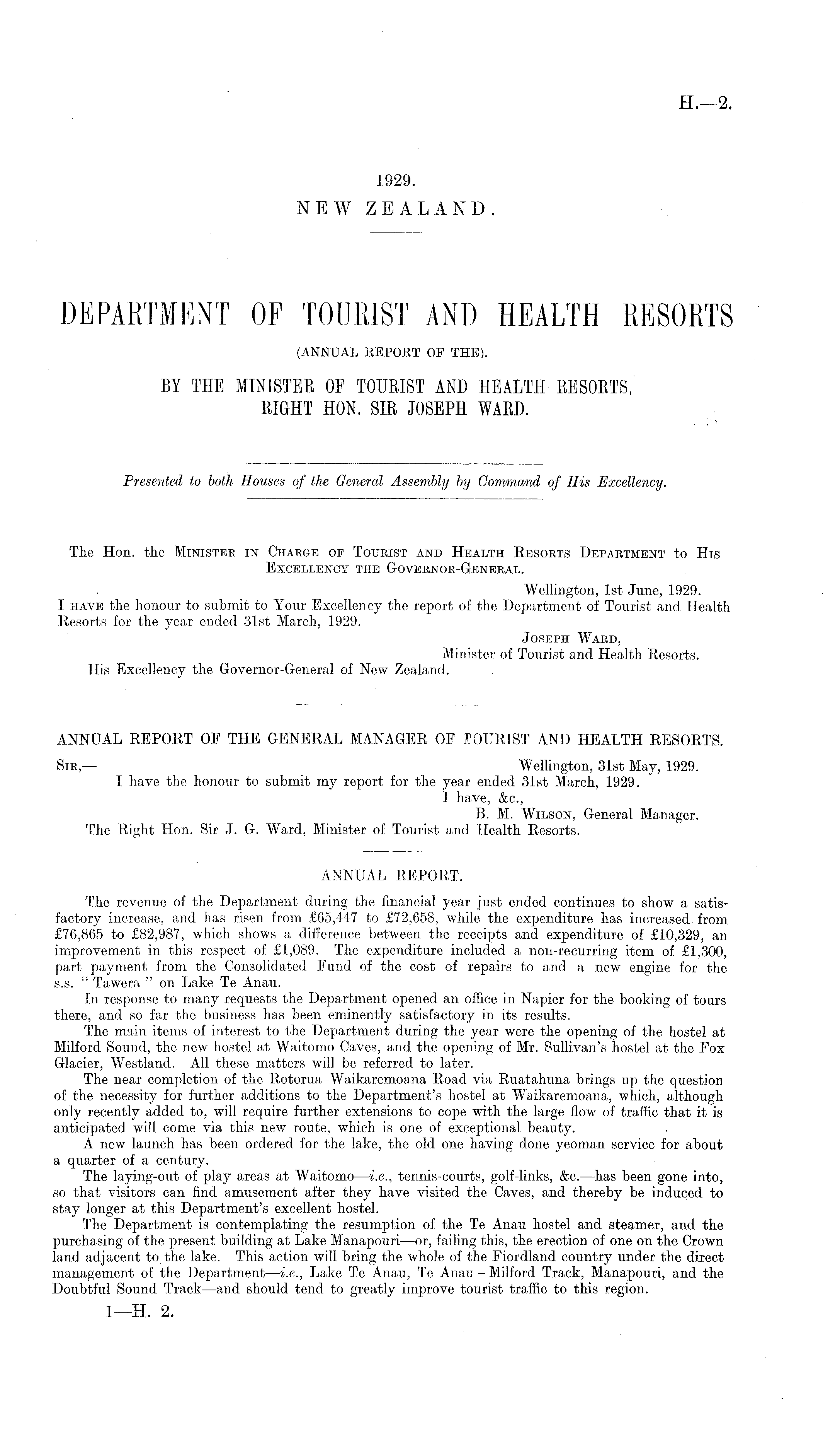 The Hon. the Minister in Charge of Tourist and Health Resorts Department to His Excellency the Governor-General. Wellington, Ist June, 1929. I have the honour to submit to Your Excellency the report of the Department of Tourist and Health Resorts for the year ended 31st March, 1929. Joseph Ward, Minister of Tourist and Health Resorts. His Excellency the Governor-General of New Zealand. ANNUAL REPORT OF THE GENERAL MANAGER OF TOURIST AND HEALTH RESORTS. Sir, — Wellington, 31st May, 1929. I have the honour to submit my report for the year ended 31st March, 1929. I have, &c., B. M. Wilson, General Manager. The Right Hon. Sir J. G. Ward, Minister of Tourist and Health Resorts. ANNUAL REPORT. The revenue of the Department during the financial year just ended continues to show a satisfactory increase, and has risen from £65,447 to £72,658, while the expenditure has increased from £76,865 to £82,987, which shows a difference between the receipts and expenditure of £10,329, an improvement in this respect of £1,089. The expenditure included a non-recurring item of £1,300, part payment from the Consolidated Fund of the cost of repairs to and a new engine for the s.s. " Tawera " on Lake Te Anau. In response to many requests the Department opened an office in Napier for the booking of tours there, and so far the business has been eminently satisfactory in its results. The main items of interest to the Department during the year were the opening of the hostel at Milford Sound, the new hostel at Waitomo Caves, and the opening of Mr. Sullivan's hostel at the Fox Glacier, Westland. All these matters will be referred to later. The near completion of the Rotorua-Waikaremoana Road via Ruatahuna brings up the question of the necessity for further additions to the Department's hostel at Waikaremoana, which, although only recently added to, will require further extensions to cope with the large flow of traffic that it is anticipated will come via this new route, which is one of exceptional beauty. A new launch has been ordered for the lake, the old one having done yeoman service for about a quarter of a century. The laying-out of play areas at Waitomo —i.e., tennis-courts, golf-links, &c. —has been gone into, so that visitors can find amusement after they have visited the Caves, and thereby be induced to stay longer at this Department's excellent hostel. The Department is contemplating the resumption of the Te Anau hostel and steamer, and the purchasing of the present building at Lake Manapouri —or, failing this, the erection of one on the Crown land adjacent to the lake. This action will bring the whole of the Fiordland country under the direct management of the Department —i.e., Lake Te Anau, Te Anau - Milford Track, Manapouri, and the Doubtful Sound Track —and should tend to greatly improve tourist traffic to this region.