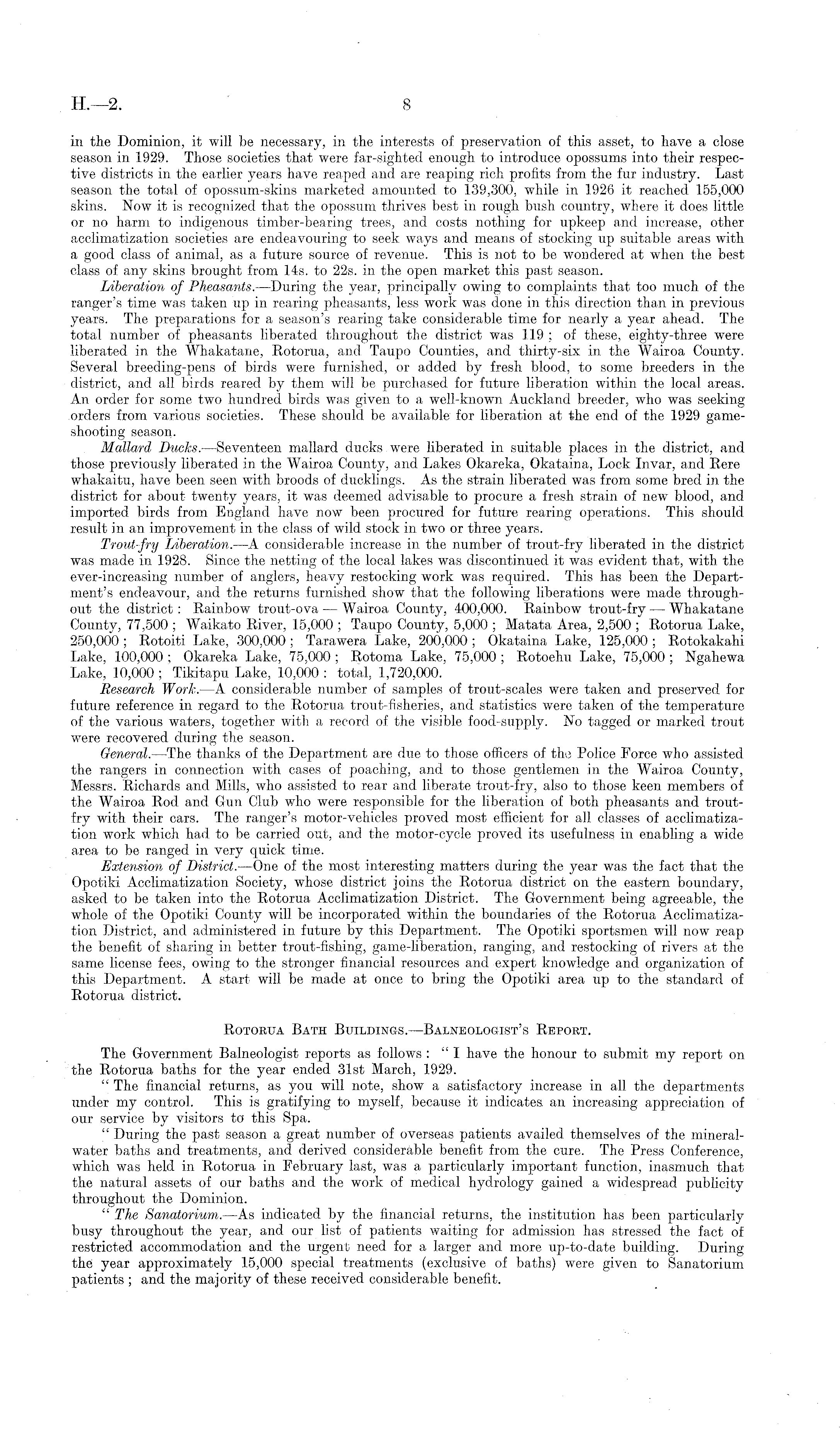 in the Dominion, it will be necessary, in the interests of preservation of this asset, to have a close season in 1929. Those societies that were far-sighted enough to introduce opossums into their respective districts in the earlier years have reaped and are reaping rich profits from the fur industry. Last season the total of opossum-skins marketed amounted to 139,300, while in 1926 it reached 155,000 skins. Now it is recognized that the opossum thrives best in rough bush country, where it does little or no harm to indigenous timber-bearing trees, and costs nothing for upkeep and increase, other acclimatization societies are endeavouring to seek ways and means of stocking up suitable areas with a good class of animal, as a future source of revenue. This is not to be wondered at when the best class of any skins brought from 14s. to 225. in the open market this past season. Liberation of Pheasants. —During the year, principally owing to complaints that too much of the ranger's time was taken up in rearing pheasants, less work was done in this direction than in previous years. The preparations for a season's rearing take considerable time for nearly a year ahead. The total number of pheasants liberated throughout the district was 119 ; of these, eighty-three were liberated in the Whakatane, Rotorua, and Taupo Counties, and thirty-six in the Wairoa County. Several breeding-pens of birds were furnished, or added by fresh blood, to some breeders in the district, and all birds reared by them will be purchased for future liberation within the local areas. An order for some two hundred birds was given to a well-known Auckland breeder, who was seeking orders from various societies. These should be available for liberation at the end of the 1929 gameshooting season. Mallard Ducks. —Seventeen mallard ducks were liberated in suitable places in the district, and those previously liberated in the Wairoa County, and Lakes Okareka, Qkataina, Lock Invar, and Rere whakaitn, have been seen with broods of ducklings. As the strain liberated was from some bred in the district for about twenty years, it was deemed advisable to procure a fresh strain of new blood, and imported birds from England have now been procured for future rearing operations. This should result in an improvement in the class of wild stock in two or three years. Trout-fry Liberation. —A considerable increase in the number of trout-fry liberated in the district was made in 1928. Since the netting of the local lakes was discontinued it was evident that, with the ever-increasing number of anglers, heavy restocking work was required. This has been the Department's endeavour, and the returns furnished show that the following liberations were made throughout the district: Rainbow trout-ova — Wairoa County, 400,000. Rainbow trout-fry — Whakatane County, 77,500 ; Waikato River, 15,000 ; Taupo County, 5,000 ; Matata Area, 2,500 ; Rotorua Lake, 250,000 ; Rotoiti Lake, 300,000 ; Tarawera Lake, 200,000 ; Okataina Lake, 125,000 ; Rotokakahi Lake, 100,000 ; Okareka Lake, 75,000 ; Rotoma Lake, 7-5,000 ; Rotoehu Lake, 75,000 ; Ngahewa Lake, 10,000 ; Tikitapu Lake, 10,000 : total, 1,720,000. Research Work. —A considerable number of samples of trout-scales were taken and preserved for future reference in regard to the Rotorua trout-fisheries, and statistics were taken of the temperature of the various waters, together with a record of the visible food-supply. No tagged or marked trout were recovered during the season. General. —The thanks of the Department are due to those officers of the Police Force who assisted the rangers in connection with cases of poaching, and to those gentlemen in the Wairoa County, Messrs. Richards and Mills, who assisted to rear and liberate trout-fry, also to those keen members of the Wairoa Rod and Gun Club who were responsible for the liberation of both pheasants and troutfry with their ears. The ranger's motor-vehicles proved most efficient for all classes of acclimatization work which had to be carried out, and the motor-cycle proved its usefulness in enabling a wide area to be ranged in very quick time. Extension of District. —One of the most interesting matters during the year was the fact that the Opotild Acclimatization Society, whose district joins the Rotorua district on the eastern boundary, asked to be taken into the Rotorua Acclimatization District. The Government being agreeable, the whole of the Opotiki County will be incorporated within the boundaries of the Rotorua Acclimatization District, and administered in future by this Department. The Opotiki sportsmen will now reap the benefit of sharing in better trout-fishing, game-liberation, ranging, and restocking of rivers at the same license fees, owing to the stronger financial resources and expert knowledge and organization of this Department. A start will be made at once to bring the Opotiki area up to the standard of Rotorua district. Rotorua Bath Buildings.—Balneologist's Repobt. The Government Balneologist reports as follows : "I have the honour to submit my report on the Rotorua baths for the year ended 31st March, 1929. " The financial returns, as you will note, show a satisfactory increase in all the departments under my control. This is gratifying to myself, because it indicates, an increasing appreciation of our service by visitors to this Spa. " During the past season a great number of overseas patients availed themselves of the mineralwater baths and treatments, and derived considerable benefit from the cure. The Press Conference, which was held in Rotorua in February last, was a particularly important function, inasmuch that the natural assets of our baths and the work of medical hydrology gained a widespread publicity throughout the Dominion. " The Sanatorium. —As indicated by the financial returns, the institution has been particularly busy throughout the year, and our list of patients waiting for admission has stressed the fact of