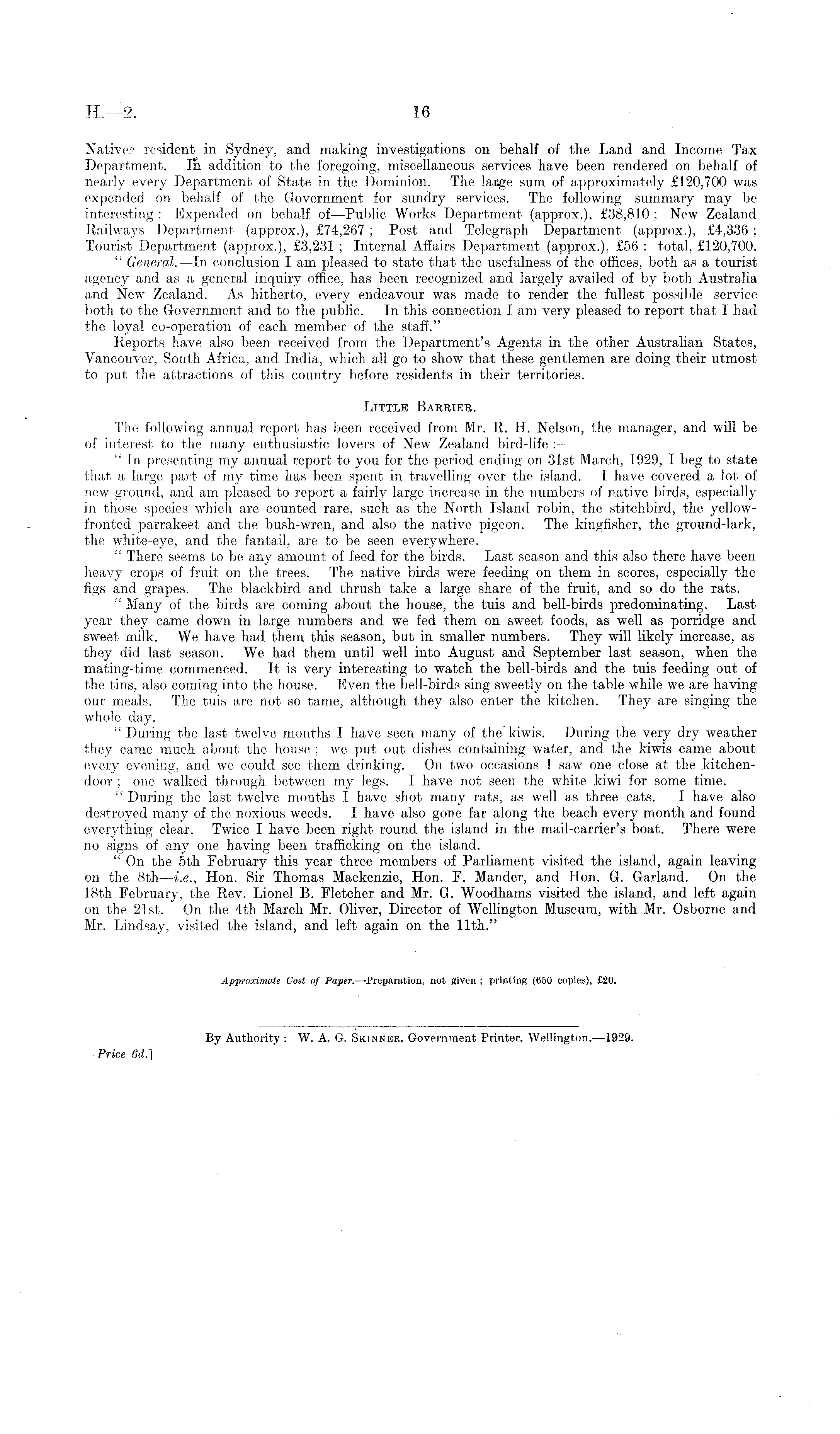 Natives resident in Sydney, and making investigations on behalf of the Land and Income Tax Department. In addition to the foregoing, miscellaneous services have been rendered on behalf of nearly every Department of State in the Dominion. The lasge sum of approximately £120,700 was expended on behalf of the Government for sundry services. The following summary may be interesting : Expended on behalf of—Public Works Department (approx.), £38,810 ; New Zealand Railways Department (approx.), £74,267 ; Post and Telegraph Department (approx.), £4,336 ; Tourist Department (approx.), £3,231 ; Internal Affairs Department (approx.), £56 : total, £120,700. " General.—ln conclusion I am pleased to state that the usefulness of the offices, both as a tourist agency and as a general inquiry office, has been recognized and largely availed of by both Australia and New Zealand. As hitherto, every endeavour was made to render the fullest possible service both to the Government and to the public. In this connection lam very pleased to report that I had the loyal co-operation of each member of the staff." Reports have also been received from the Department's Agents in the other Australian States, Vancouver, South Africa, and India, which all go to show that these gentlemen are doing their utmost to put the attractions of this country before residents in their territories. Little Babrier. The following annual report has been received from Mr. R. H. Nelson, the manager, and will be of interest to the many enthusiastic lovers of New Zealand bird-life : — " In presenting my annual report to you for the period ending on 31st March, 1929, I beg to state that a large part of my time has been spent in travelling over the island. I have covered a lot of new ground, and am pleased to report a fairly large increase in the numbers of native birds, especially in those species which are counted rare, such as the North Island robin, the stitchbird, the yellowfronted parrakeet and the bush-wren, and also the native pigeon. The kingfisher, the ground-lark, the white-eye, and the fantail, are to be seen everywhere. " There seems to be any amount of feed for the birds. Last season and this also there have been heavy crops of fruit on the trees. The native birds were feeding on them in scores, especially the figs and grapes. The blackbird and thrush take a large share of the fruit, and so do the rats. " Many of the birds are coming about the house, the tuis and bell-birds predominating. Last year they came down in large numbers and we fed them on sweet foods, as well as porridge and sweet milk. We have had them this season, but in smaller numbers. They will likely increase, as they did last season. We had them until well into August and September last season, when the mating-time commenced. It is very interesting to watch the bell-birds and the tuis feeding out of the tins, also coming into the house. Even the bell-birds sing sweetly on the table while we are having our meals. The tuis are not so tame, although they also enter the kitchen. They are singing the whole day. " During the last twelve months I have seen many of the kiwis. During the very dry weather they came much about the house ; we put out dishes containing water, and the kiwis came about every evening, and we could see them drinking. On two occasions I saw one close at the kitchendoor ; one walked through between my legs. I have not seen the white kiwi for some time. " During the last twelve months I have shot many rats, as well as three cats. I have also destroyed many of the noxious weeds. I have also gone far along the beach every month and found everything clear. Twice I have been right round the island in the mail-carrier's boat. There were no signs of any one having been trafficking on the island. " On the sth February this year three members of Parliament visited the island, again leaving on the Bth—i.e., Hon. Sir Thomas Mackenzie, Hon. F. Mander, and Hon. G. Garland. On the 18th February, the Rev. Lionel B. Fletcher and Mr. G. Woodhams visited the island, and left again on the 21st. On the 4th March Mr. Oliver, Director of Wellington Museum, with Mr. Osborne and Mr. Lindsay, visited the island, and left again on the 11th."