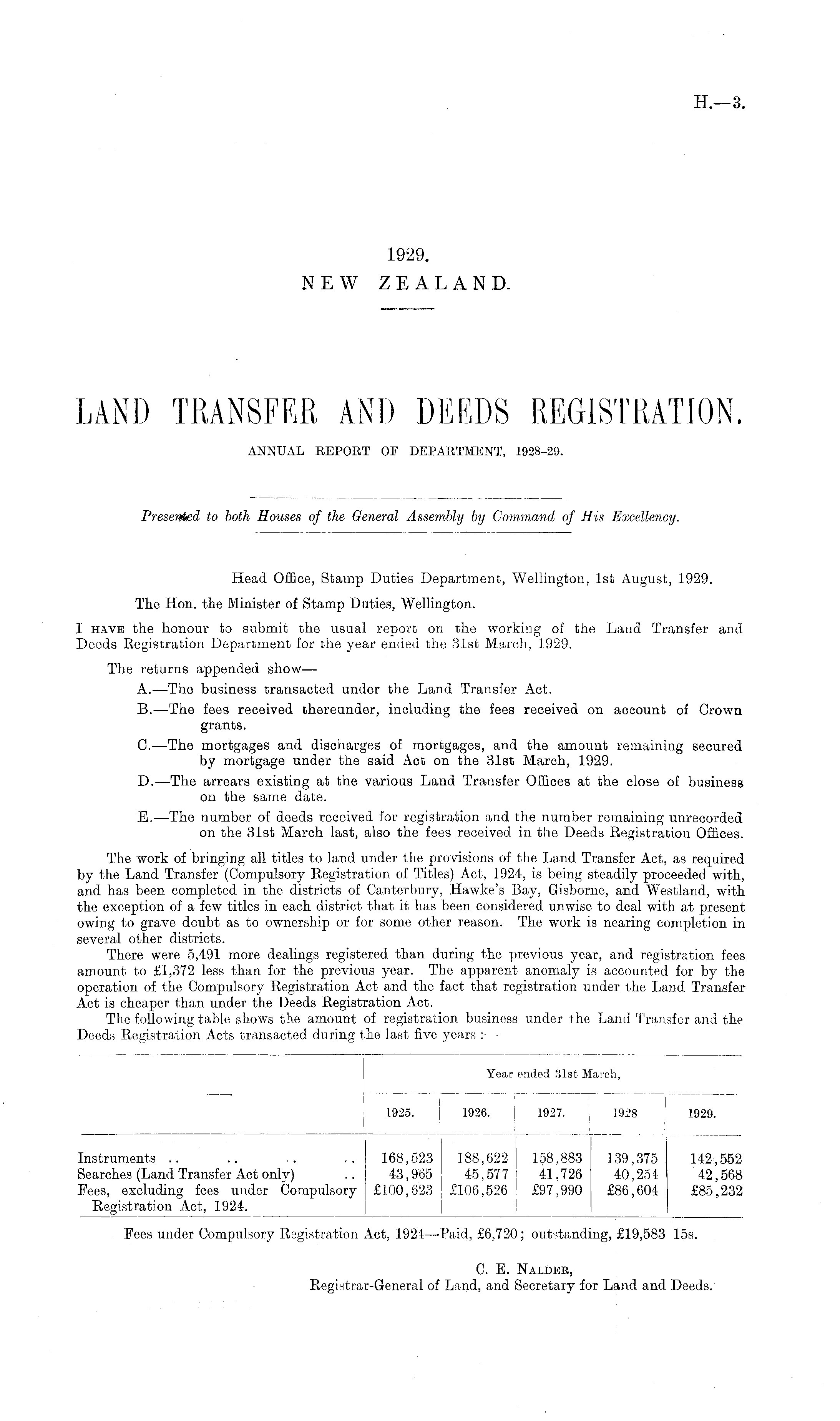 Head Office, Stamp Duties Department, Wellington, Ist August, 1929. The Hon. the Minister of Stamp Duties, Wellington. I have the honour to submit the usual report on the working of the Land Transfer and Deeds Registration Department for the year ended the 31st March, 1929. The returns appended show— A.—The business transacted under the Land Transfer Act. B.—The fees received thereunder, including the fees received on account of Grown grants. G. —The mortgages and discharges of mortgages, and the amount remaining secured by mortgage under the said Act on the 31st March, 1929. D.—The arrears existing at the various Land Transfer Offices at the close of business on the same date. E.—The number of deeds received for registration and the number remaining unrecorded on the 31st March last, also the fees received in the Deeds Registration Offices. The work of bringing all titles to land under the provisions of the Land Transfer Act, as required by the Land Transfer (Compulsory Registration of Titles) Act, 1924, is being steadily proceeded with, and has been completed in the districts of Canterbury, Hawke's Bay, Gisborne, and Westland, with the exception of a few titles in each district that it has been considered unwise to deal with at present owing to grave doubt as to ownership or for some other reason. The work is nearing completion in several other districts. There were 5,491 more dealings registered than during the previous year, and registration fees amount to £1,372 less than for the previous year. The apparent anomaly is accounted for by the operation of the Compulsory Registration Act and the fact that registration under the Land Transfer Act is cheaper than under the Deeds Registration Act. The following table shows the amount of registration business under the Land Transfer and the Deeds Registration Acts transacted during the last five years : —