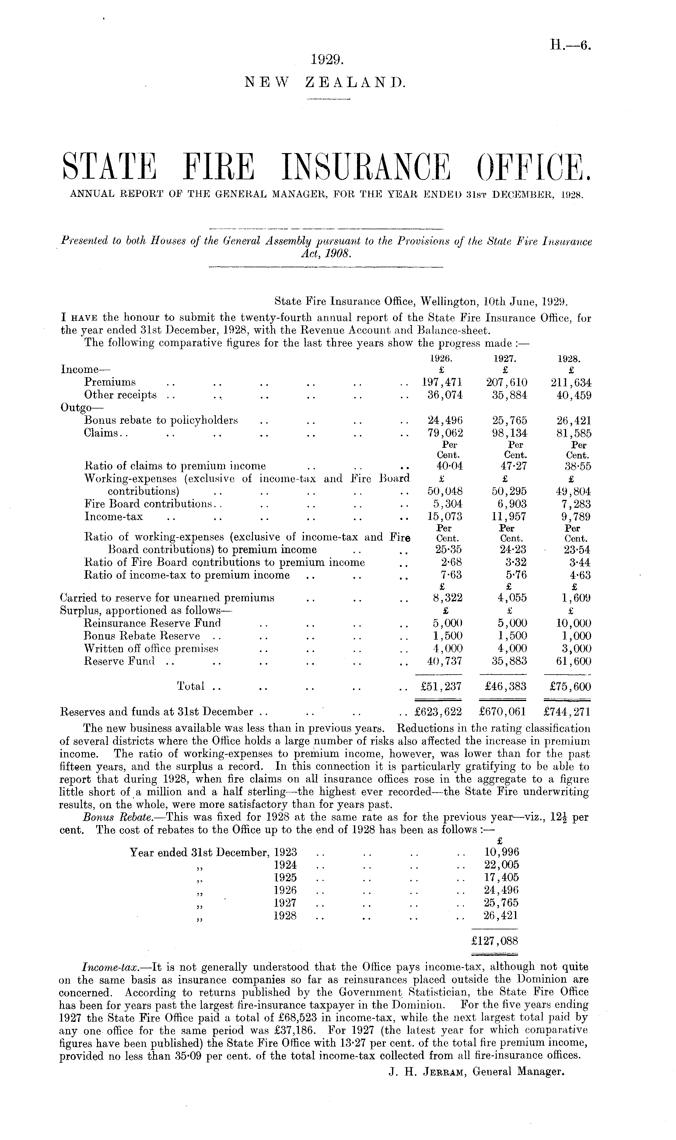 State Fire Insurance Office, Wellington, 10th June, 1929. I have the honour to submit the twenty-fourth annual report of the State Fire Insurance Office, for the year ended 31st December, 1928, with the Revenue Account and Balance-sheet. The following comparative figures for the last three years show the progress made : — 1926. 1927. 1928. Income — £ £ £ Premiums .. .. .. .. .. .. 197,471 207,610 211,634 Other receipts .. ... .. .. .. .. 36,074 35,884 40,459 Outgo — Bonus rebate to policyholders .. .. .. .. 24,496 25,765 26,421 Claims.. .. .. .. .. .. .. 79,062 98,134 81,585 Per Per Per Cent. Cent. Cent. Ratio of claims to premium income .. . . .. 40-04 47-27 38-55 Working-expenses (exclusive of income-tax and Fire Board £ £ £ contributions) .. .. .. .. .. 50,048 50,295 49,804 Fire Board contributions.. .. .. .. .. 5,304 6,903 7,283 Income-tax .. .. .. .. .. .. 15,073 11,957 9,789 Per Per Per Ratio of working-expenses (exclusive of income-tax and Fire Cent. Cent. Cent. Board contributions) to premium income .. .. 25-35 24-23 23-54 Ratio of Fire Board contributions to premium income .. 2-68 3-32 3-44 Ratio of income-tax to premium income .. .. .. 7-63 5-76 4-63 £ £ £ Carried to reserve for unearned premiums .. .. .. 8,322 4,055 1,609 Surplus, apportioned as follows — £ £ £ Reinsurance Reserve Fund .. .. .. .. 5,000 5,000 10,000 Bonus Rebate Reserve .. .. .. .. .. 1,500 1,500 1,000 Written off office premises .. .. .. .. 4,000 4,000 3,000 Reserve Fund .. .. .. .. .. .. 40,737 35,883 61,600 Total .. .. .. .. .. £51,237 £46,383 £75,600 Reserves and funds at 31st December .. .. .. .. £623,622 £670,061 £744,271 The new business available was less than in previous years. Reductions in the rating classification of several districts whsre the Office holds a large number of risks also affected the increase in premium income. The ratio of working-expenses to premium income, however, was lower than for the past fifteen years, and the surplus a record. In this connection it is particularly gratifying to be able to report that during 1928, when fire claims on all insurance offices rose in the aggregate to a figure little short of a million and a half sterling —the highest ever recorded —the State Fire underwriting results, on the whole, were more satisfactory than for years past. Bonus Rebate. —This was fixed for 1928 at the same rate as for the previous year —viz., 12J per cent. The cost of rebates to the Office up to the end of 1928 has been as follows : — £ Year ended 31st December, 1923 .. .. .. .. 10,996 1924 .. .. .. .. 22,005 1925 .. .. .. .. 17,405 1926 .. .. .. .. 24,496 1927 .. .. .. .. 25,765 1928 .. .. .. .. 26,421 £127,088 Income-tax.—-It is not generally understood that the Office pays income-tax, although not quite on the same basis as insurance companies so far as reinsurances placed outside the Dominion are concerned. According to returns published by the Government Statistician, the State Fire Office has been for years past the largest fire-insurance taxpayer in the Dominion. For the five years ending 1927 the State Fire Office paid a total of £68,523 in income-tax, while the next largest total paid by any one office for the same period was £37,186. For 1927 (the latest year for which comparative figures have been published) the State Fire Office with 13-27 per cent, of the total fire premium income, provided no less than 35-09 per cent, of the total income-tax collected from all fire-insurance offices. J. H. Jerram, General Manager.