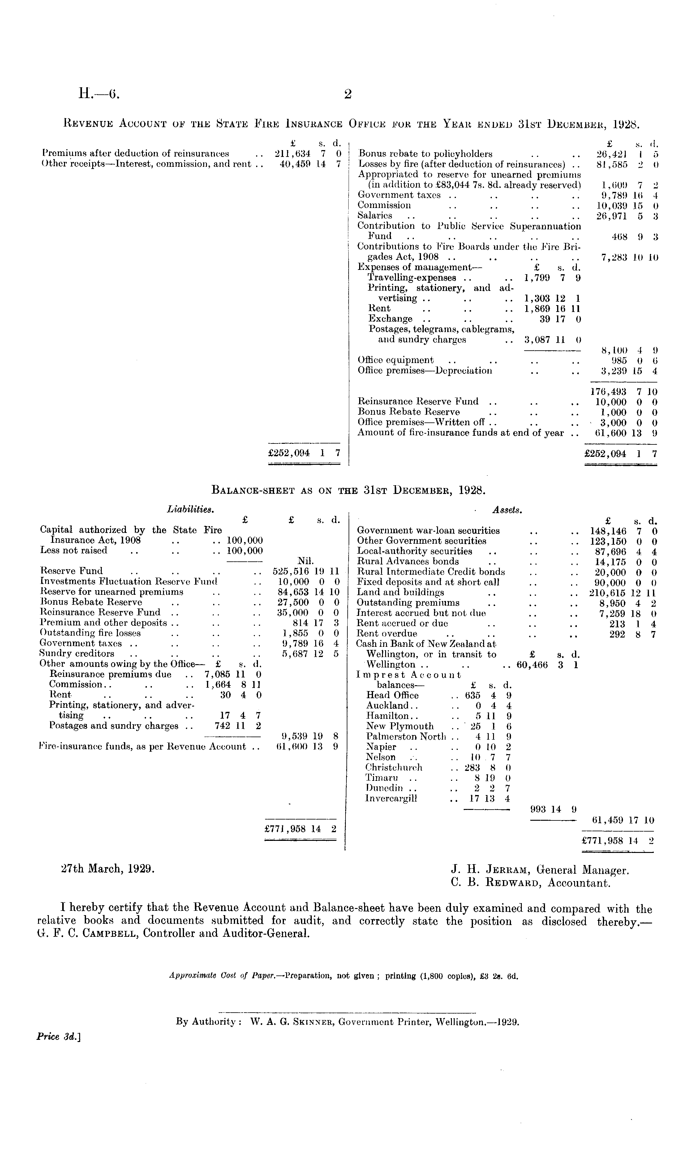 Revenue Account of the State Fiee Insurance Office for the Year ended 31st December, 1928. £ s. d. £ s. d. Premiums after deduction of reinsurances .. 211,634 7 0 Bonus rebate to policyholders .. .. 26,421 1 5 Other receipts—lnterest, commission, and rent .. 40,459 14 7 Losses by fire (after deduction of reinsurances) .. 81,585 2 0 Appropriated to reserve for unearned premiums (in addition to £83,044 7s. Bd. already reserved) 1,609 7 2 Government taxes .. .. .. .. 9,789 16 4 Commission .. .. .. .. 10,039 15 0 Salaries .. .. .. .. .. 26,971 5 3 Contribution to Public Service Superannuation Fund .. .. .. .. .. 468 9 3 Contributions to Fire Boards under the Fire Brigades Act, 1908 .. .. .. .. 7,283 10 10 Expenses of management— £ s. d. Travelling-expenses .. .. 1,799 7 9 Printing, stationery, and advertising .. .. .. 1,303 12 1 Rent .. .. .. 1,869 16 11 Exchange .. .. .. 39 17 0 Postages, telegrams, cablegrams, and sundry charges .. 3,087 11 0 8,100 4 9 Office equipment .. .. .. .. 985 0 6 Office premises—Depreciation .. .. 3,239 15 4 176,493 7 10 Reinsurance Reserve Fund .. .. .. 10,000 0 0 Bonus Rebate Reserve .. .. .. 1,000 0 0 Office premises—Written off .. .. .. 3,000 0 0 Amount of fire-insurance funds at end of year .. 61,600 13 9 £252,094 1 7 £252,094 1 7 Balance-sheet as on the 31st December, 1928. Liabilities. Assets. £ £ s. d. £ s. d. Capital authorized by the State Fire Government war-loan securities .. .. 148,146 7 0 Insurance Act, 1908 .. .. 100,000 Other Government securities .. .. 123,150 0 0 Less not raised .. .. .. 100,000 Local-authority securities .. .. .. 87,696 4 4 Nil. Rural Advances bonds .. .. .. 14,175 0 0 Reserve Fund .. .. .. .. 525,516 19 11 Rural Intermediate Credit bonds .. .. 20,000 0 0 Investments Fluctuation Reserve Fund .. 10,000 0 0 Fixed deposits and at short call .. .. 90,000 0 0 Reserve for unearned premiums .. .. 84,653 14 10 Land and buildings .. .. .. 210,615 12 11 Bonus Rebate Reserve .. .. .. 27,500 0 0 Outstanding premiums .. .. .. 8,950 4 2 Reinsurance Reserve Fund .. .. .. 35,000 0 0 Interest accrued but not due .. .. 7,259 18 0 Premium and other deposits .. .. .. 814 17 3 Rent accrued or due .. .. .. 213 1 4 Outstanding fire losses .. .. .. 1,855 0 0 Rent overdue .. .. .. .. 292 8 7 Government taxes .. .. .. .. 9,789 16 4 Cash in Bank of New Zealand at Sundry creditors .. .. .. .. 5,687 12 5 Wellington, or in transit to £ s. d. Other amounts owing by the Office— £ s. d. Wellington .. .. .. 60,466 3 1 Reinsurance premiums due .. 7,085 11 0 Imprest Account Commission.. .. .. 1,664 811 balances — £ s. d. Rent .. .. .. 30 4 0 Head Office .. 635 4 9 Printing, stationery, and adver- Auckland.. .. 0 4 4 tising .. .. .. 17 4 7 Hamilton.. .. 511 9 Postages and sundry charges .. 742 11 2 New Plymouth .. 25 1 6 9,539 19 8 Palmerston North .. 411 9 Fire-insurance funds, as per Revenue Account .. 61,600 13 9 Napier .. .. 010 2 Nelson .. .. 10,7 7 Christchurch .. 283 8 0 Timaru .. .. 8 19 0 Dunedin .. .. 2 2 7 Invercargill .. 17 13 4 993 14 9 61,459 17 10 £771,958 14 2 — £771,958 14 2 27th March, 1929. J. H. Jerram, General Manager. C. B. Redward, Accountant. I hereby certify that the Revenue Account and Balance-sheet have been duly examined and compared with the relative books and documents submitted for audit, and correctly state the position as disclosed thereby.— 6. F. C. Campbell, Controller and Auditor-General.
