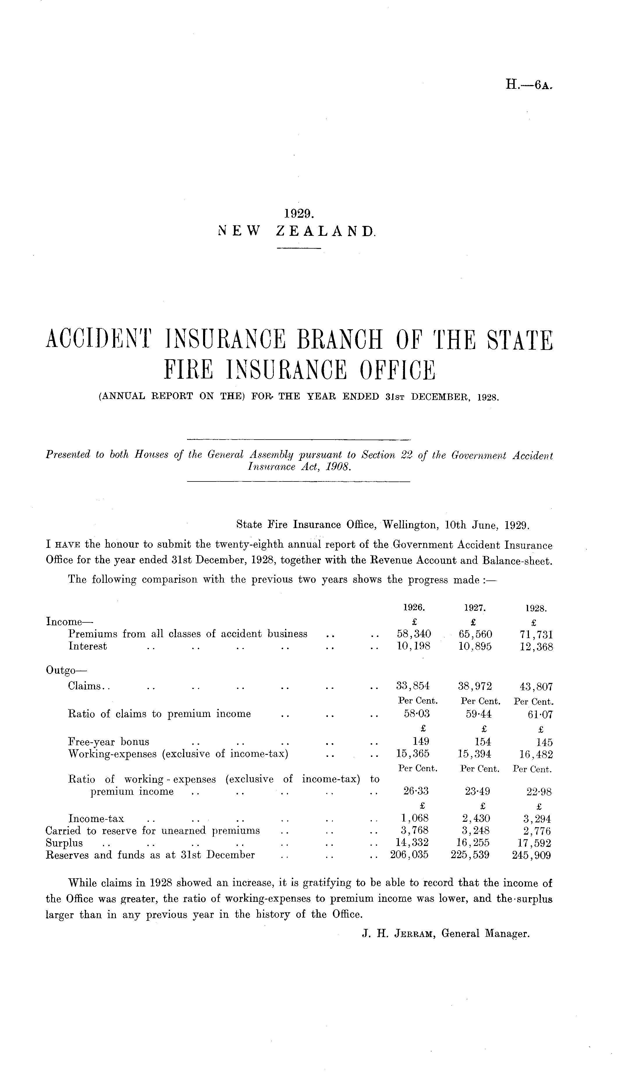 State Fire Insurance Office, Wellington, 10th June, 1929. I have the honour to submit the twenty-eighth annual report of the Government Accident Insurance Office for the year ended 31st December, 1928, together with the Revenue Account and Balance-sheet. The following comparison with the previous two years shows the progress made :— 1926. 1927. 1928. Income— £ £ £ Premiums from all classes of accident business .. .. 58,340 65,560 71,731 Interest .. .. .. .. .. .. 10,198 10,895 12,368 Outgo — Claims.. .. .. .. .. .. .. 33,854 38,972 43,807 Per Cent. Per Cent. Per Cent. Ratio of claims to premium income .. .. .. 58-03 59-44 61-07 £ £ £ Free-year bonus .. .. .. .. .. 149 154 145 Working-expenses (exclusive of income-tax) .. .. 15,365 15,394 16,482 Per Cent. Per Cent. Per Cent. Ratio of working - expenses (exclusive of income-tax) to premium income .. .. .. . . .. 26-33 23-49 22-98 £ £ £ Income-tax .. ... .. .. .. .. 1,068 2,430 3,294 Carried to reserve for unearned premiums .. .. .. 3,768 3,248 2,776 Surplus .. .. .. .. .. .. .. 14,332 16,255 17,592 Reserves and funds as at 31st December .. .. .. 206,035 225,539 245,909 While claims in 1928 showed an increase, it is gratifying to be able to record that the income of the Office was greater, the ratio of working-expenses to premium income was lower, and the-surplus larger than in any previous year in the history of the Office. J. H. Jerram, General Manager.