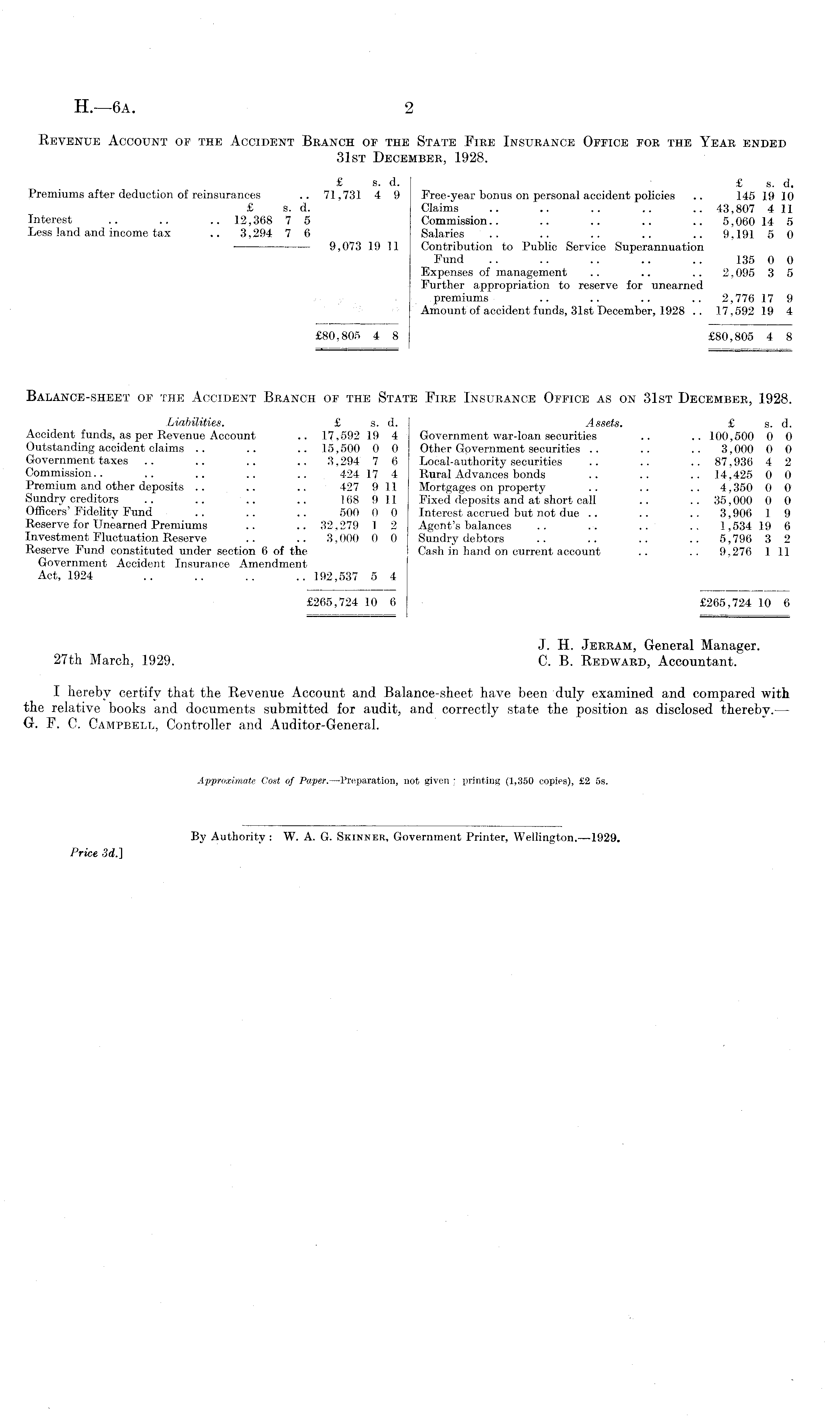 Revenue Account of the Accident Branch op the State Fire Insurance Office for the Year ended 31st December, 1928. £ s. d. £ s. d. Premiums after deduction of reinsurances .. 71,731 4 9 Free-year bonus on personal accident policies .. 145 19 10 £ s. d. Claims .. .. .. .. .. 43,807 4 11 Interest .. .. .. 12,368 7 5 Commission.. .. .. .. .. 5,060 14 5 Less land and income tax .. 3,294 7 6 Salaries .. .. .. .. .. 9,191 5 0 • 9,073 19 11 Contribution to Public Service Superannuation Fund .. .. .. .. .. 135 0 0 Expenses of management .. .. .. 2,095 3 5 Further appropriation to reserve for unearned premiums .. .. .. .. 2,776 17 9 Amount of accident funds, 31st December, 1928 .. 17,592 19 4 £80,805 4 8 £80,805 4 8 Balance-sheet of the Accident Branch of the State Fire Insurance Office as on 31st December, 1928. Liabilities. £ s. d. Assets. £ s. d. Accident funds, as per Revenue Account .. 17,592 19 4 Government war-loan securities .. .. 100,500 0 0 Outstanding accident claims .. .. .. 15,500 0 0 Other Government securities .. .. .. 3,000 0 0 Governnient taxes .. .. .. .. 3,294 7 6 Local-authority securities .. .. .. 87,936 4 2 Commission.. .. .. .. .. 424 17 4 Rural Advances bonds .. .. .. 14,425 0 0 Premium and other deposits .. .. .. 427 9 11 Mortgages on property .. .. .. 4,350 0 0 Sundry creditors .. .. .. .. 168 911 Fixed deposits and at short call .. .. 35,000 0 0 Officers' Fidelity Fund .. .. ~ 500 0 0 Interest accrued but not due .. .. .. 3,906 1 9 Reserve for Unearned Premiums .. .. 32,279 ! 2 Agent's balances .. .. .. .. 1,534 19 6 Investment Fluctuation Reserve .. .. 3,000 0 0 Sundry debtors .. .. .. .. 5,796 3 2 Reserve Fund constituted under section 6of the Cash in hand on current account .. .. 9,276 111 Governnient Accident Insurance Amendment Act, 1924 .. .. .. .. 192,537 5 4 £265,724 10 6 £265,724 10 6 I J. H. Jerram, General Manager. 27th March, 1929. C. B. Redward, Accountant. I hereby certify that the Revenue Account and Balance-sheet have been duly examined and compared with the relative books and documents submitted for audit, and correctly state the position as disclosed thereby. — G. F. C. Campbell, Controller and Auditor-General.